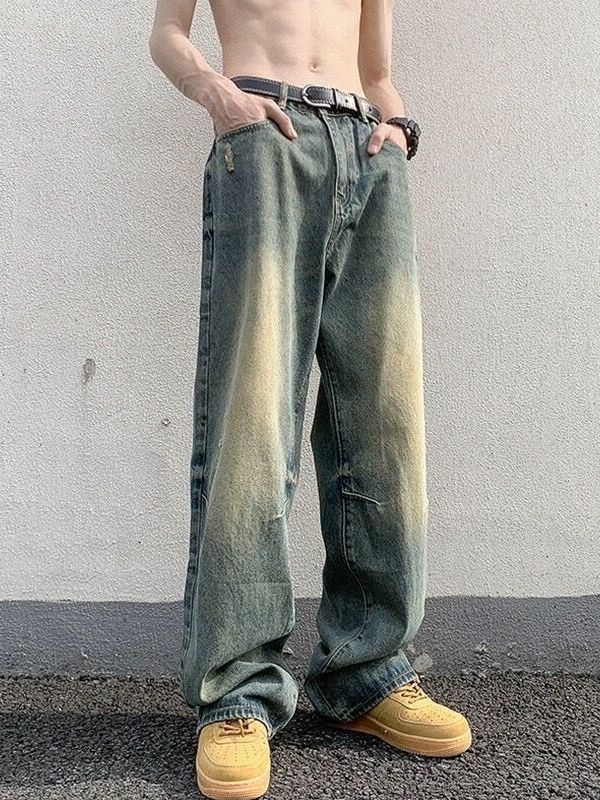 Washed distressed jeans for men American retro spring and autumn loose wide-leg straight-leg floor-length trousers street-style cool pants