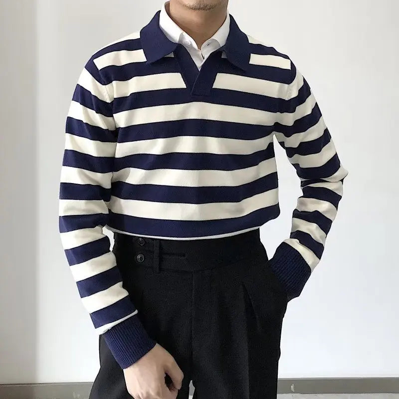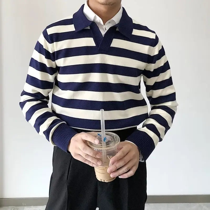 American Chic Striped Men Polo Sweater Luxury Trendy Business V Neck Knit Solid Color Pullover Leisure Slim Long Sleeve Knitwear