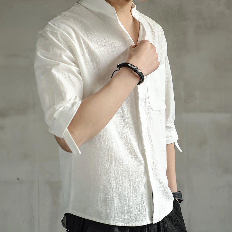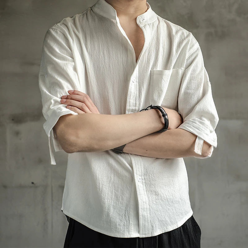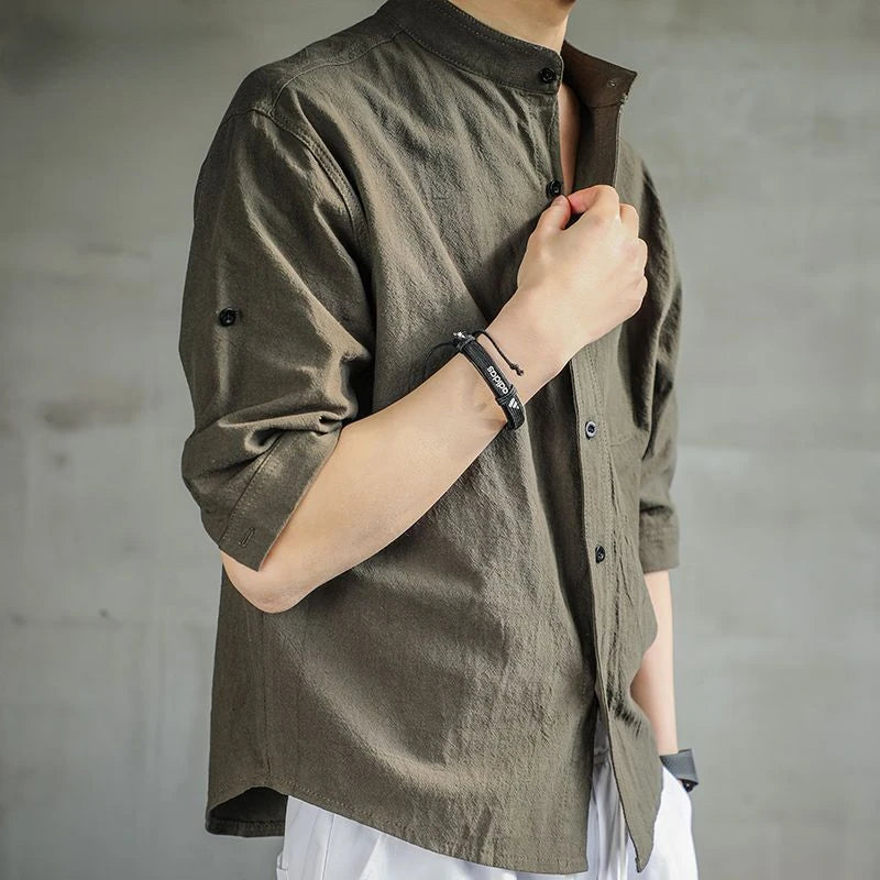 Summer Stand Collar Linen Shirts Man Casual Blouse Three Quarter Sleeve Solid Color Shirt for Men Loose Cotton Linen Shirt M-4XL