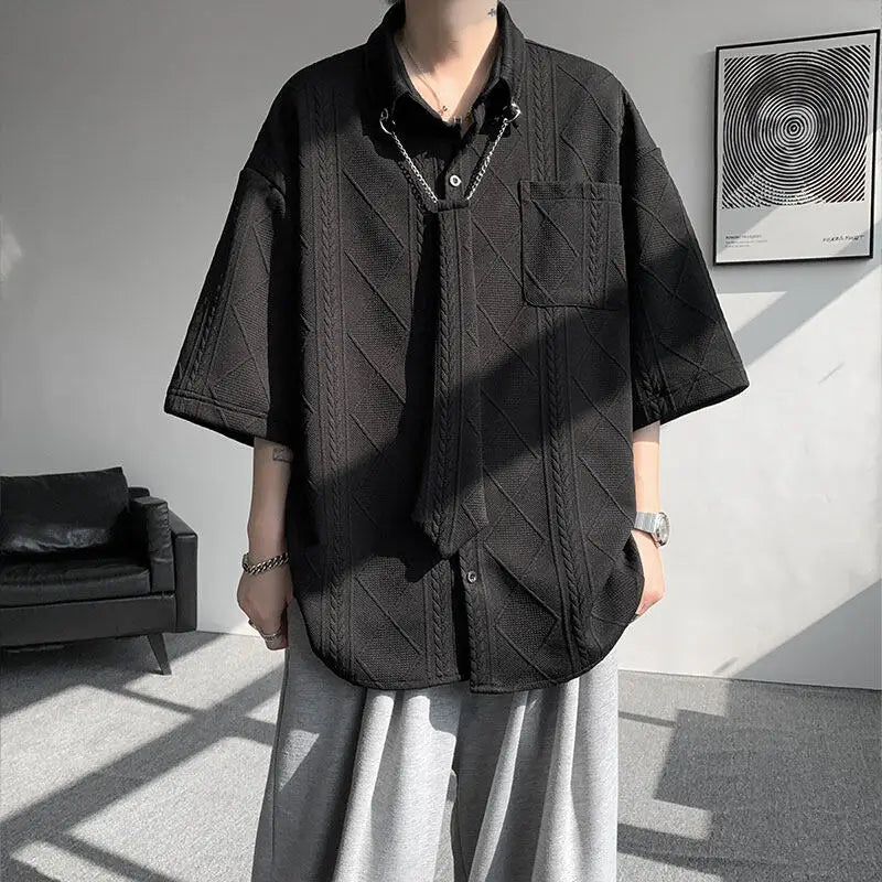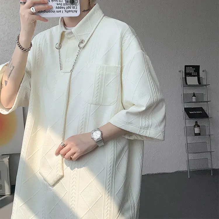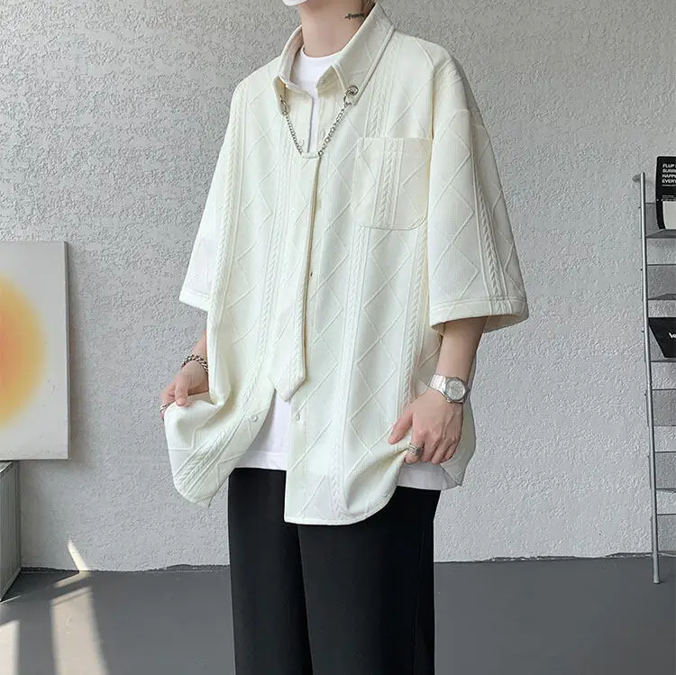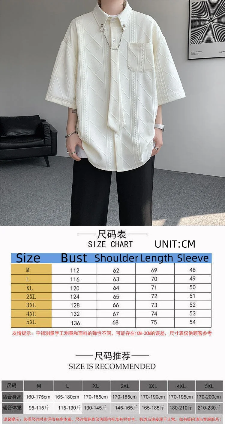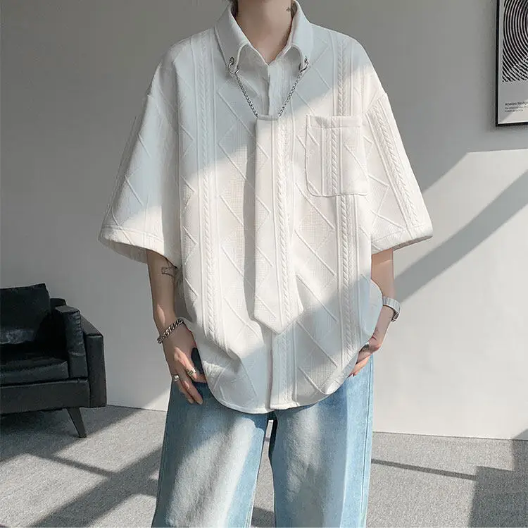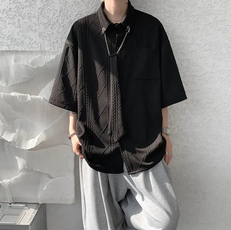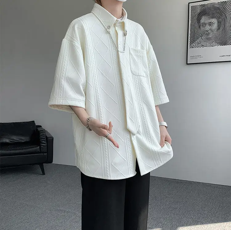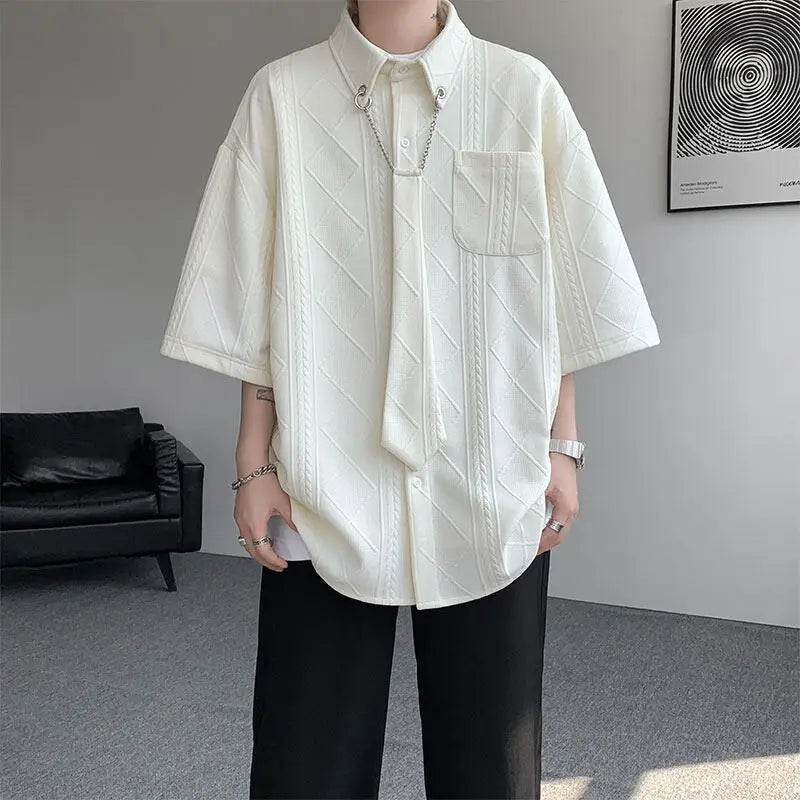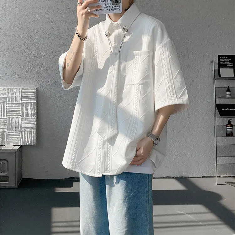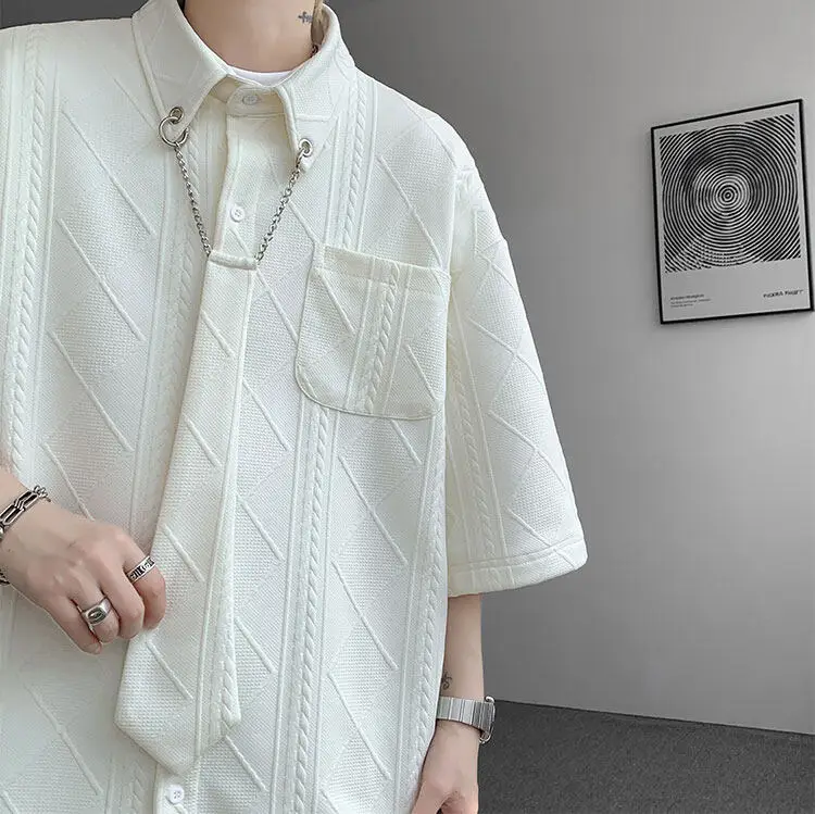 2025 White Texture Short-sleeved Shirts Men Korean Chic All-match Blouses Casual Loose Single Breasted Black Shirt with Tie