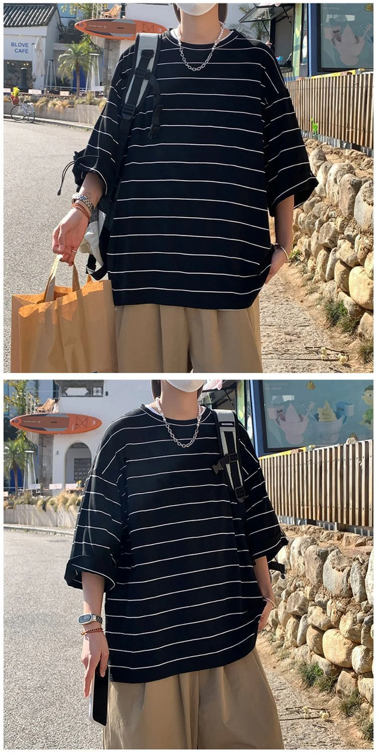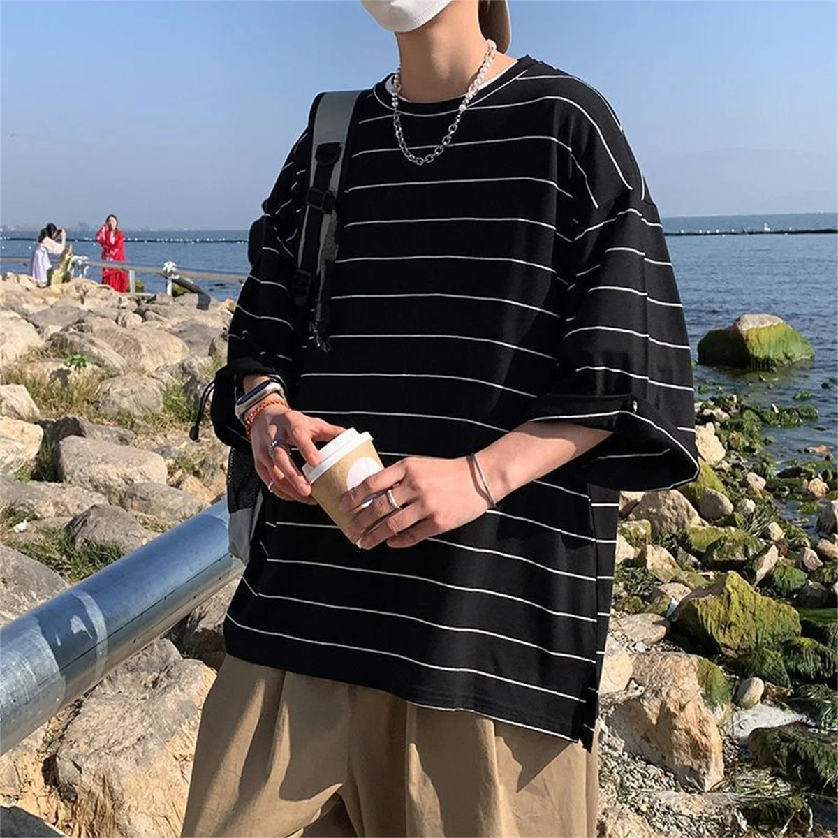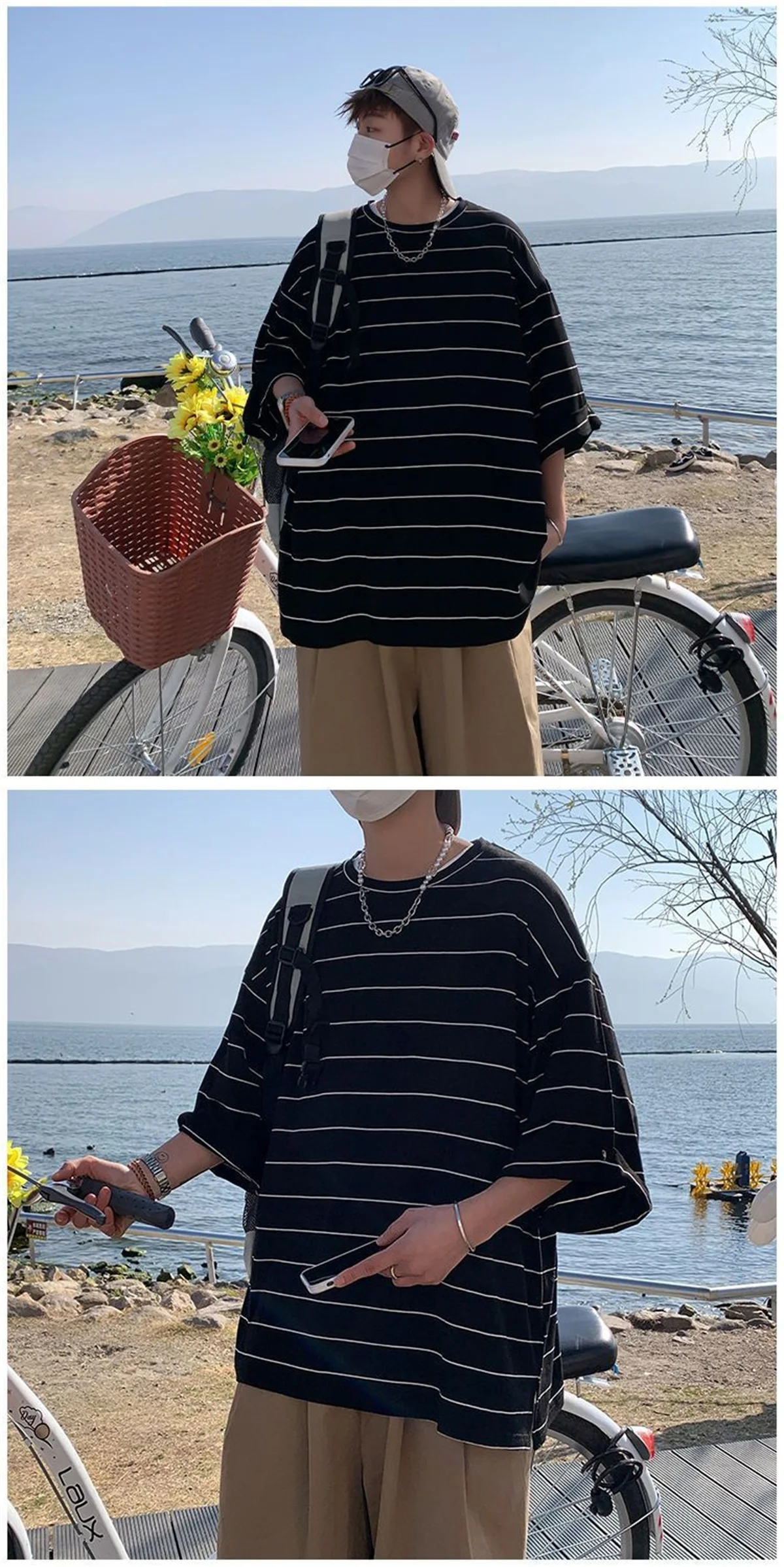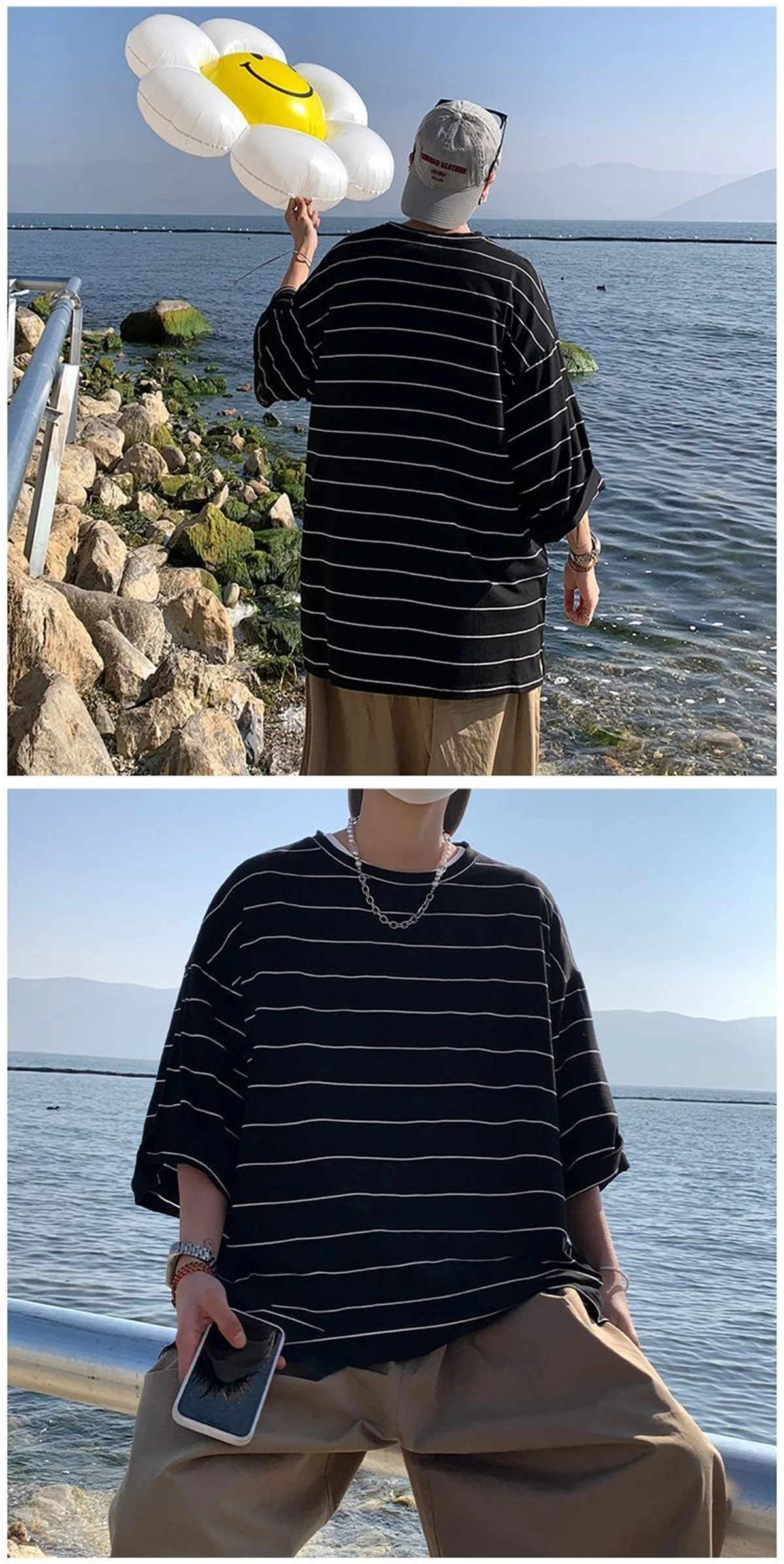 Black Summer Korea T-Shirt Men Funny Harajuku Tshirt Streetwear Femme Striped Japan O-Neck Loose Half Sleeve T Shirts Male