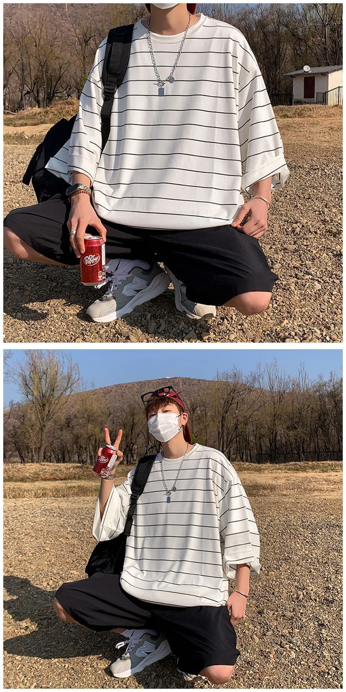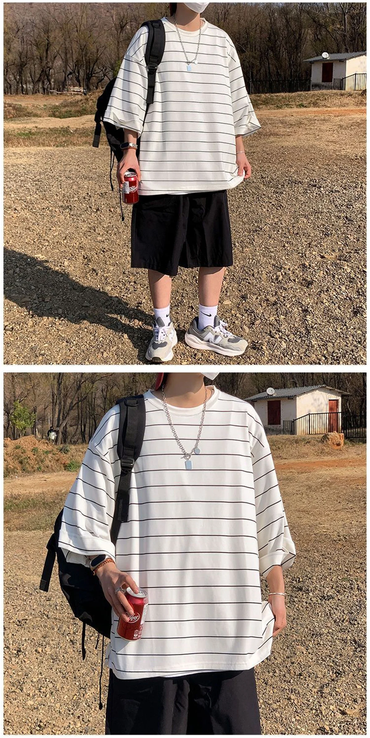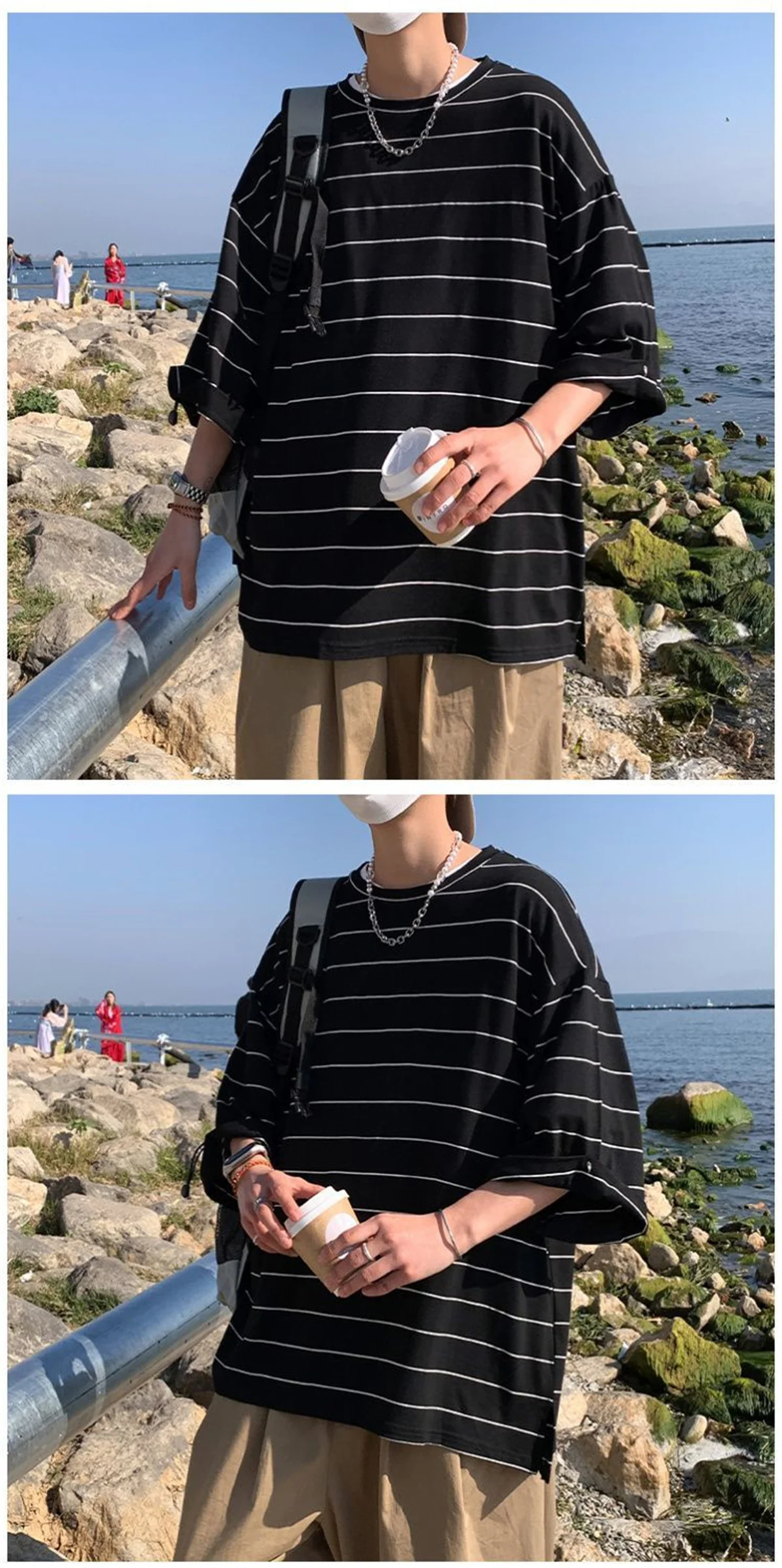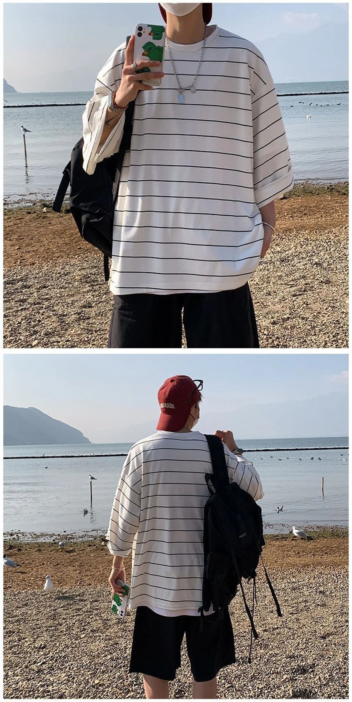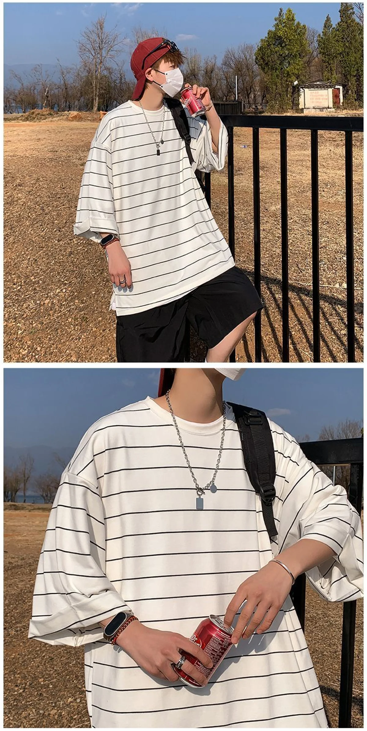 Black Summer Korea T-Shirt Men Funny Harajuku Tshirt Streetwear Femme Striped Japan O-Neck Loose Half Sleeve T Shirts Male