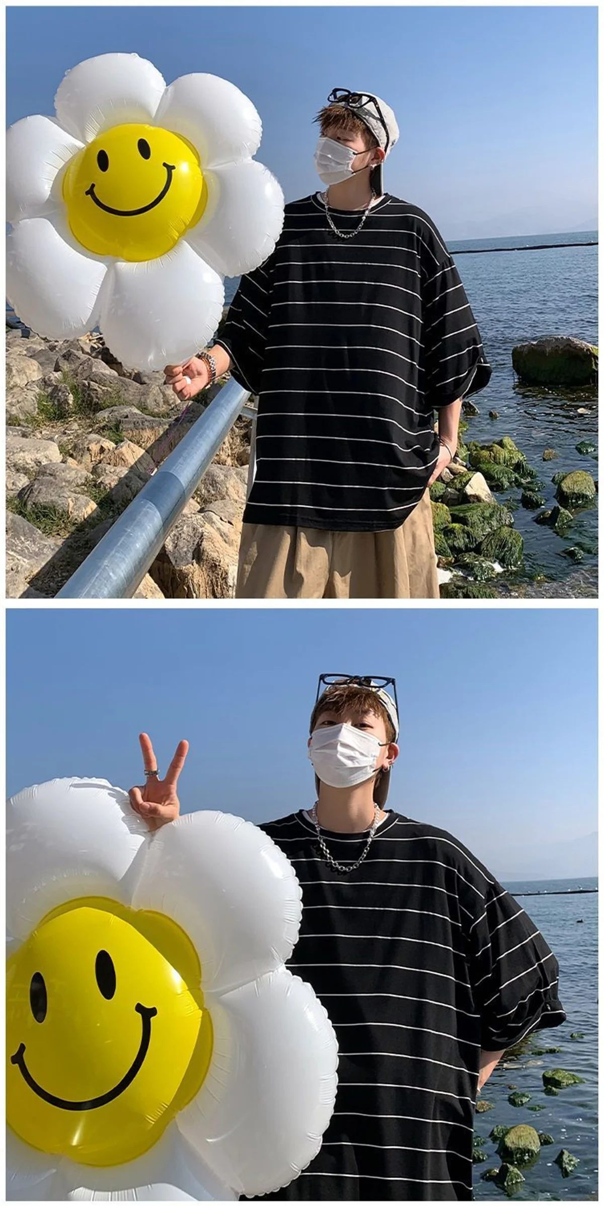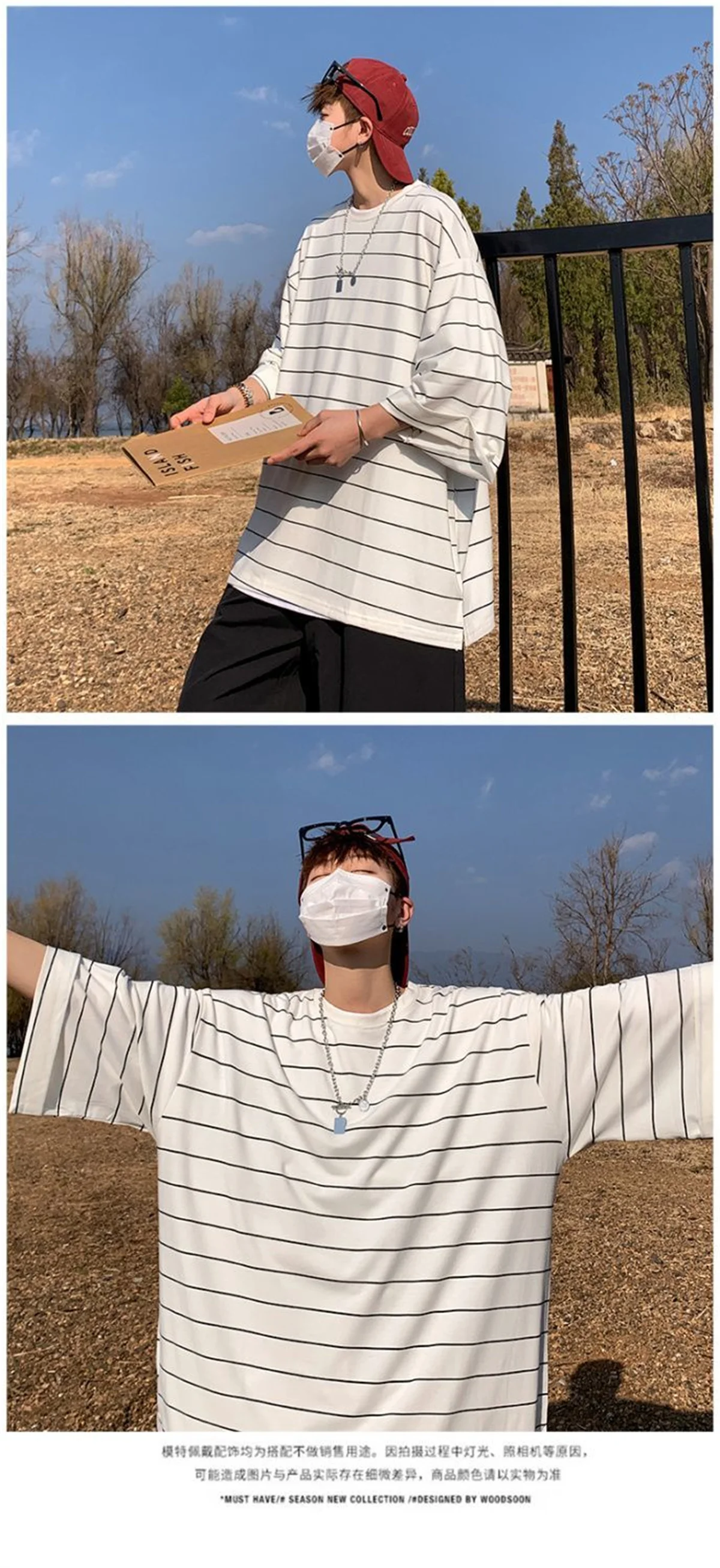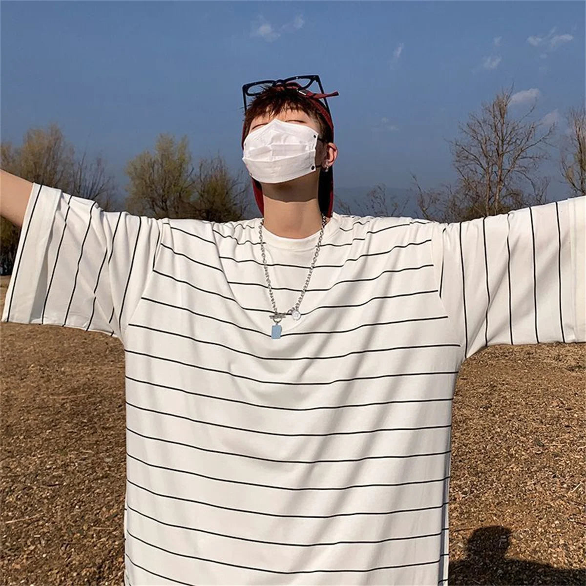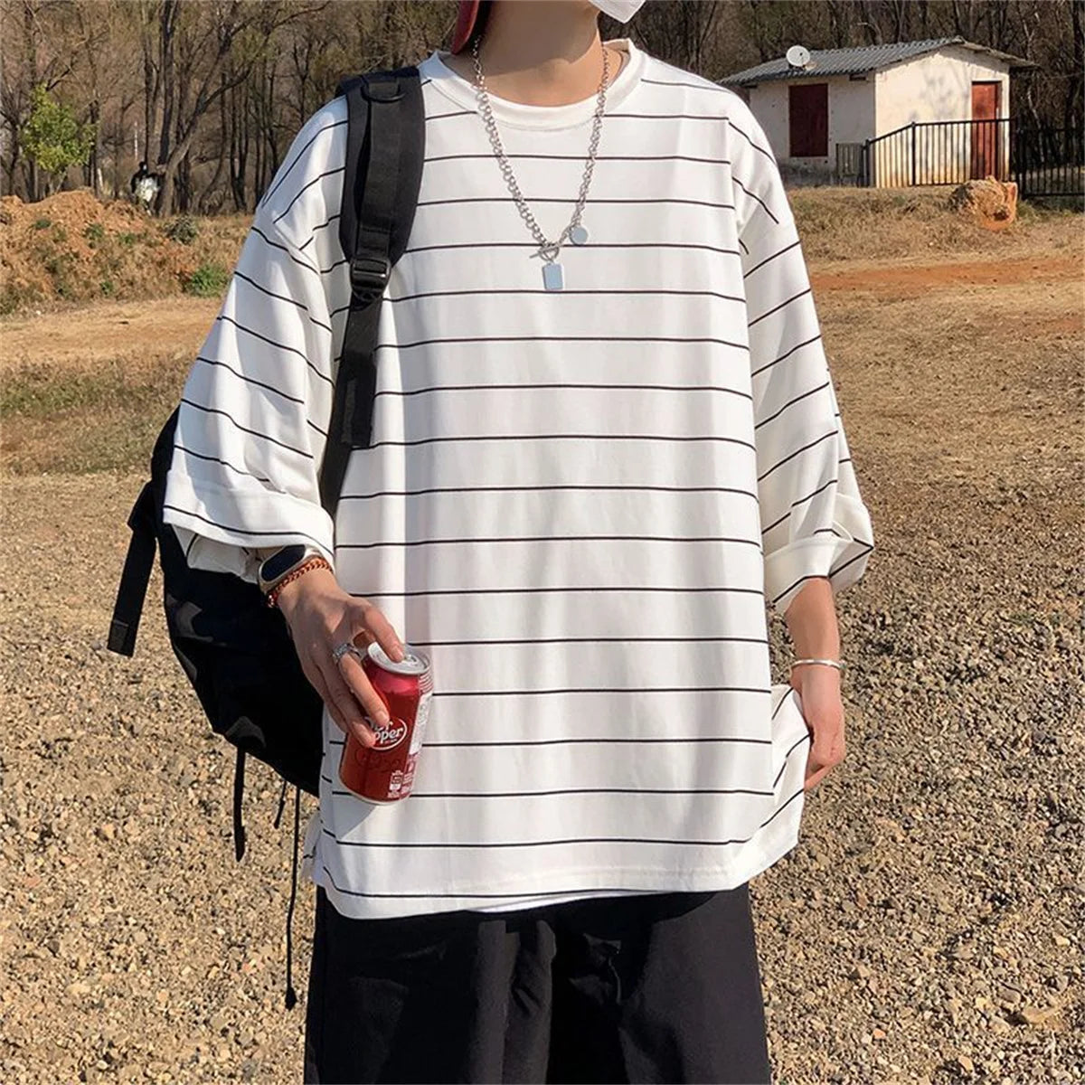 Black Summer Korea T-Shirt Men Funny Harajuku Tshirt Streetwear Femme Striped Japan O-Neck Loose Half Sleeve T Shirts Male