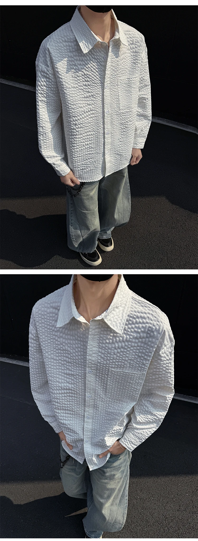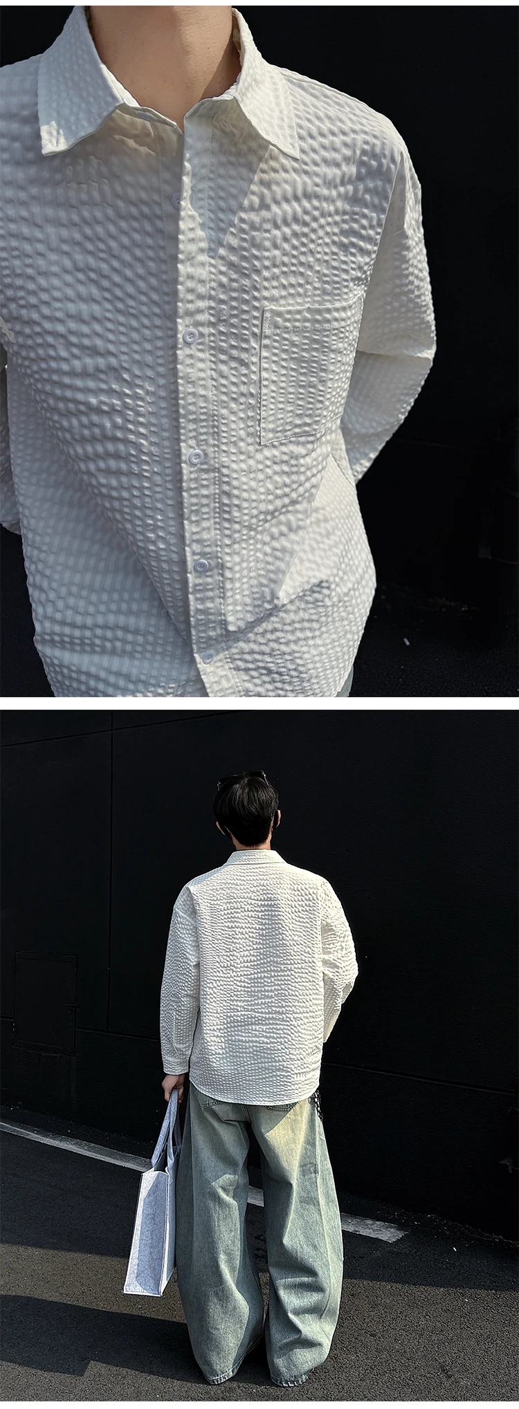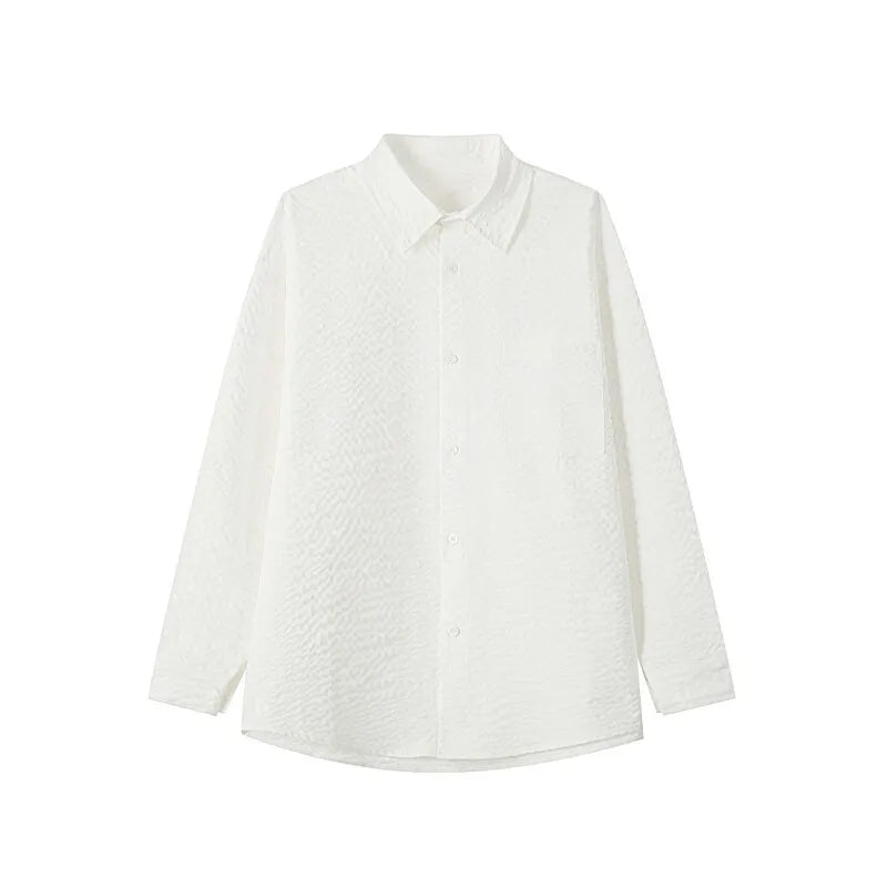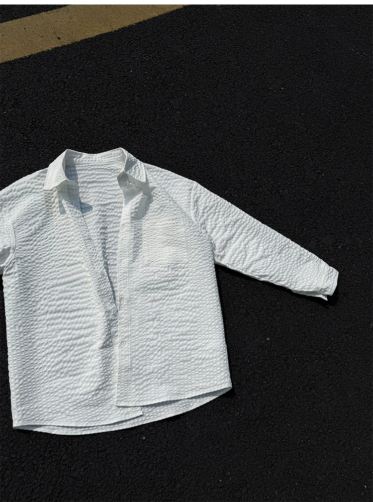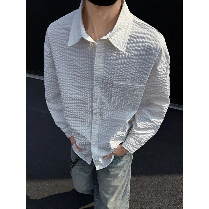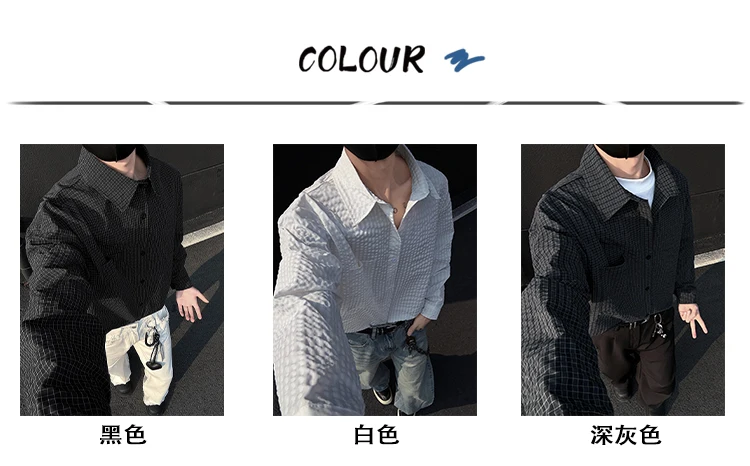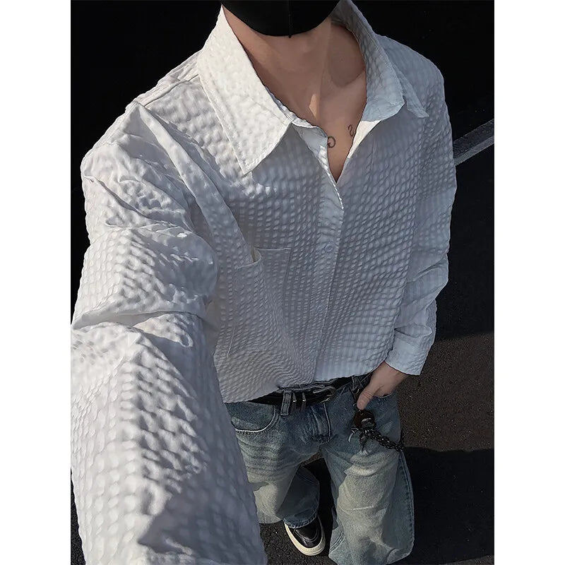 Black White Long-sleeved Shirt Men Fashion Social Mens Dress Shirt Korean Loose Casual bubble Shirts Mens summer trend