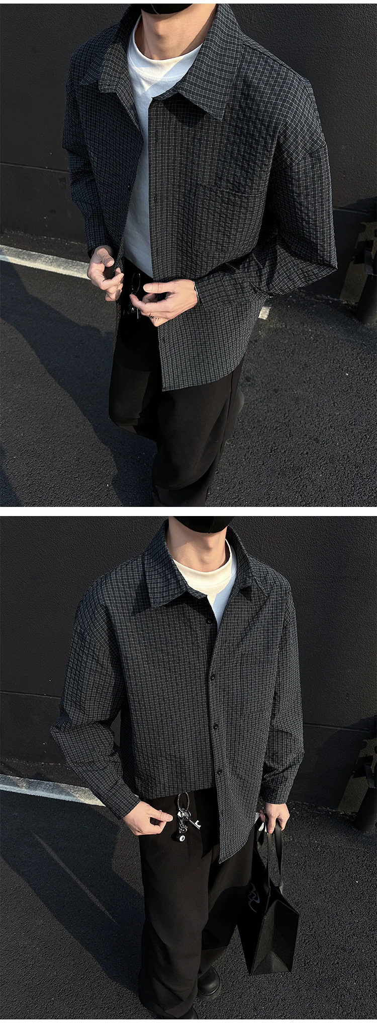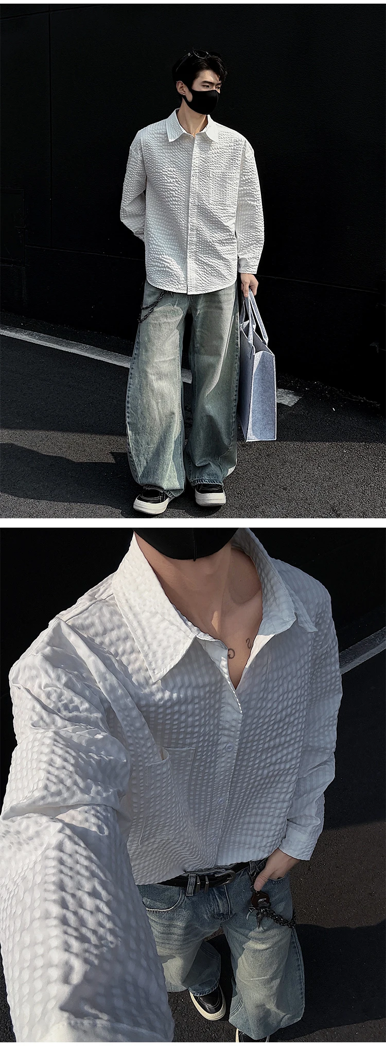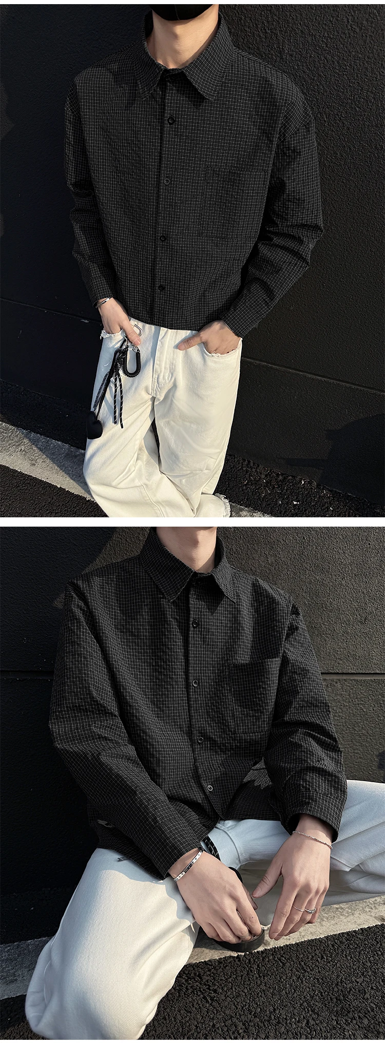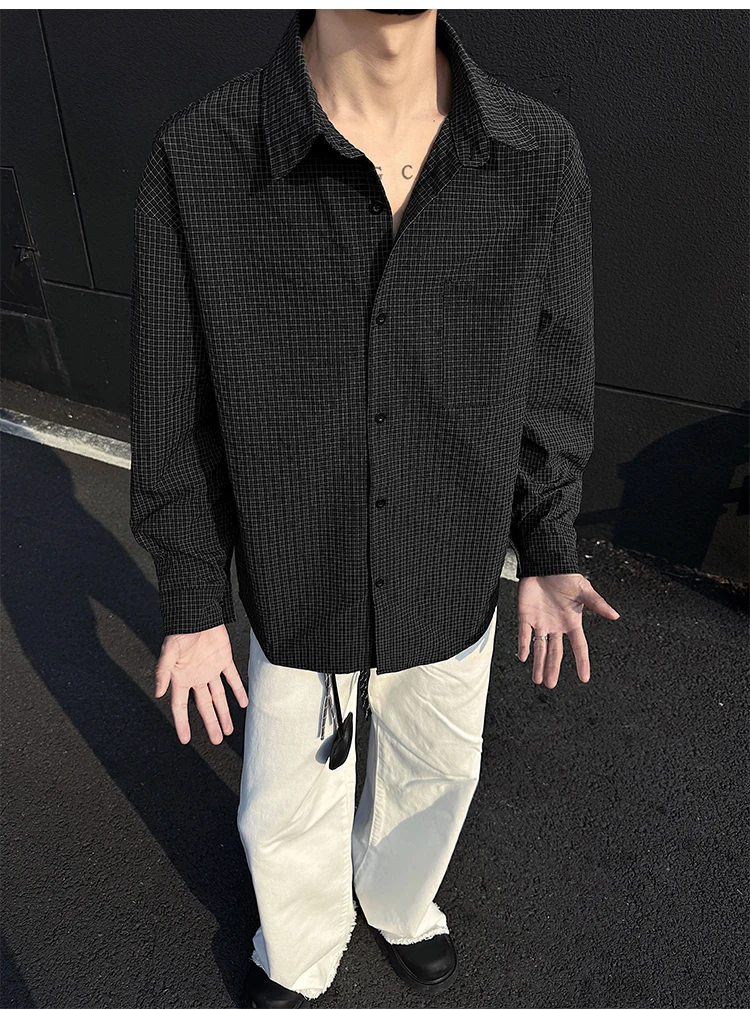 Black White Long-sleeved Shirt Men Fashion Social Mens Dress Shirt Korean Loose Casual bubble Shirts Mens summer trend
