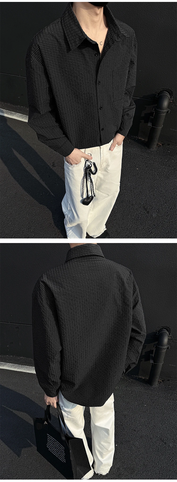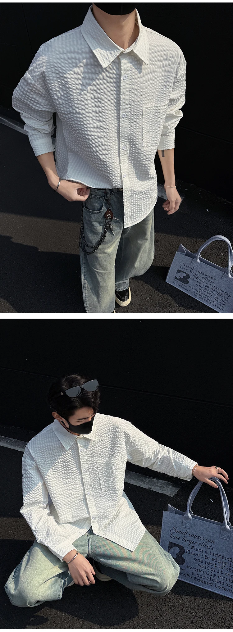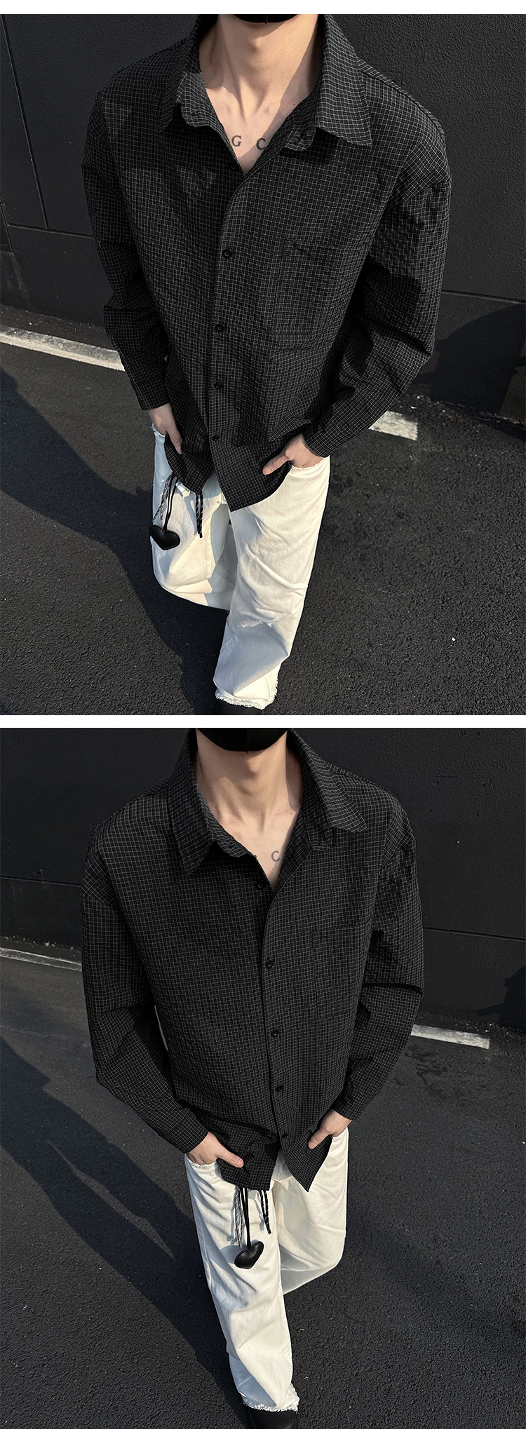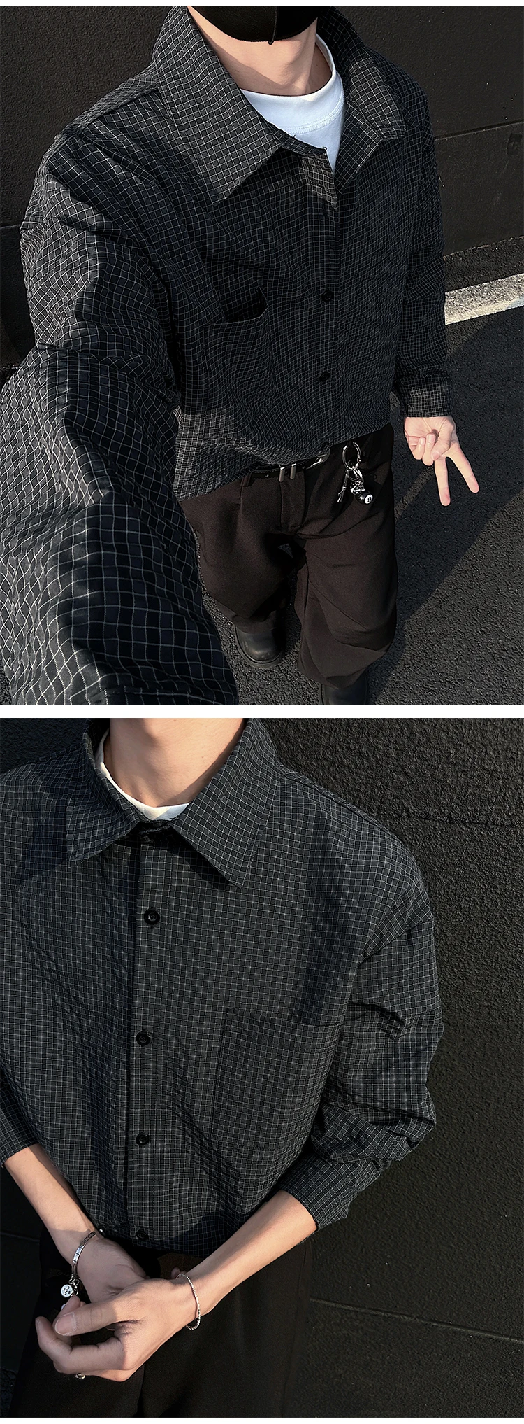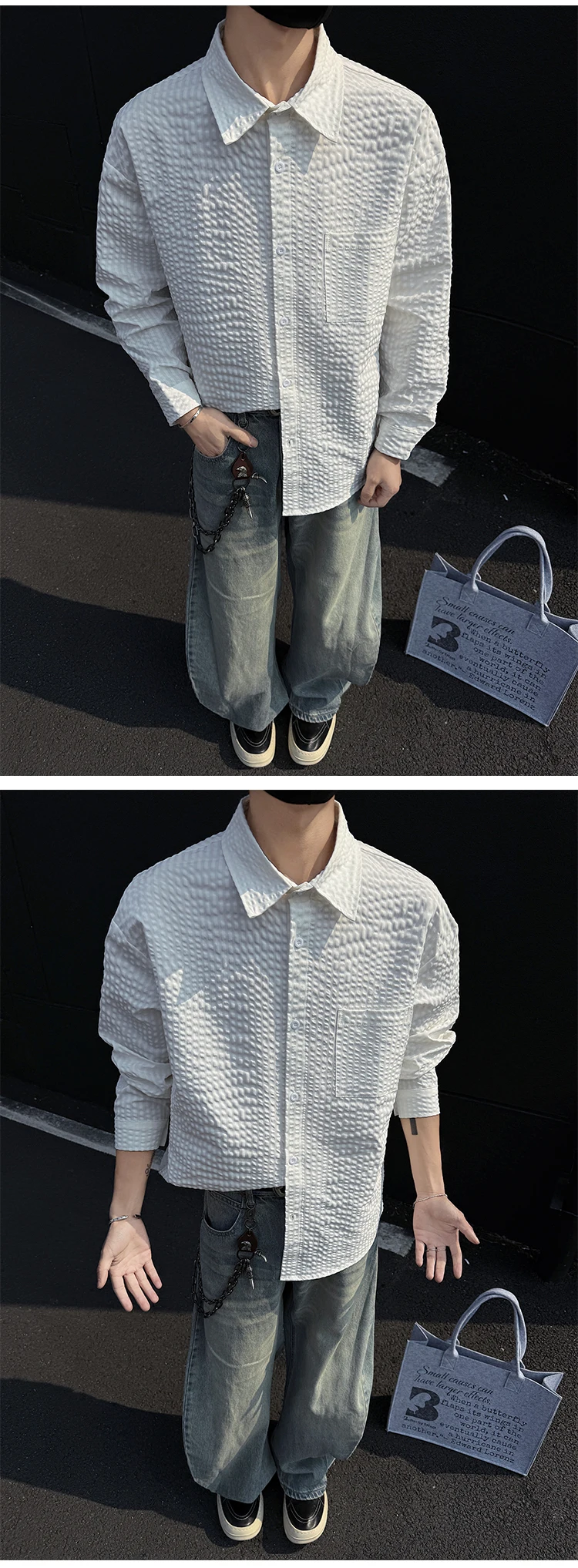 Black White Long-sleeved Shirt Men Fashion Social Mens Dress Shirt Korean Loose Casual bubble Shirts Mens summer trend