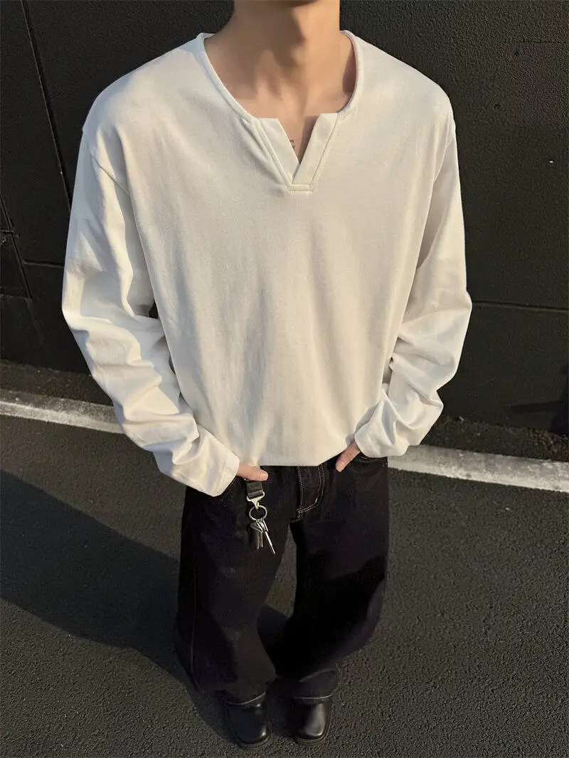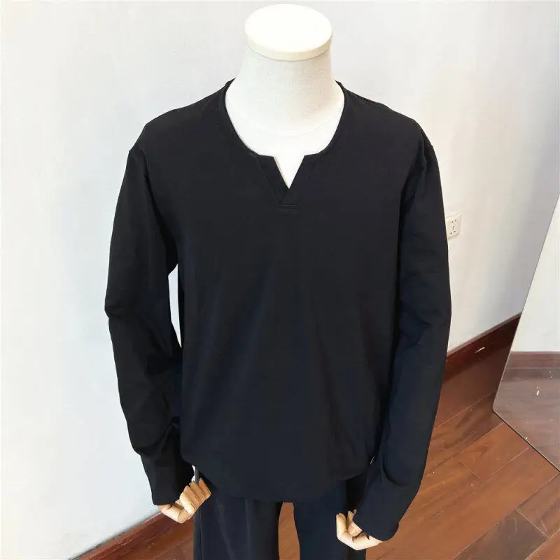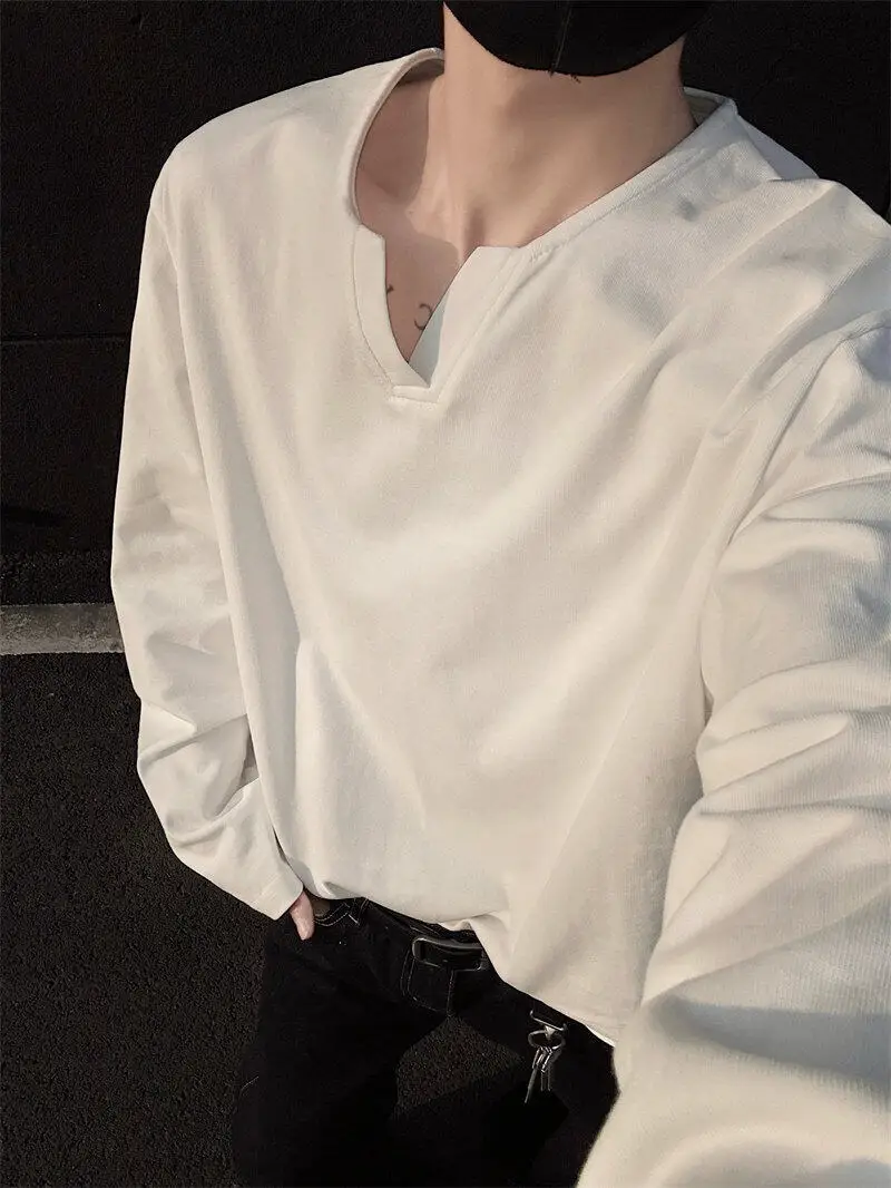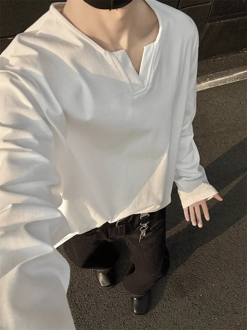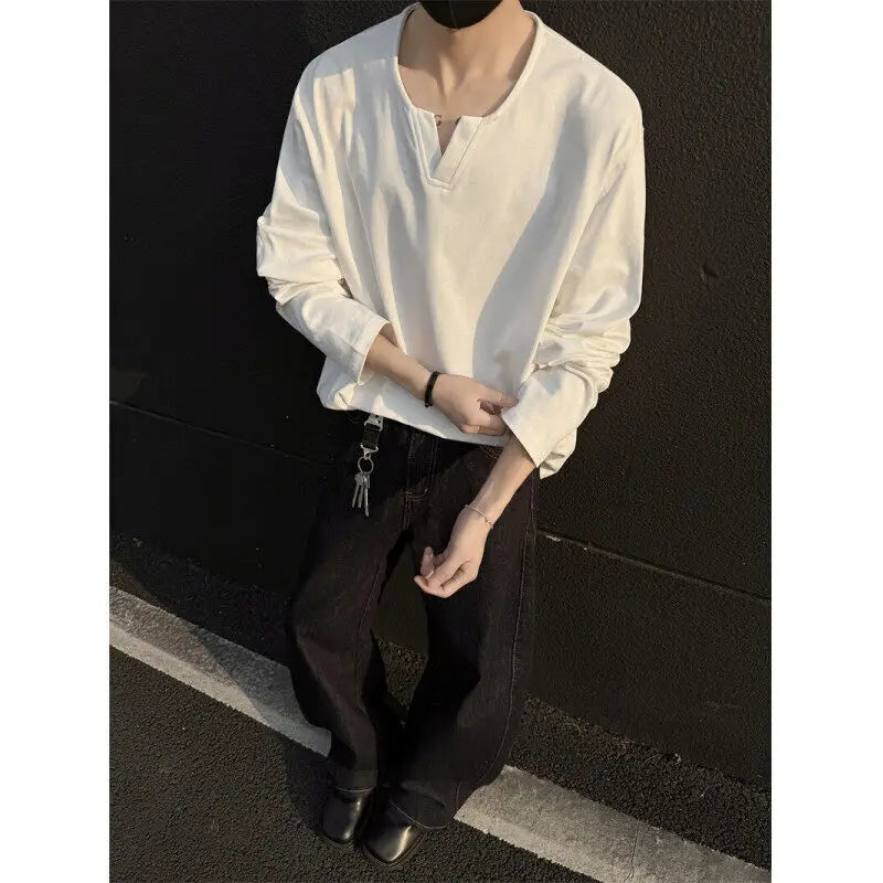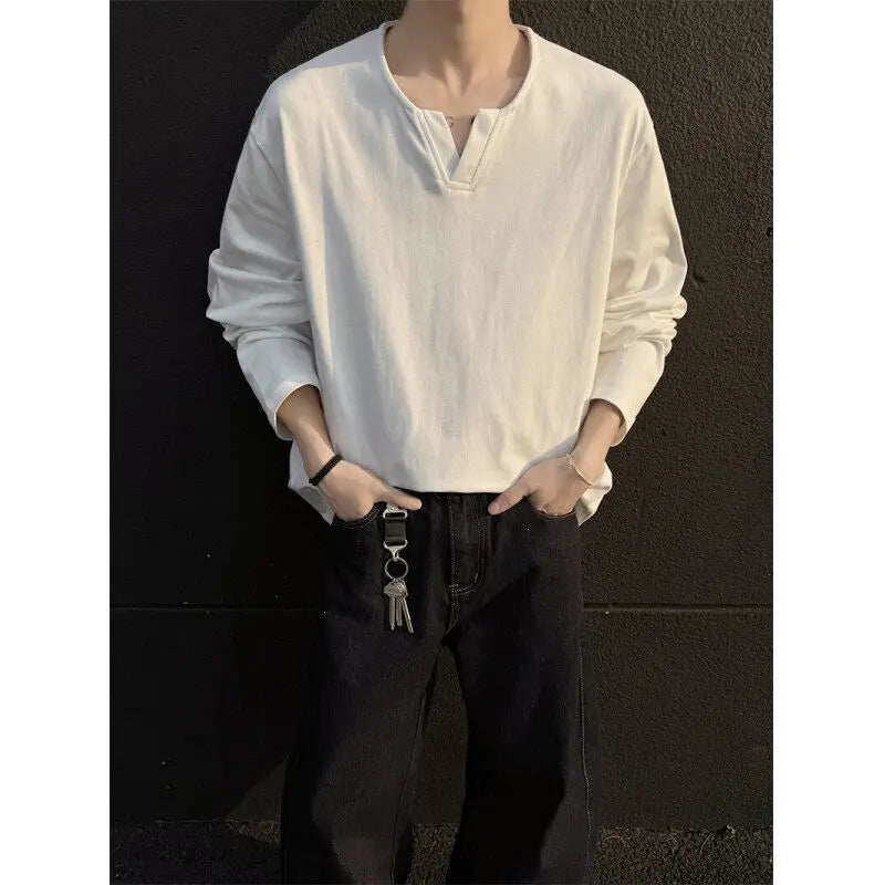 Cotton Long Sleeved T-shirt Men Fashion White V-neck T Shirt Men Streetwear Korean Loose Casual Pullover T Shirt Mens Top M-2XL