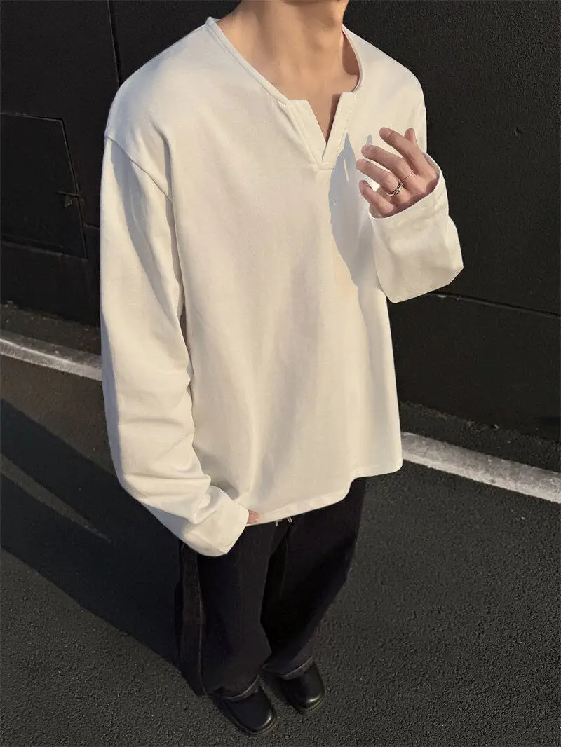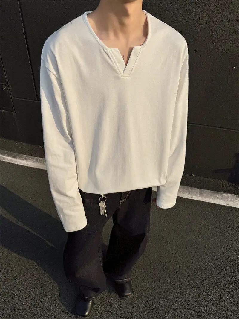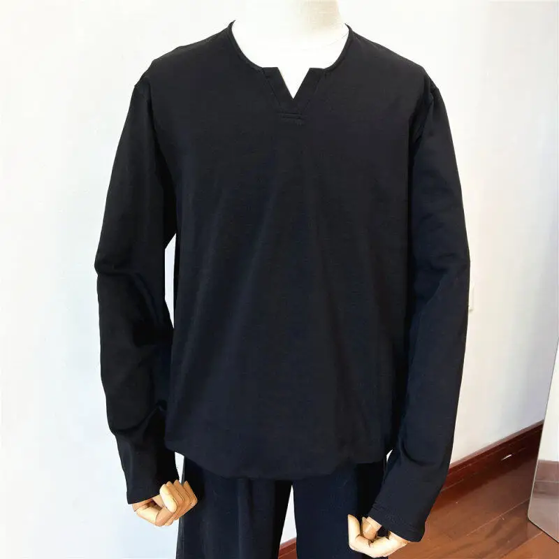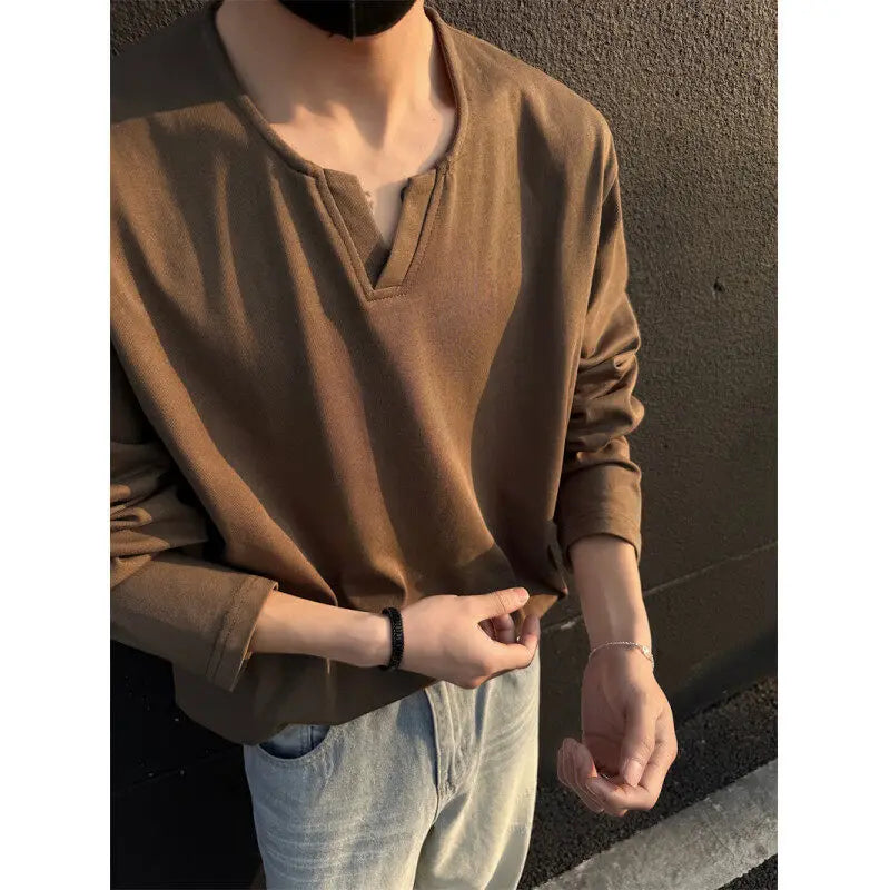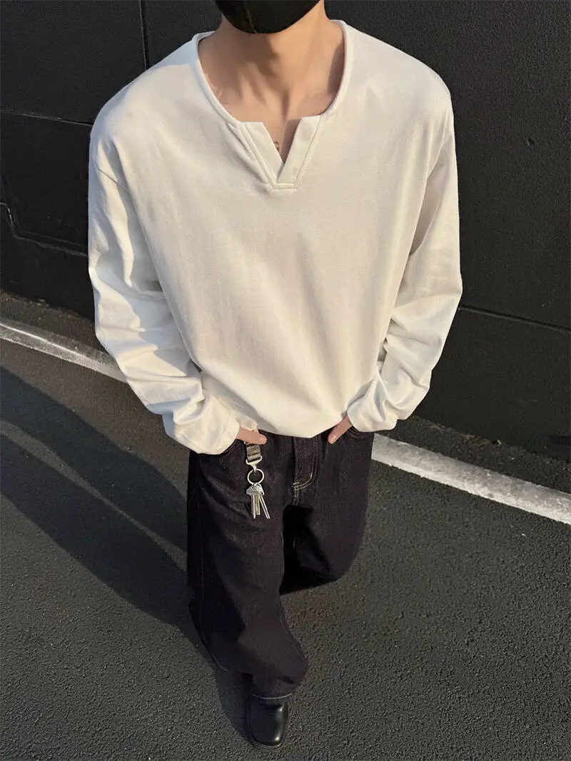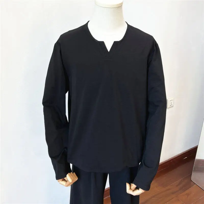 Cotton Long Sleeved T-shirt Men Fashion White V-neck T Shirt Men Streetwear Korean Loose Casual Pullover T Shirt Mens Top M-2XL