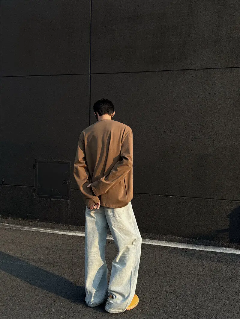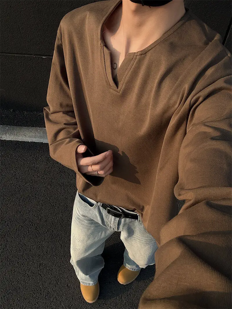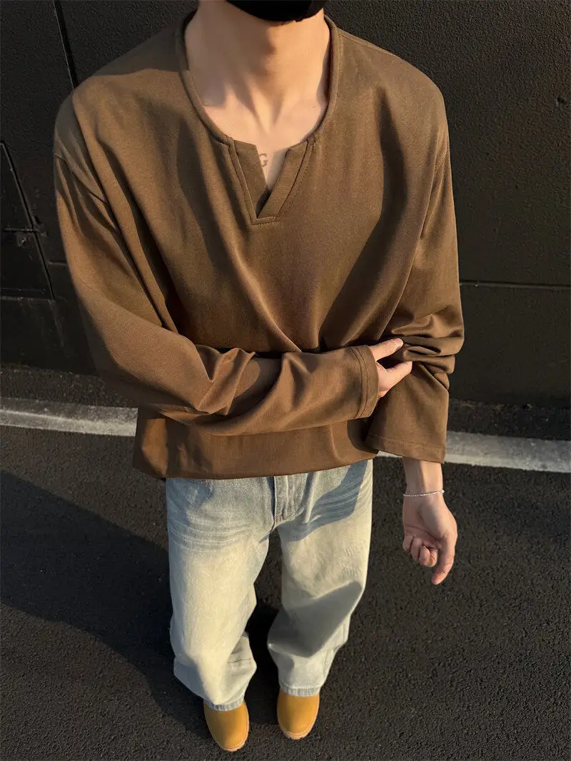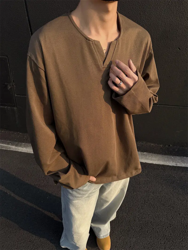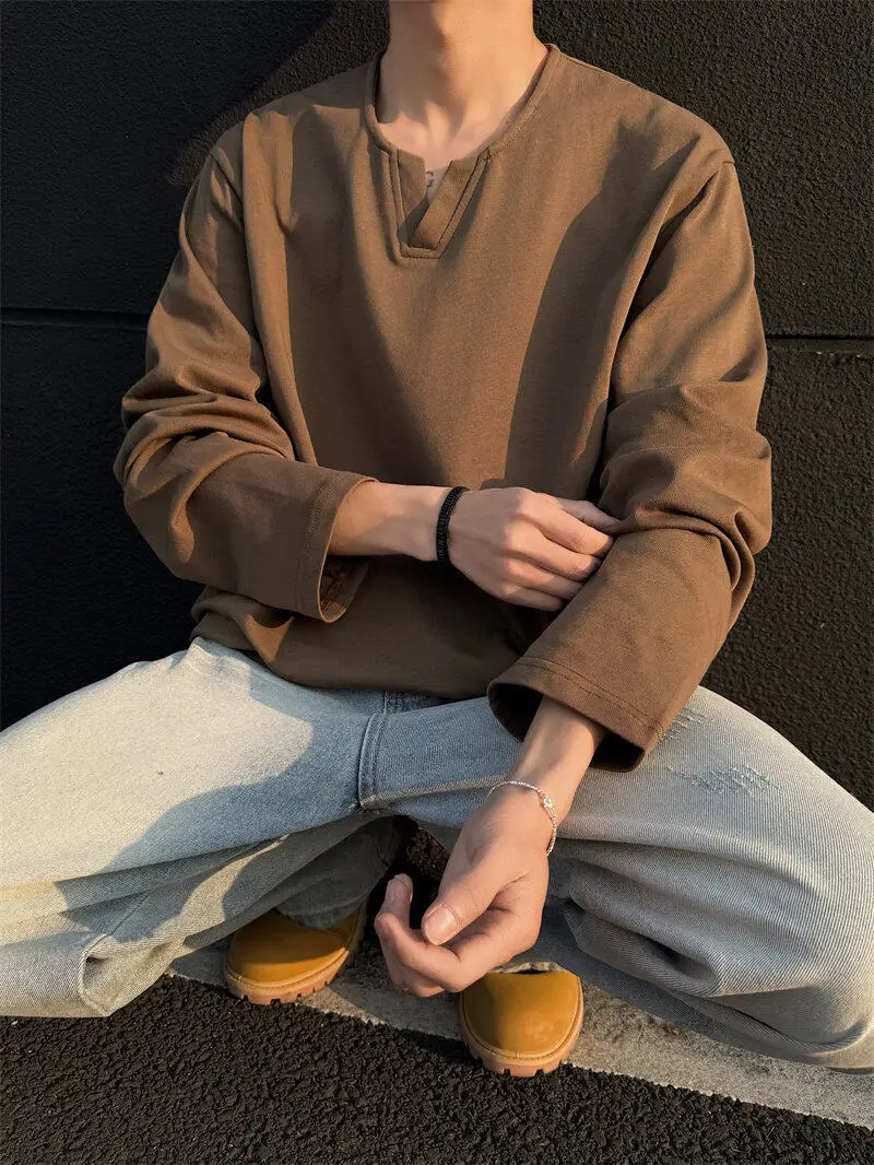 Cotton Long Sleeved T-shirt Men Fashion White V-neck T Shirt Men Streetwear Korean Loose Casual Pullover T Shirt Mens Top M-2XL