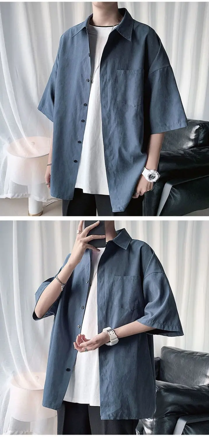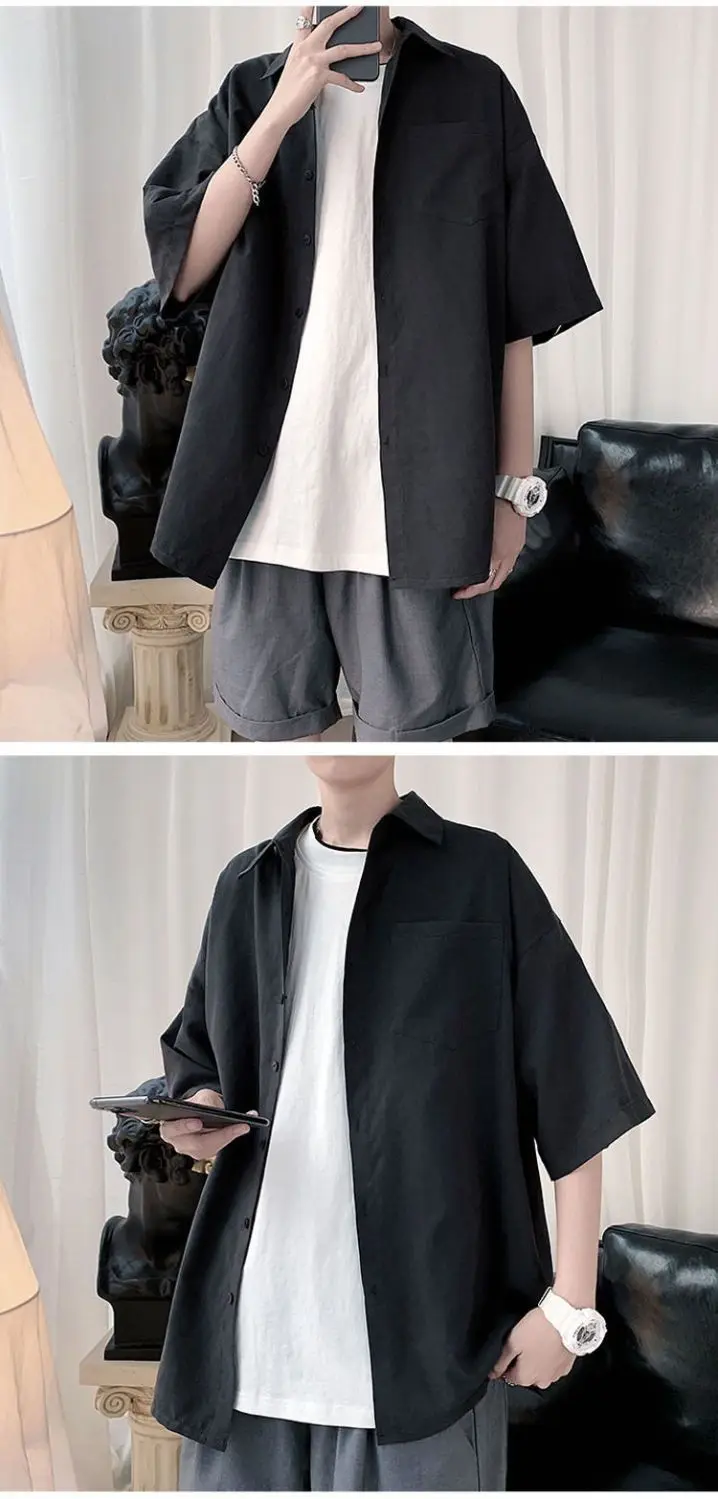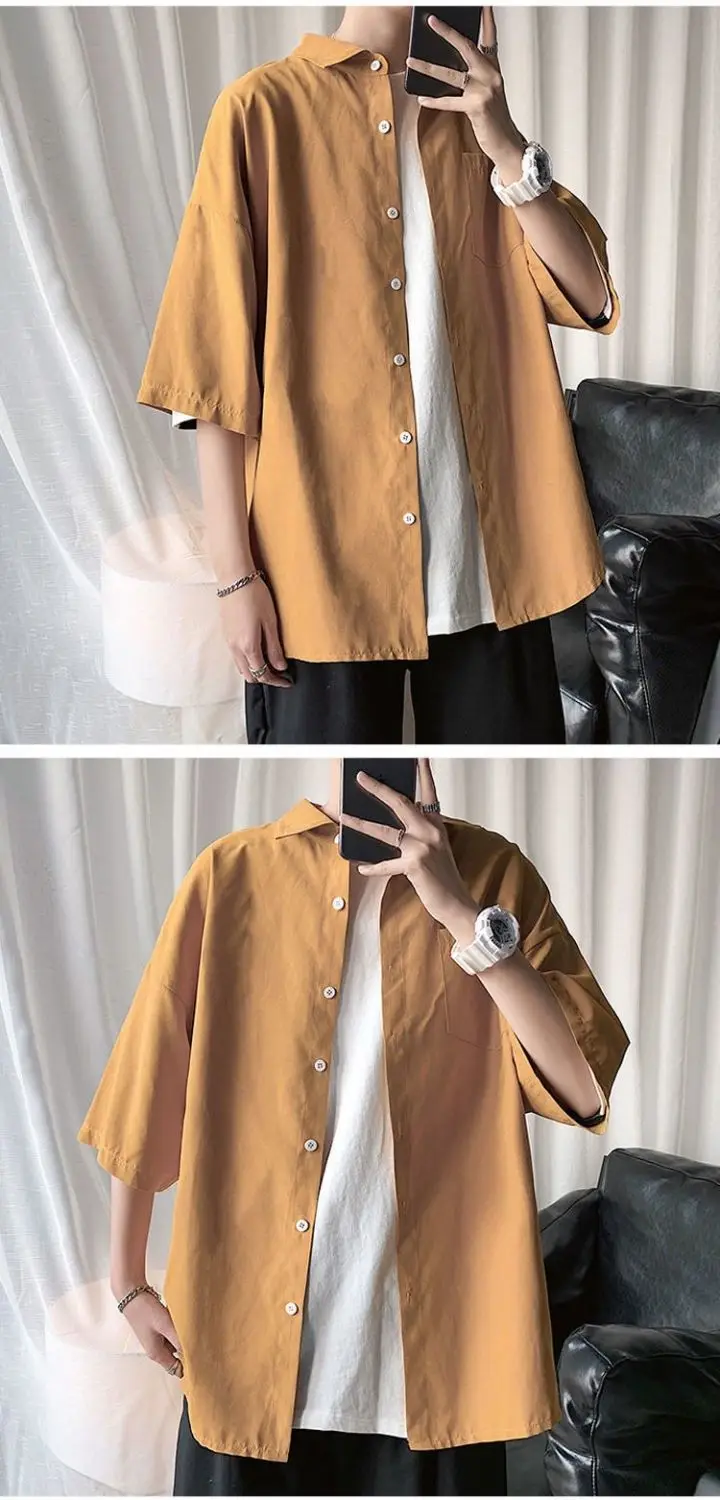 Elegant Fashion Harajuku Slim Fit Ropa Hombre Loose Casual Sport All Match Shirt Solid Square Neck Button Middle Sleeve Blusa