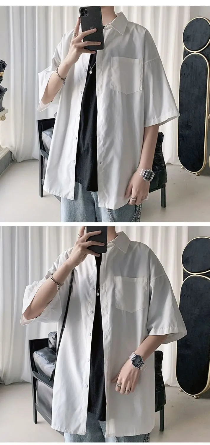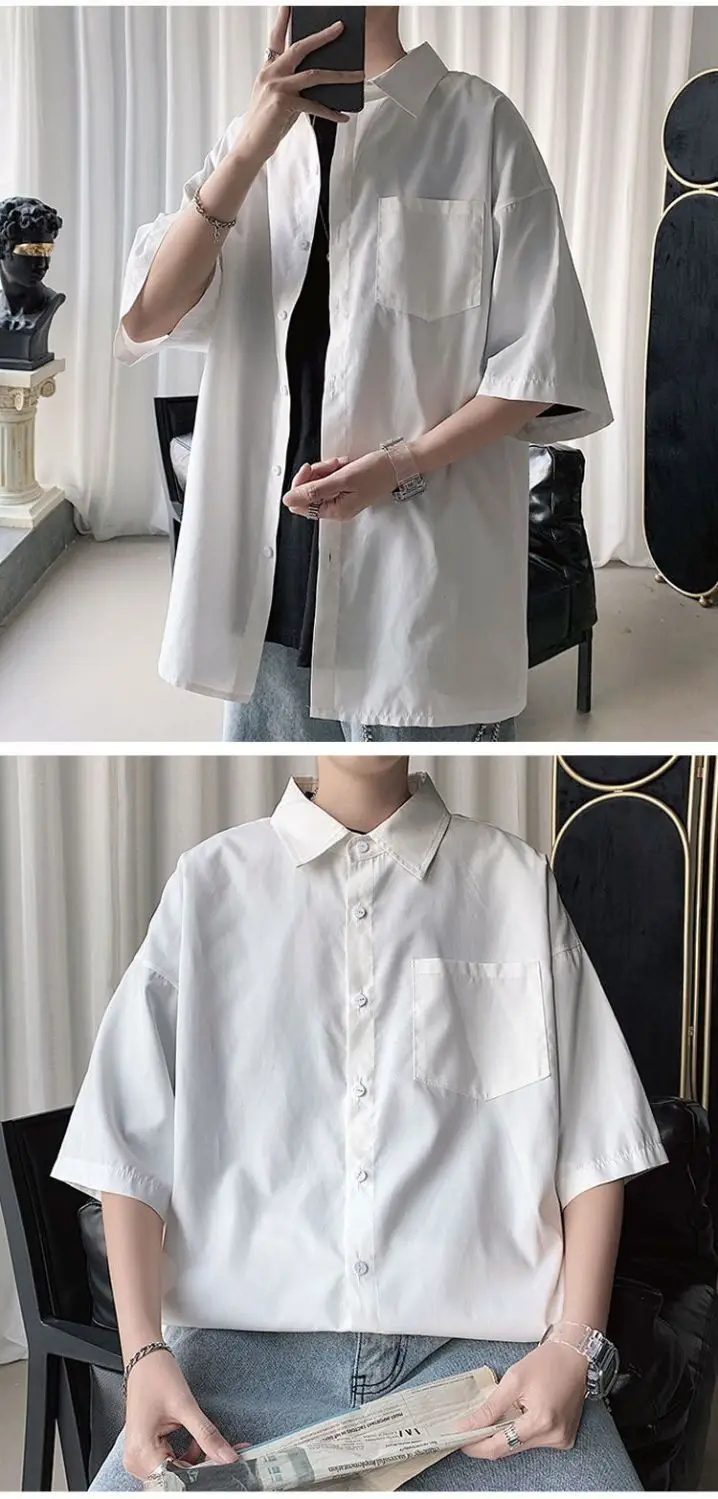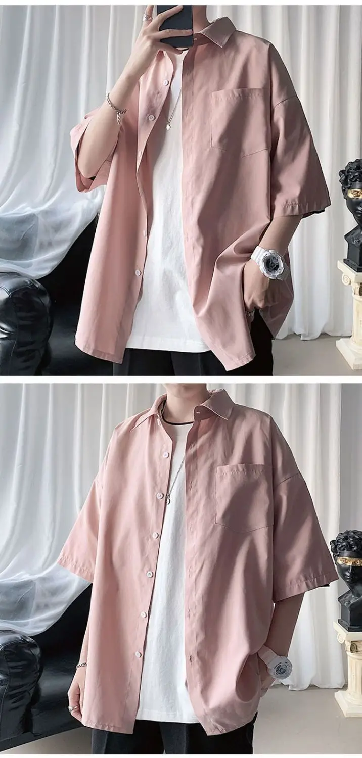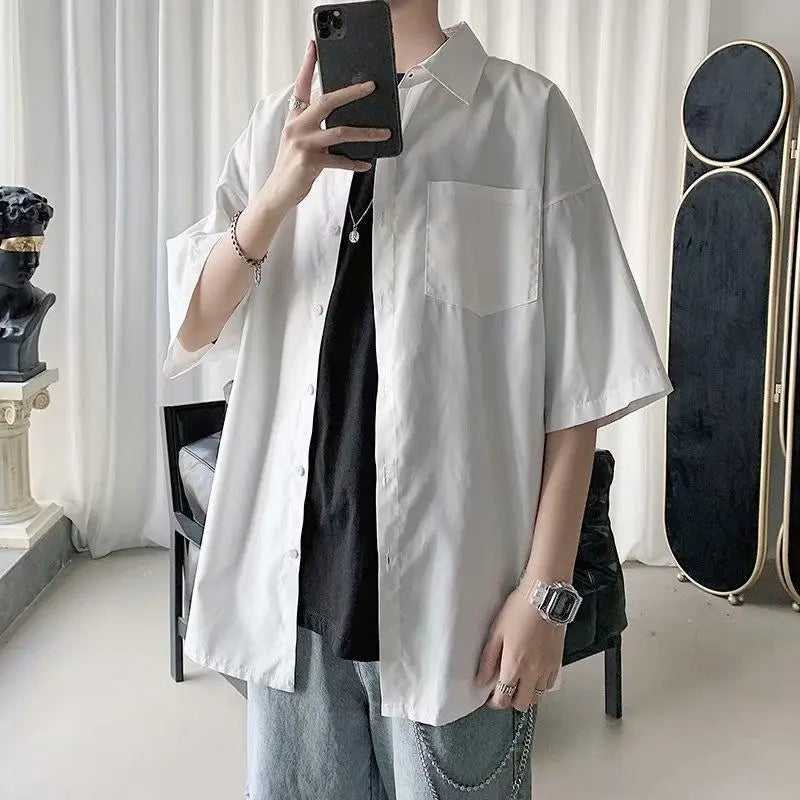 Elegant Fashion Harajuku Slim Fit Ropa Hombre Loose Casual Sport All Match Shirt Solid Square Neck Button Middle Sleeve Blusa