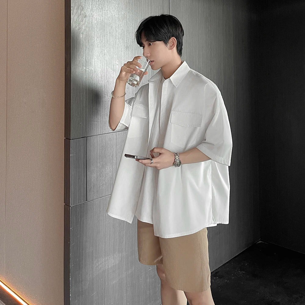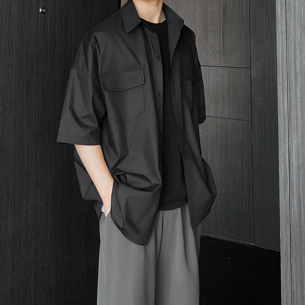 High Quality Solid Pockets Shirts Black Blouses Summer Korean Smooth Short Sleeve Shirt Streetwear Oversize Cargo Shirts
