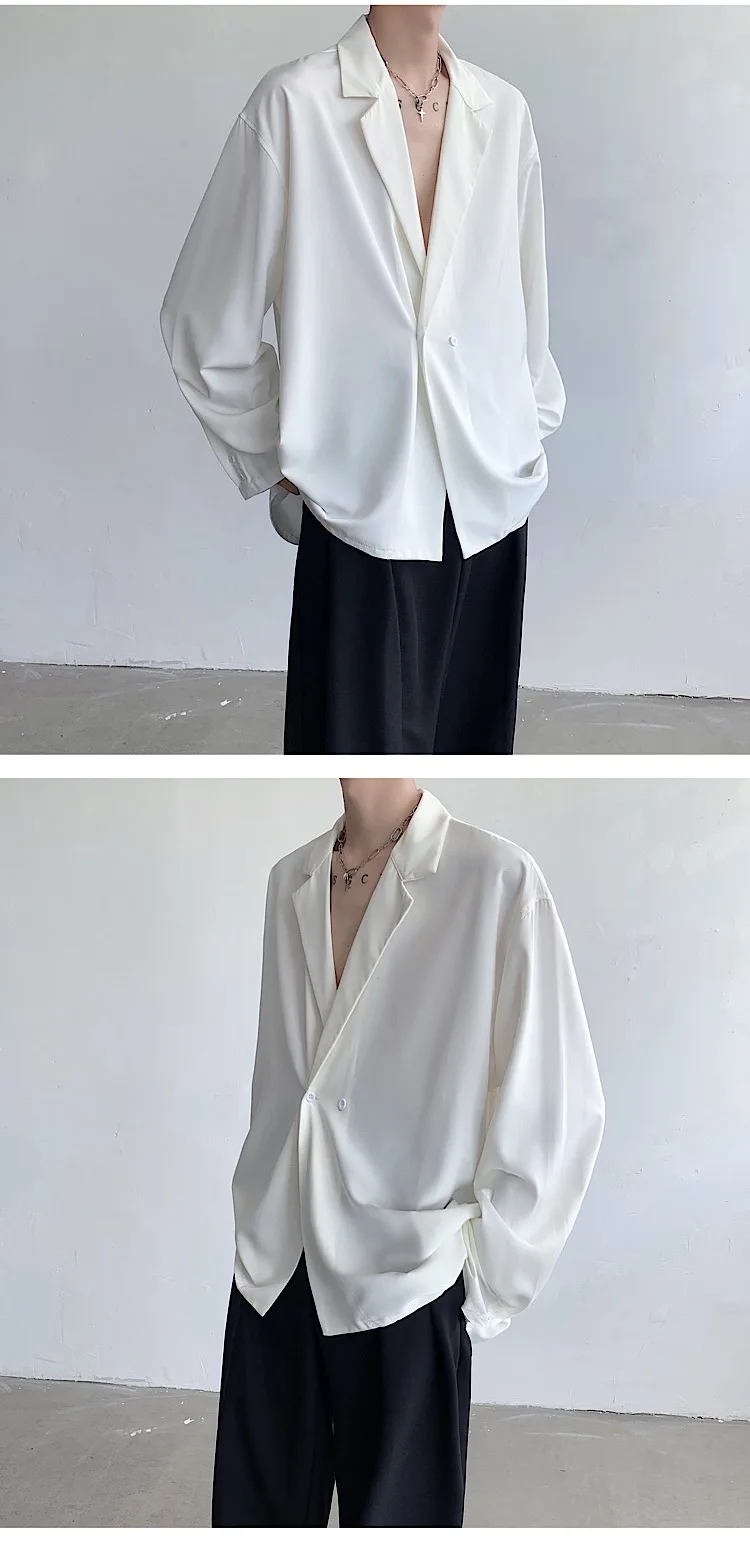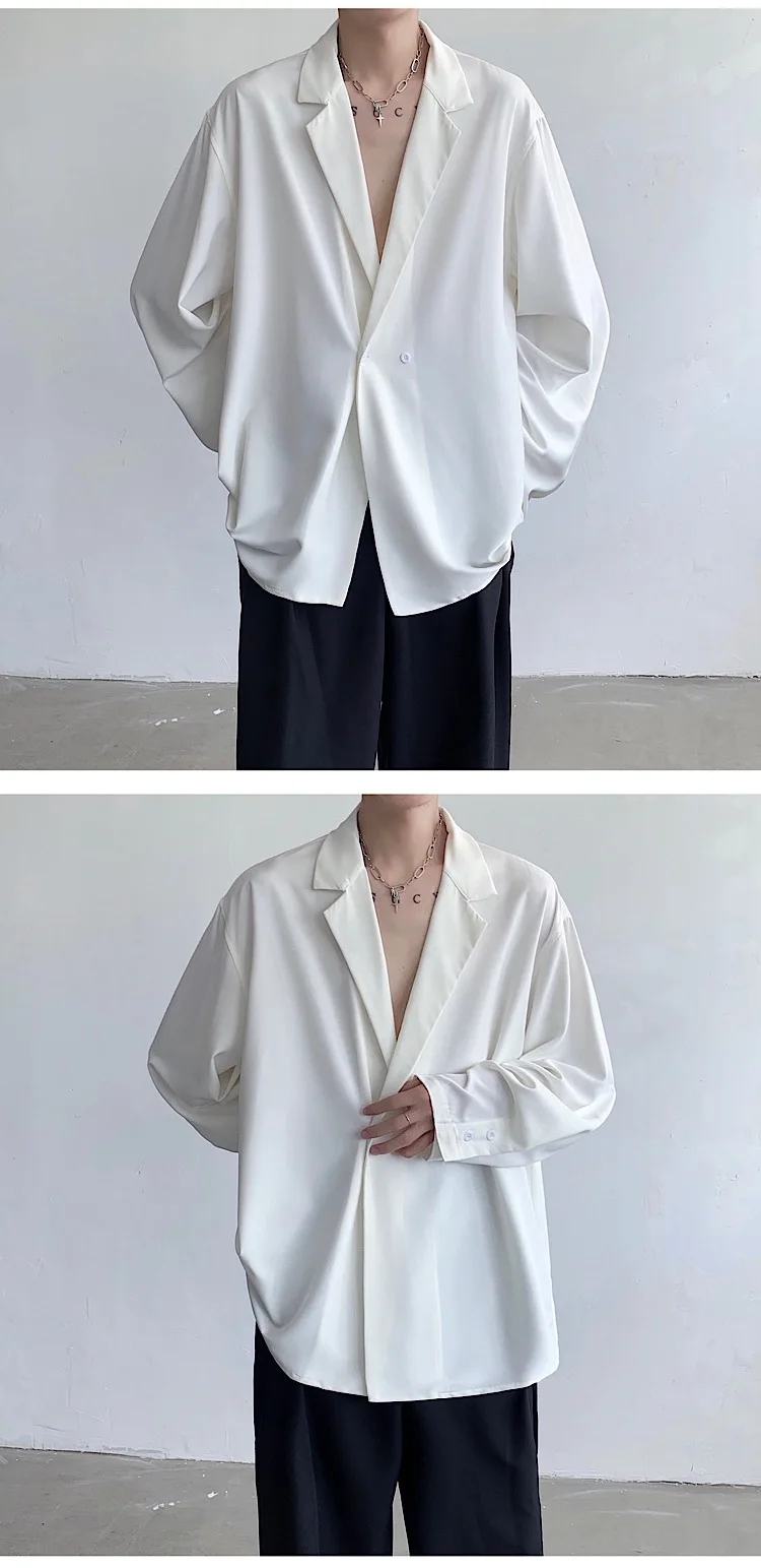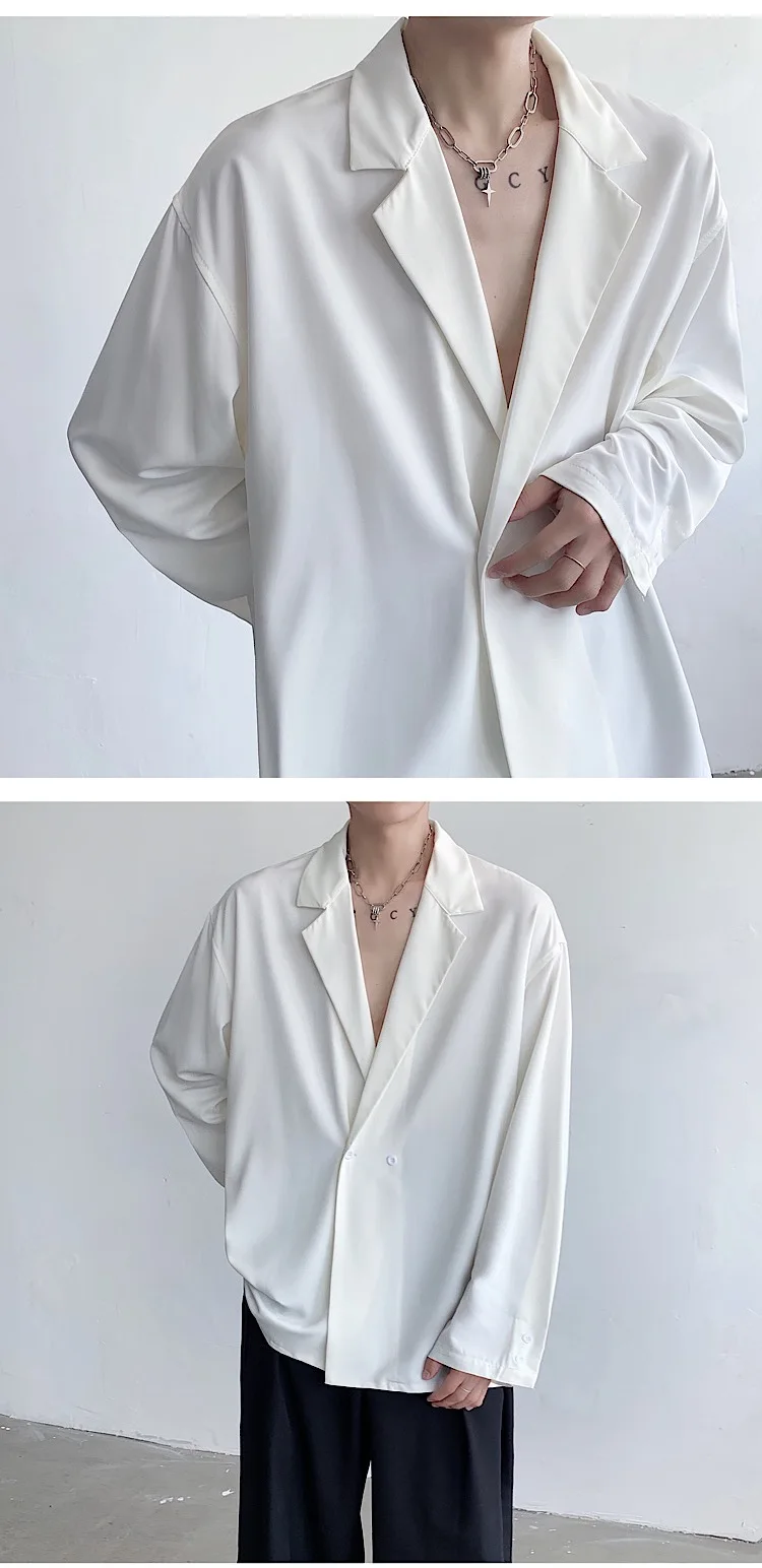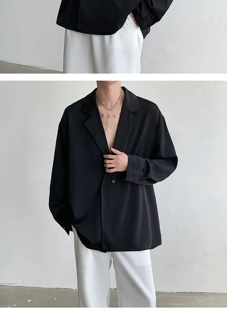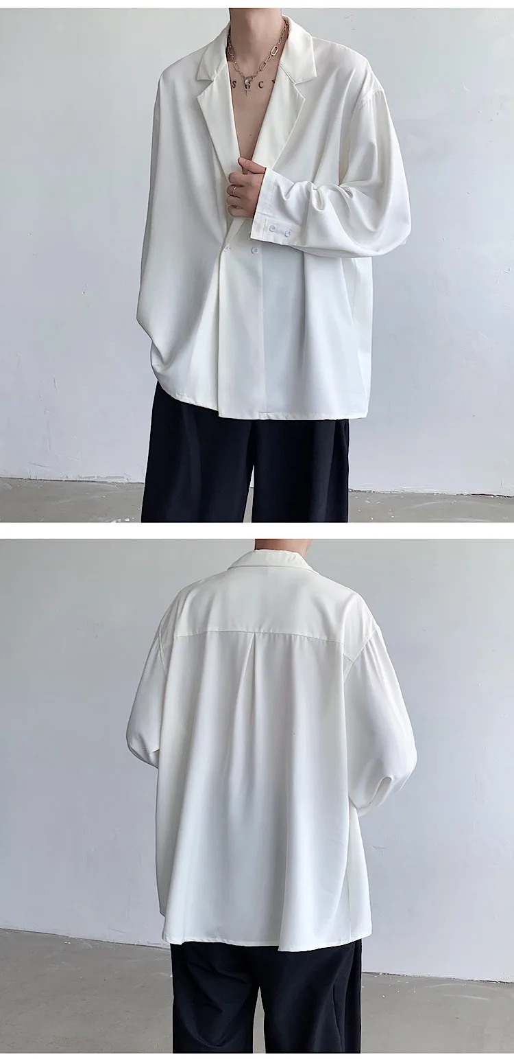 Korean Men Solid Color Lapel Double-breasted Casual Shirt Fashion Long Sleeve Tops Streetwear Loose Leisure Camisa Masculina
