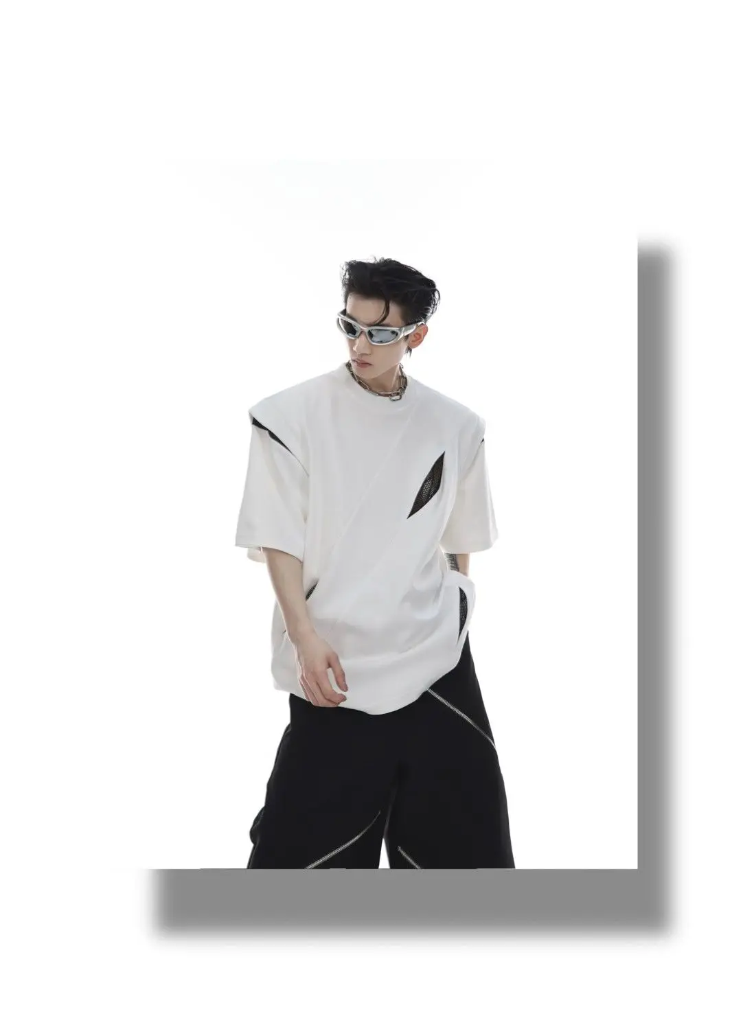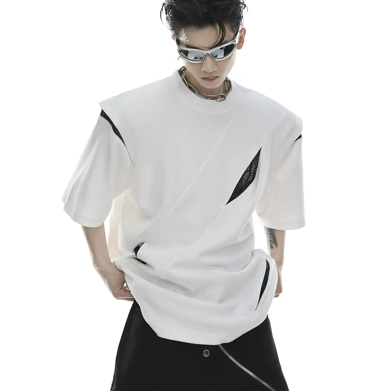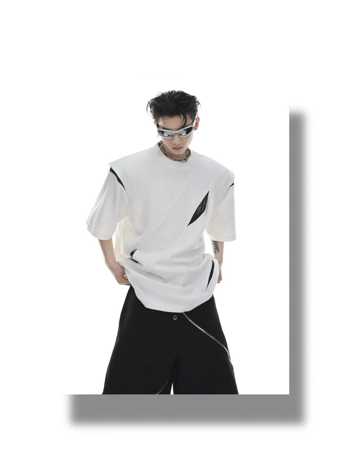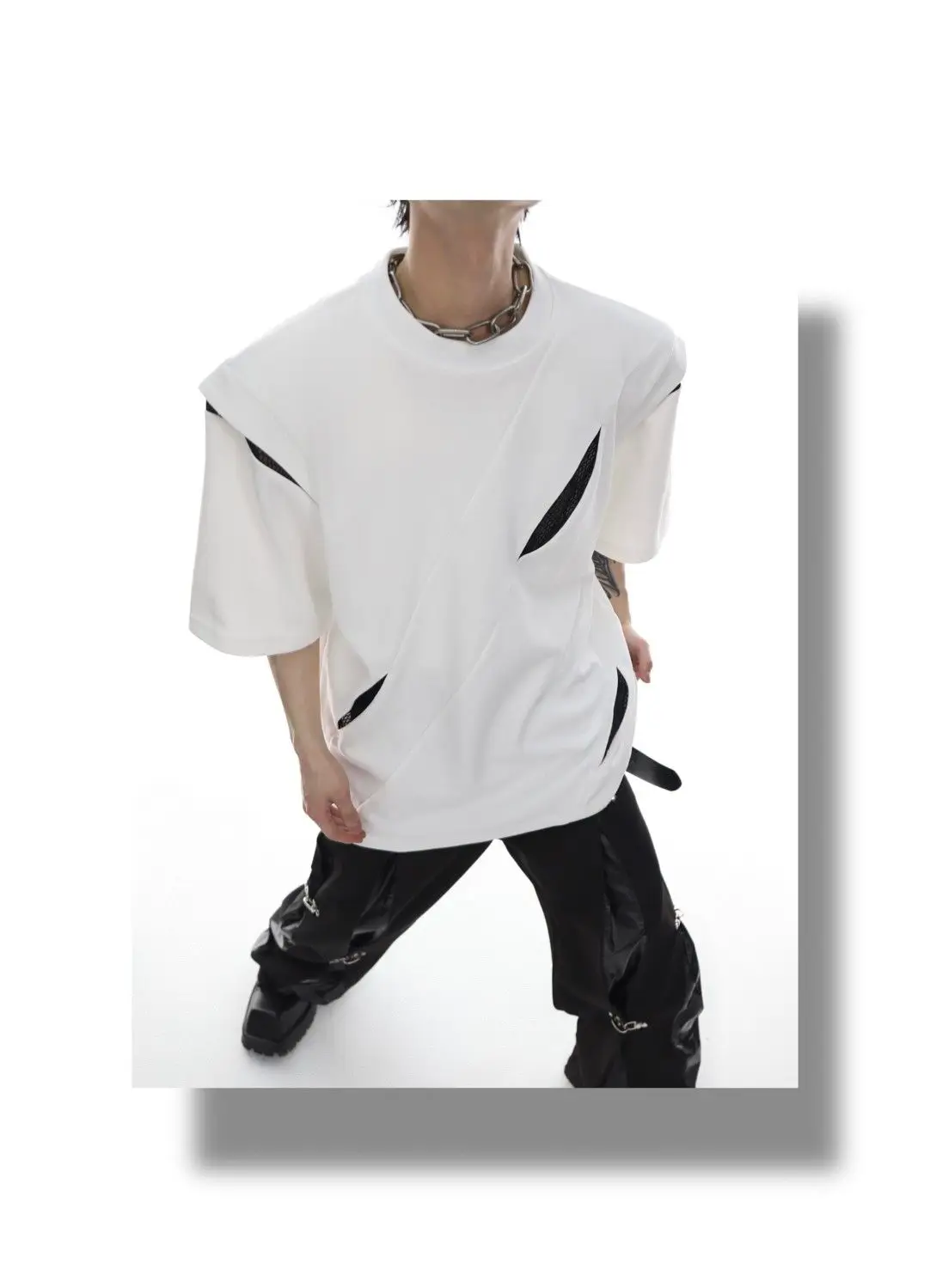 Korean Niche Deconstruction Segmented Shoulder Pad Short Sleeve Splicing Design T-shirt High-end Trendy Half-sleeved Men Women
