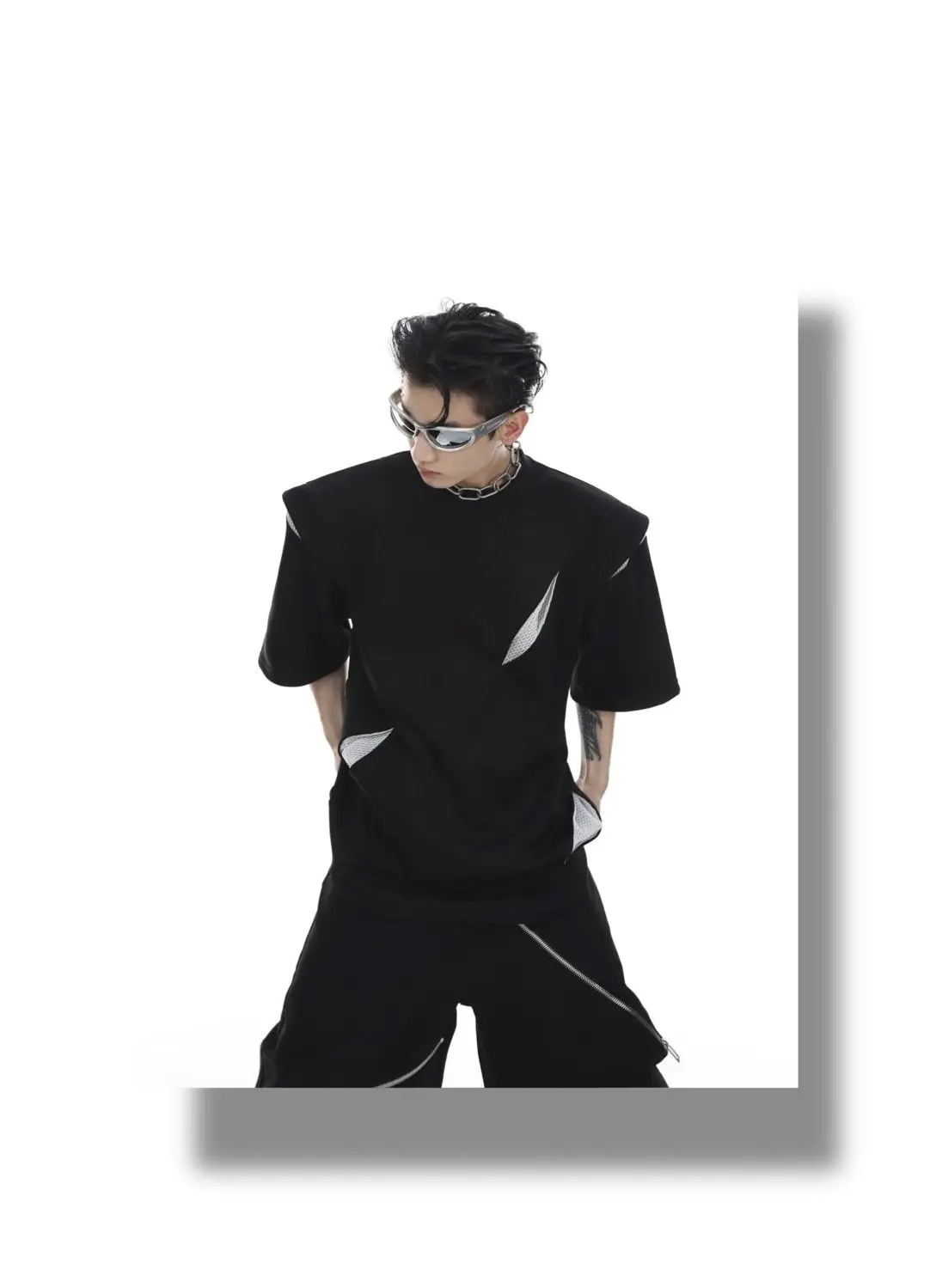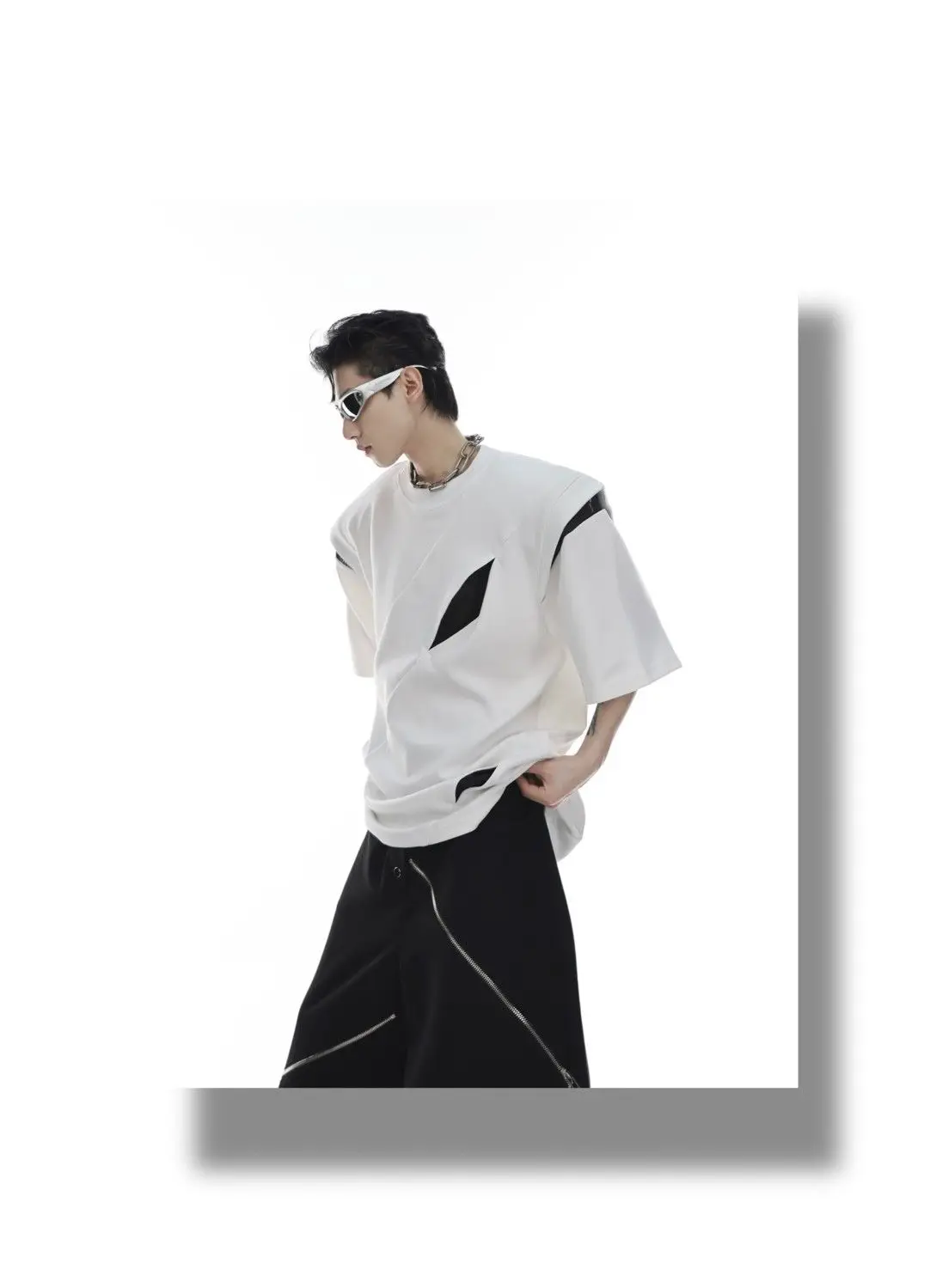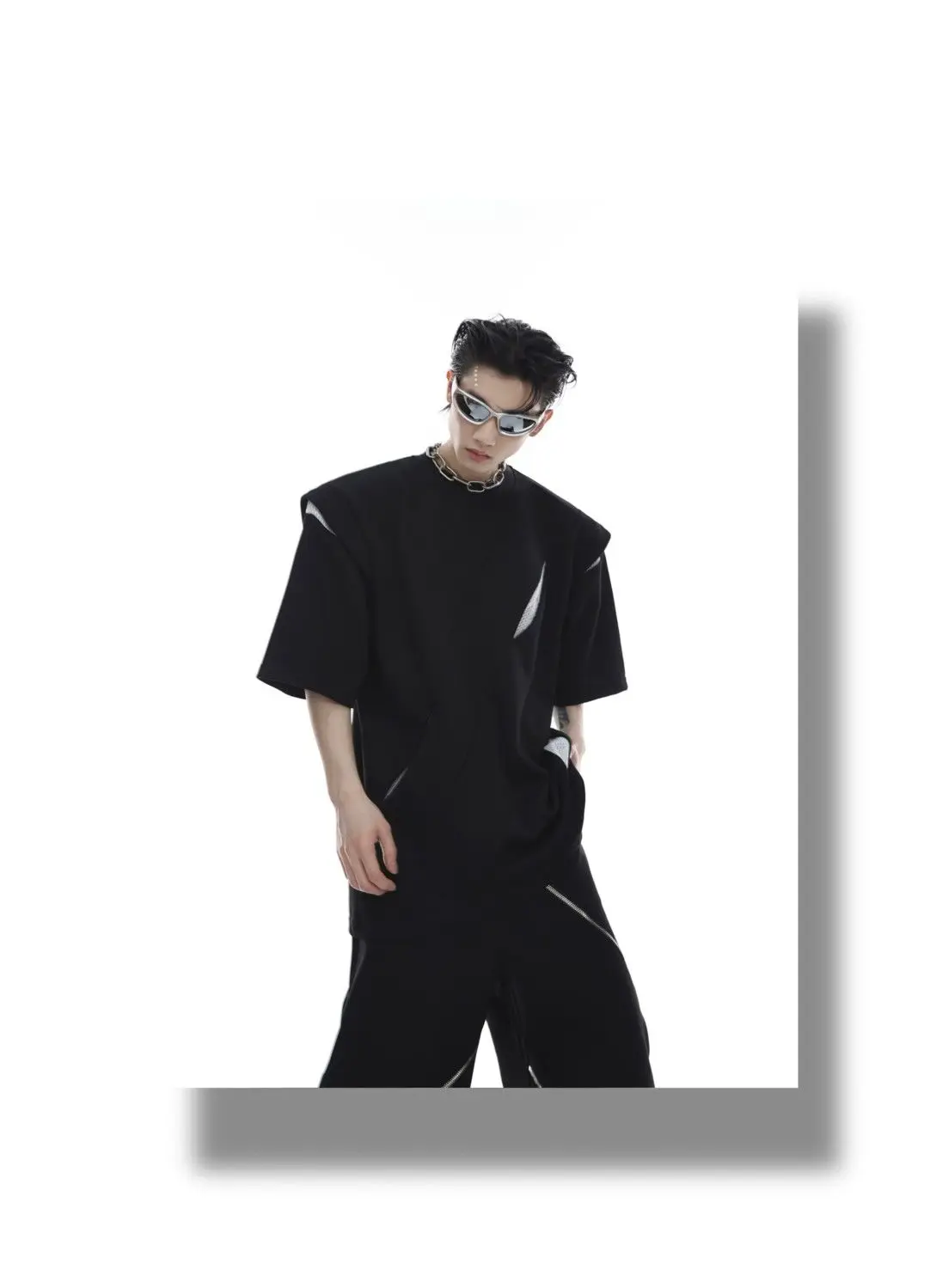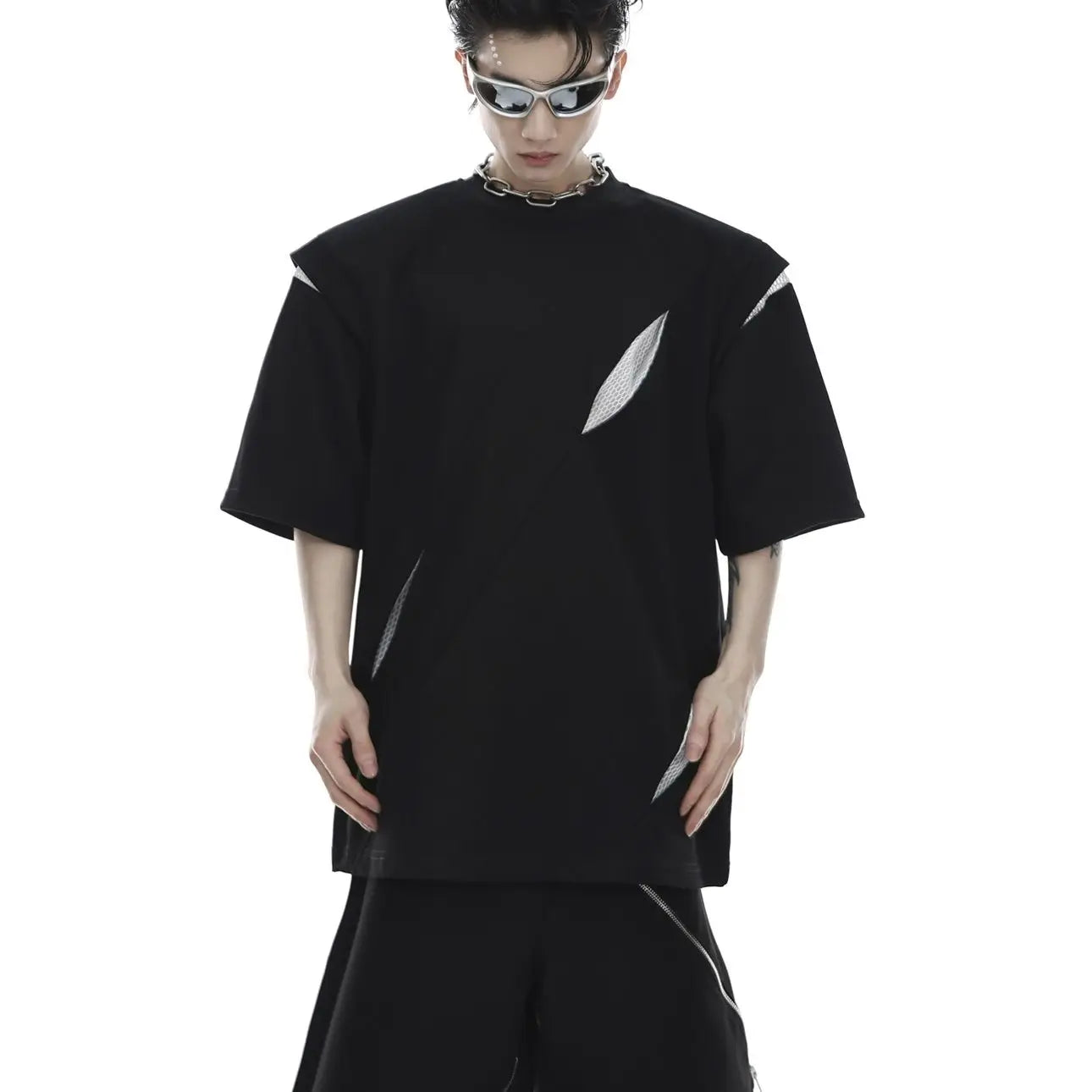 Korean Niche Deconstruction Segmented Shoulder Pad Short Sleeve Splicing Design T-shirt High-end Trendy Half-sleeved Men Women