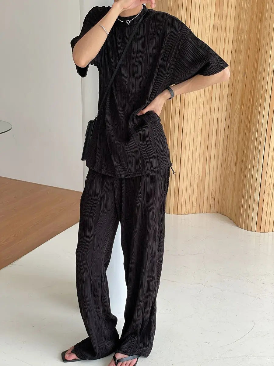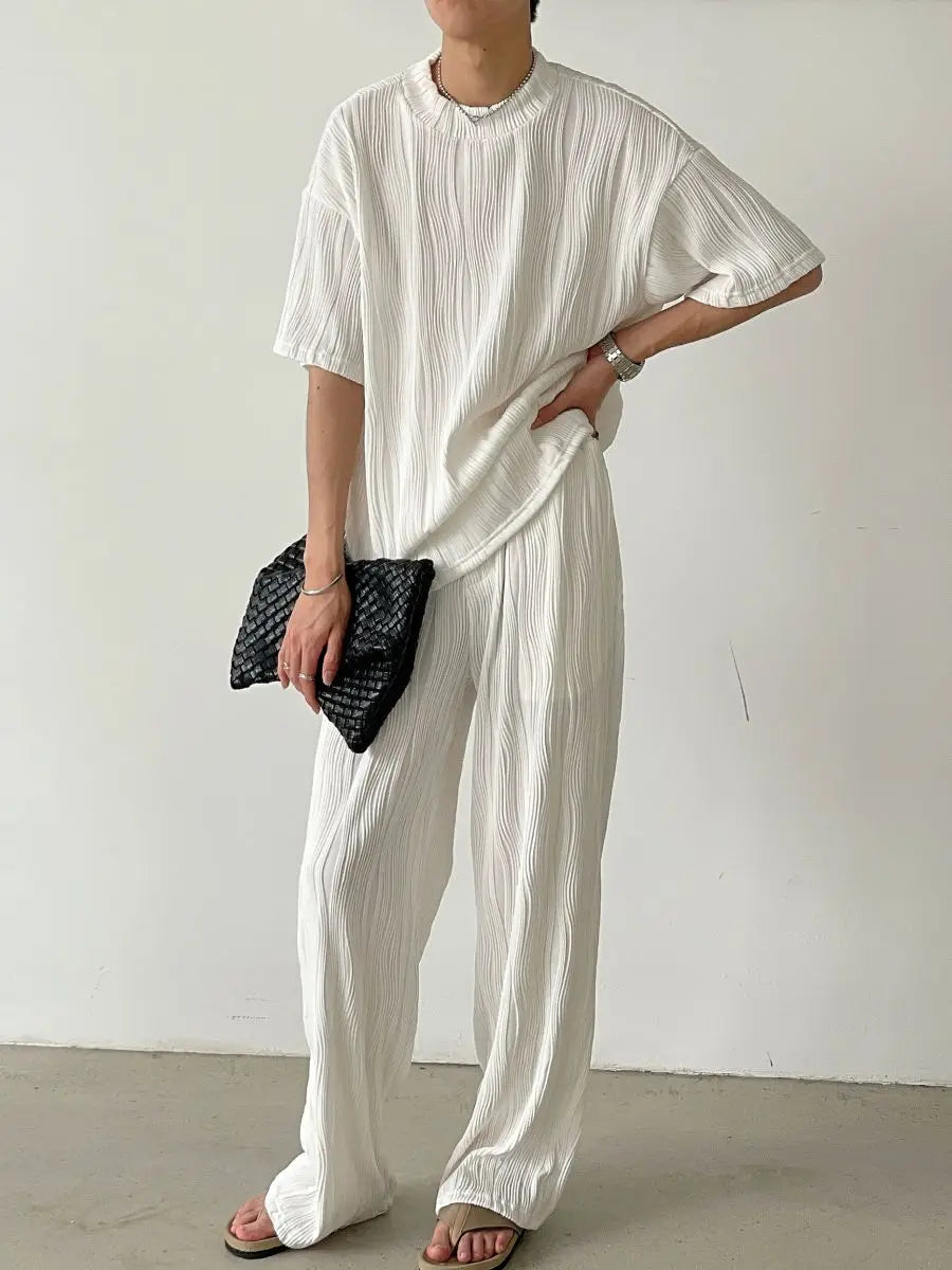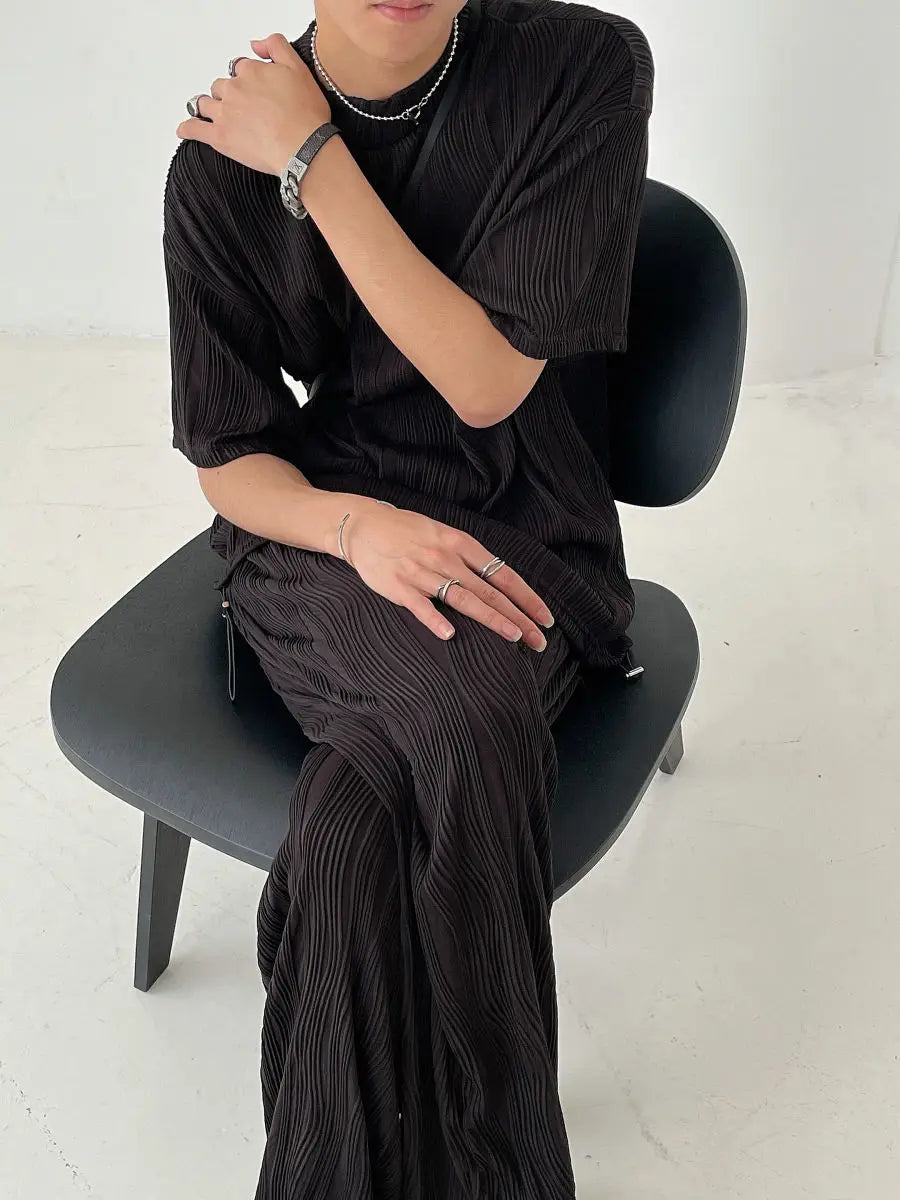 Mature Style Two-piece Set of Wavy Pleated Short-sleeved T-shirt Men's Loose Casual Straight-dial Long Trousers Tracksuit Summer