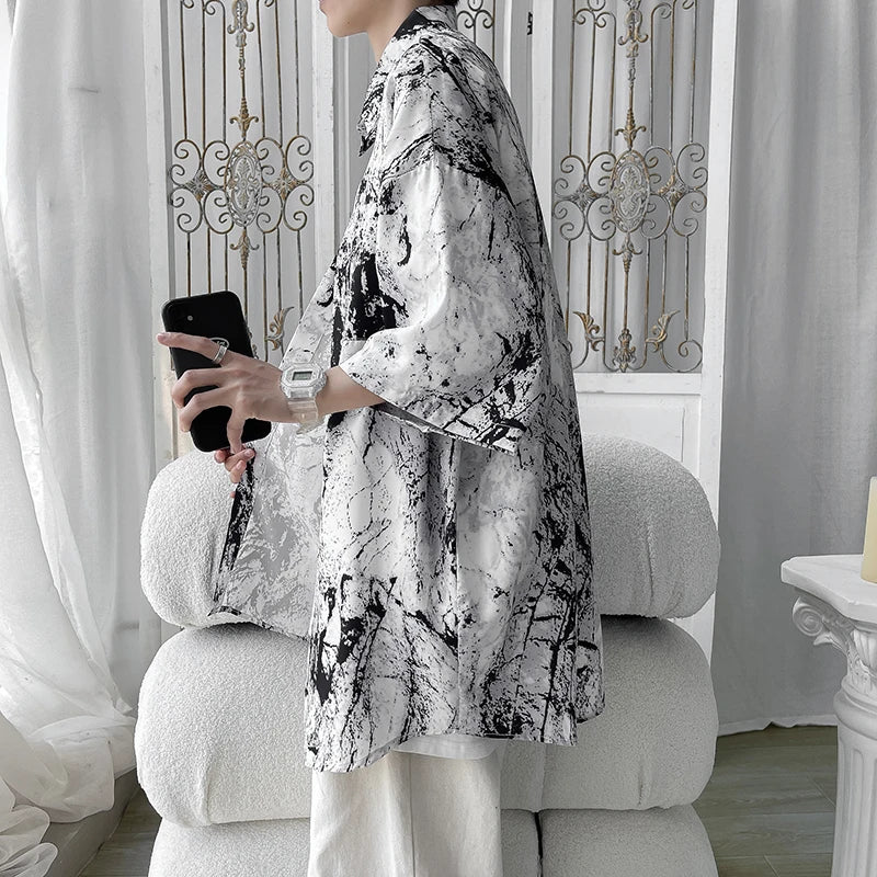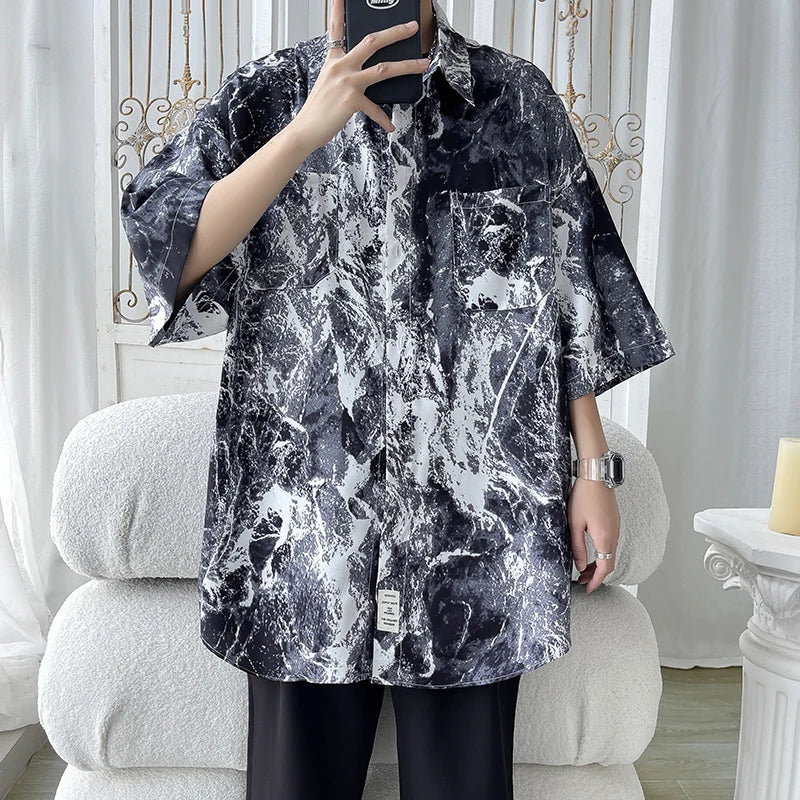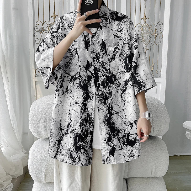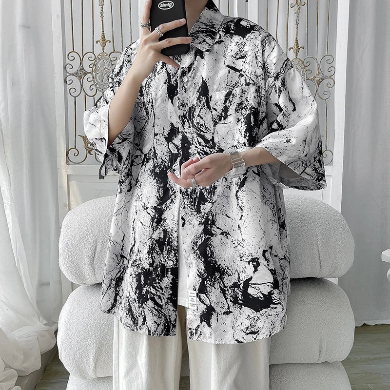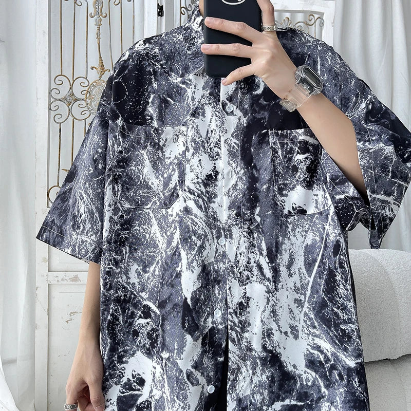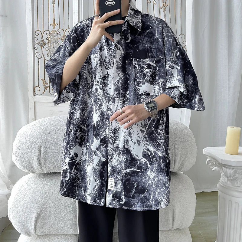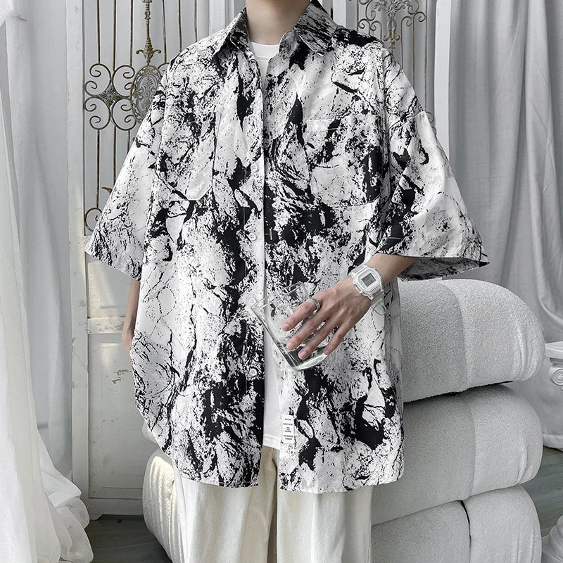 Men Hip Hop Harajuku Shirt Painting Graffiti Color Streetwear Loose Short Sleeve Trend Fashion Beach Shirts Casual Button Tops