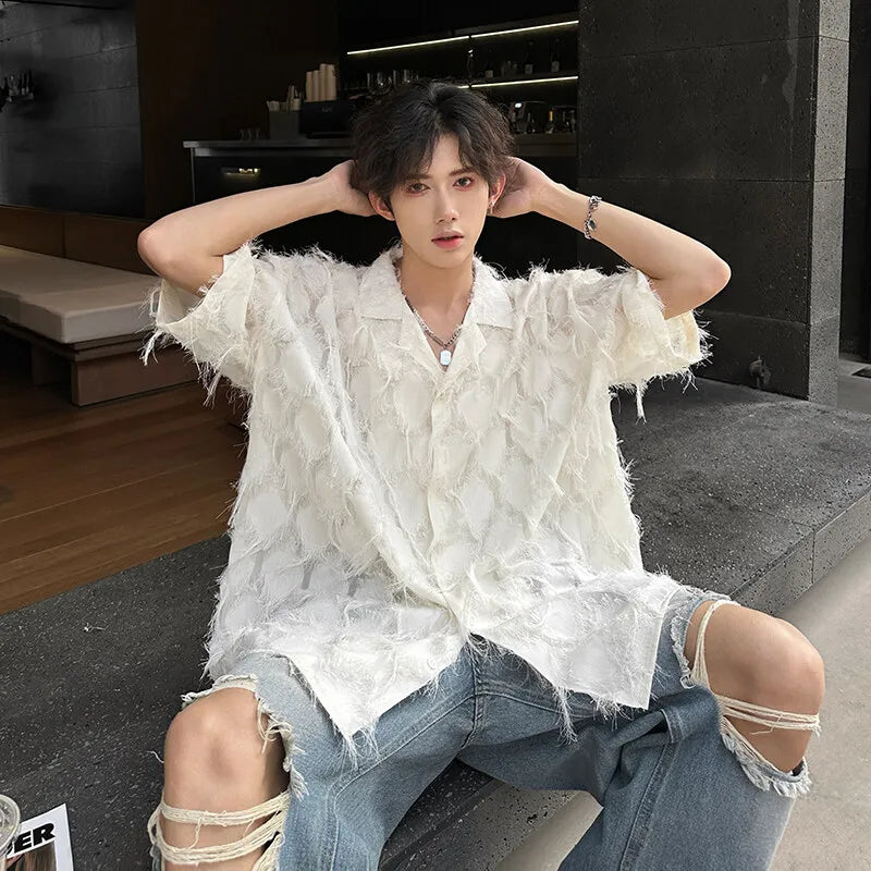 Men Loose Short Sleeve Shirt Small Suit Collar Diamond Frayed Edges Unique Design Casual Trendy Mens Fashion Boho Chic Style