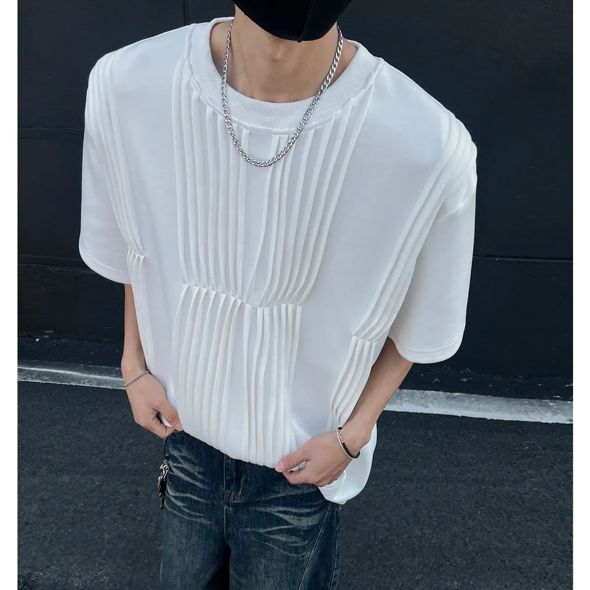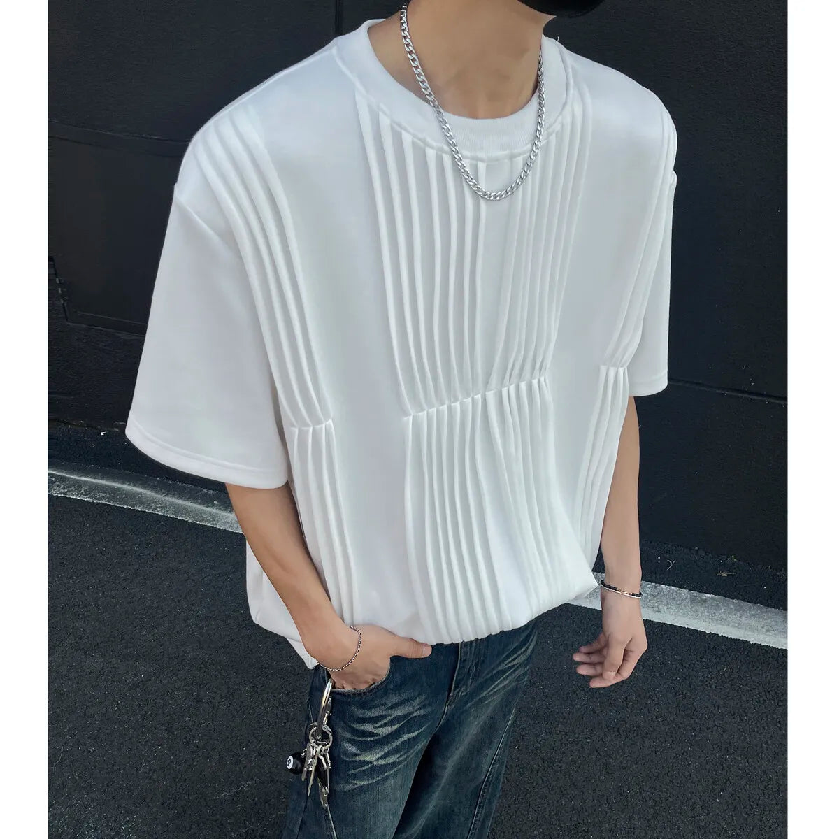 Men Pleated Chic T Shirt Solid Color O-neck Short Sleeve Casual Tshirt Men Clothing Streetwear 2025 Summer Fashion Camisetas