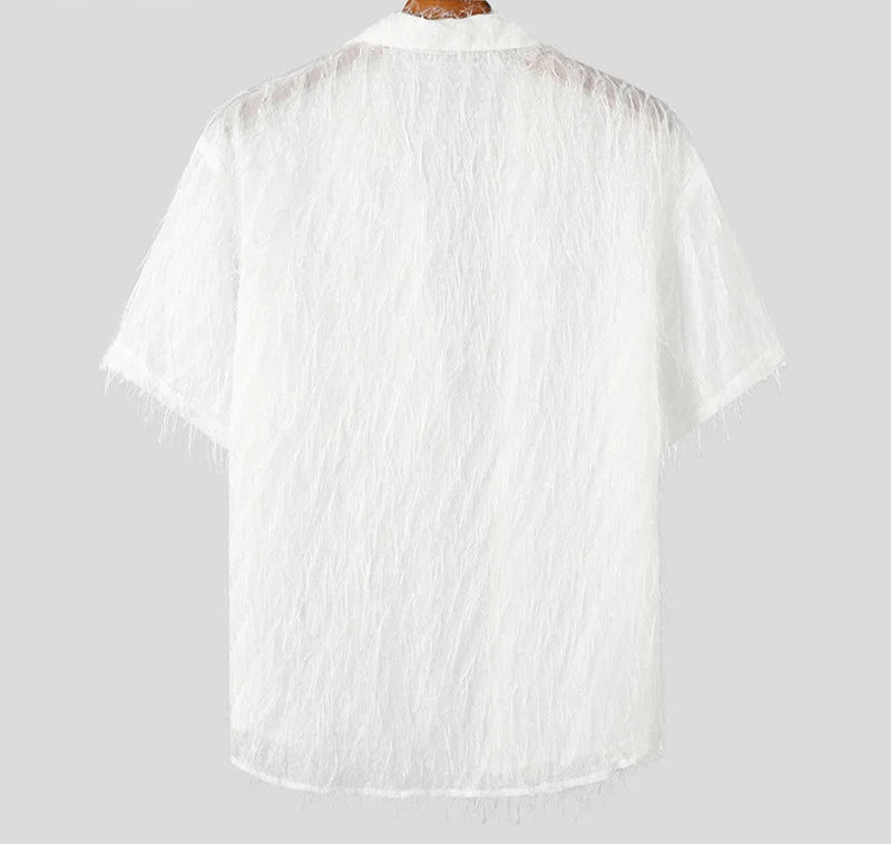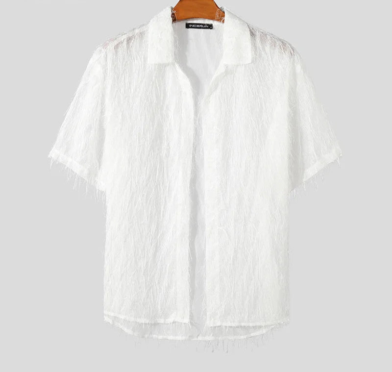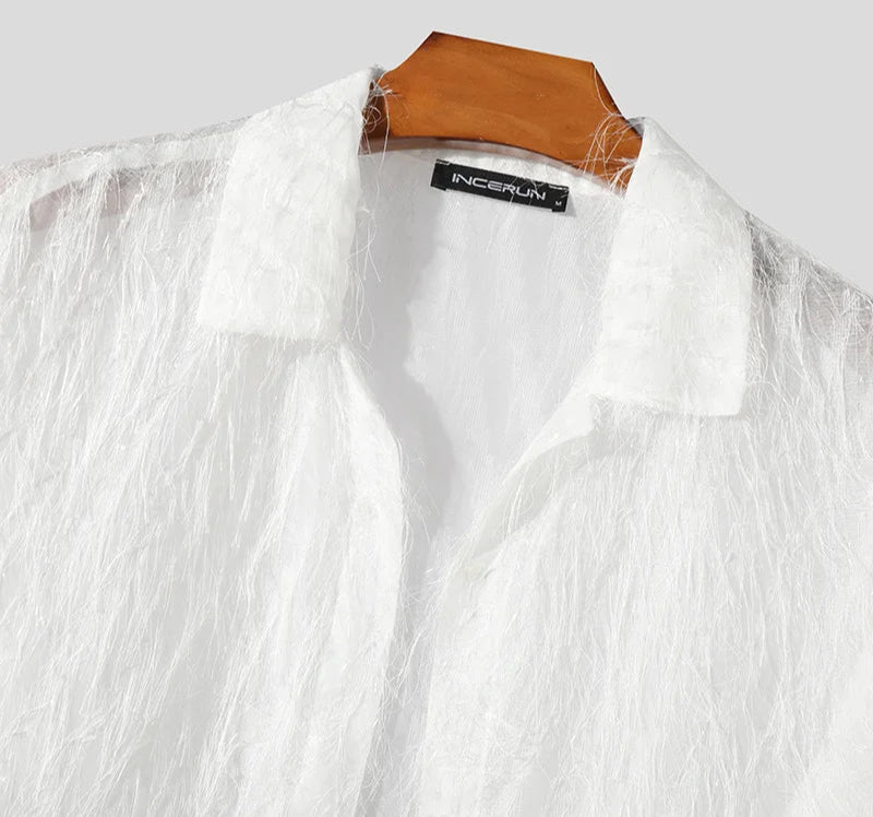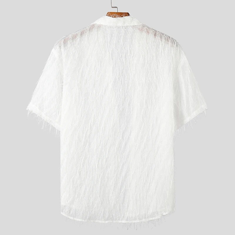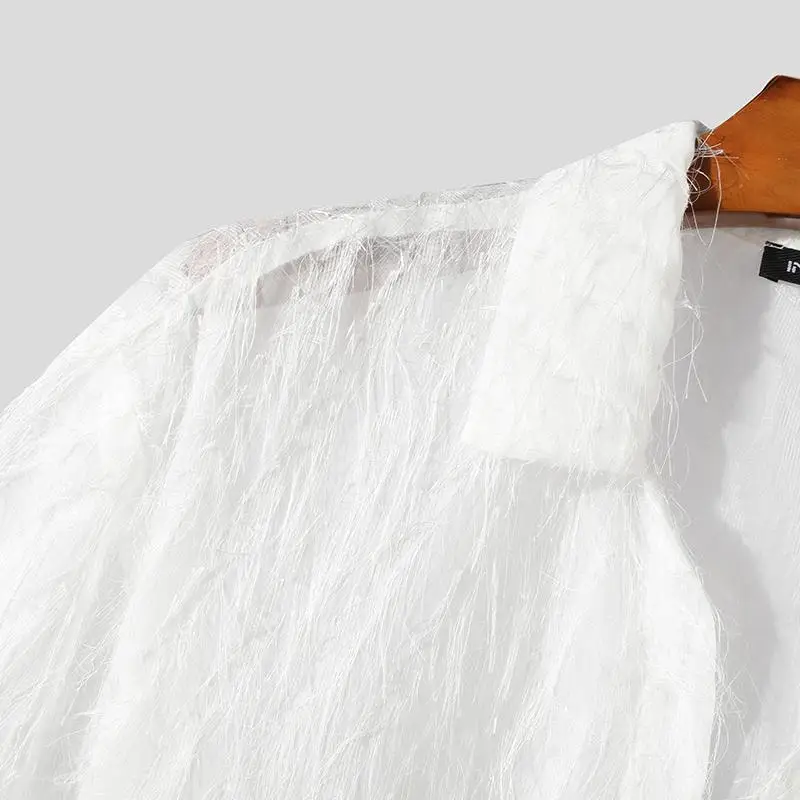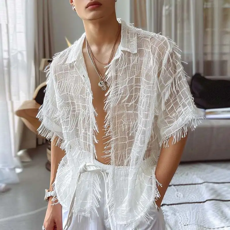 Men Shirt Tassel Chiffon Transparent Lapel Short Sleeve Sexy Men Clothing Summer Streetwear Party Fashion Camisas