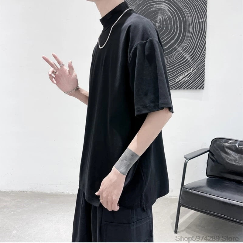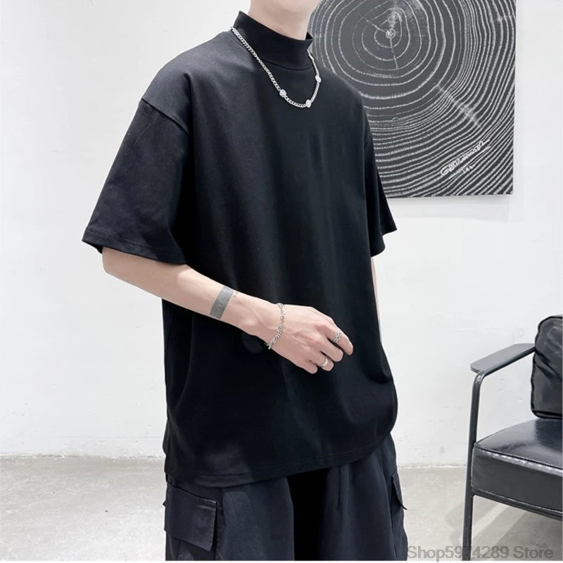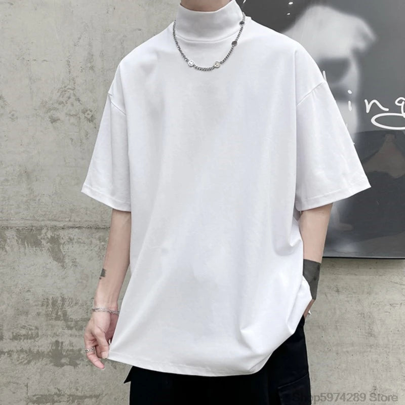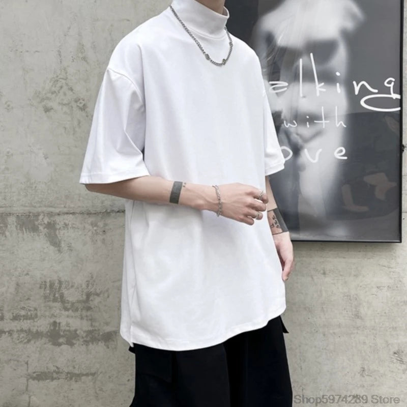 Men Tshirt Solid Streetwear Turtleneck Hip Hop Male Oversized T shirts Man Casual Short Sleeve Top Tees Black/White/Purple