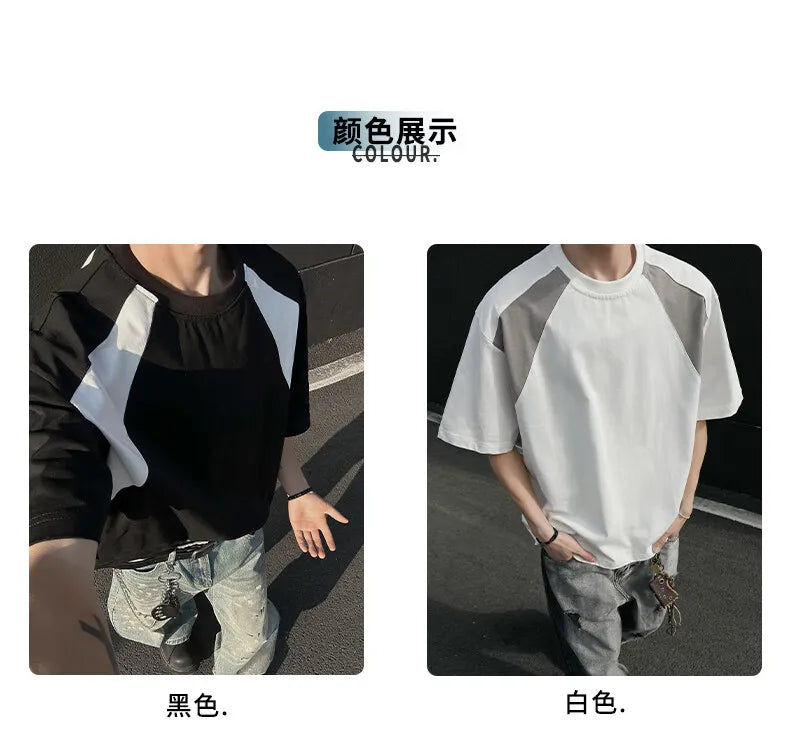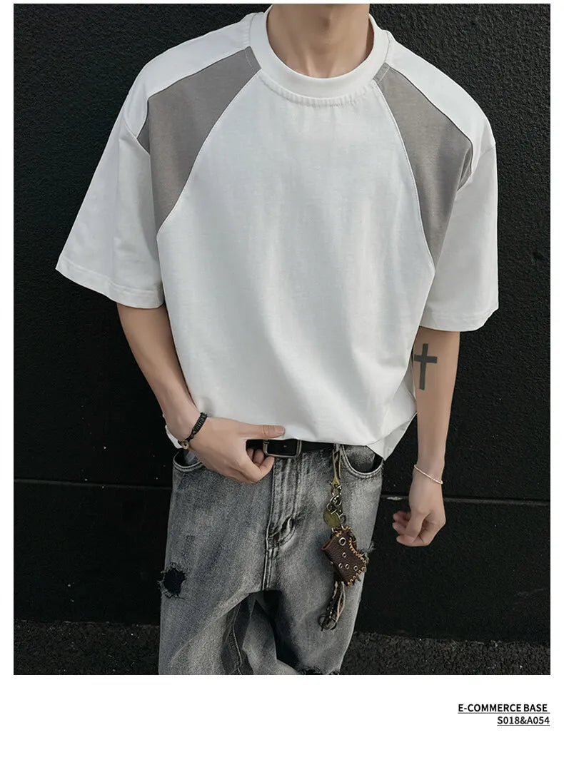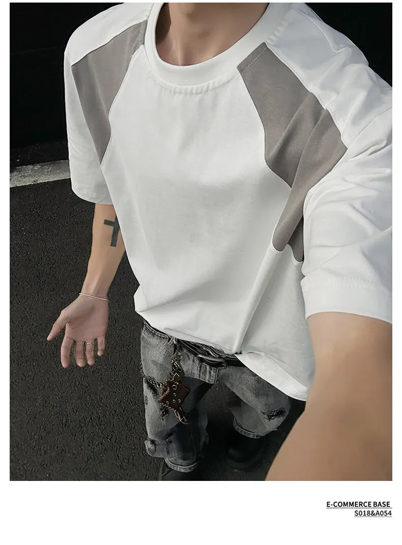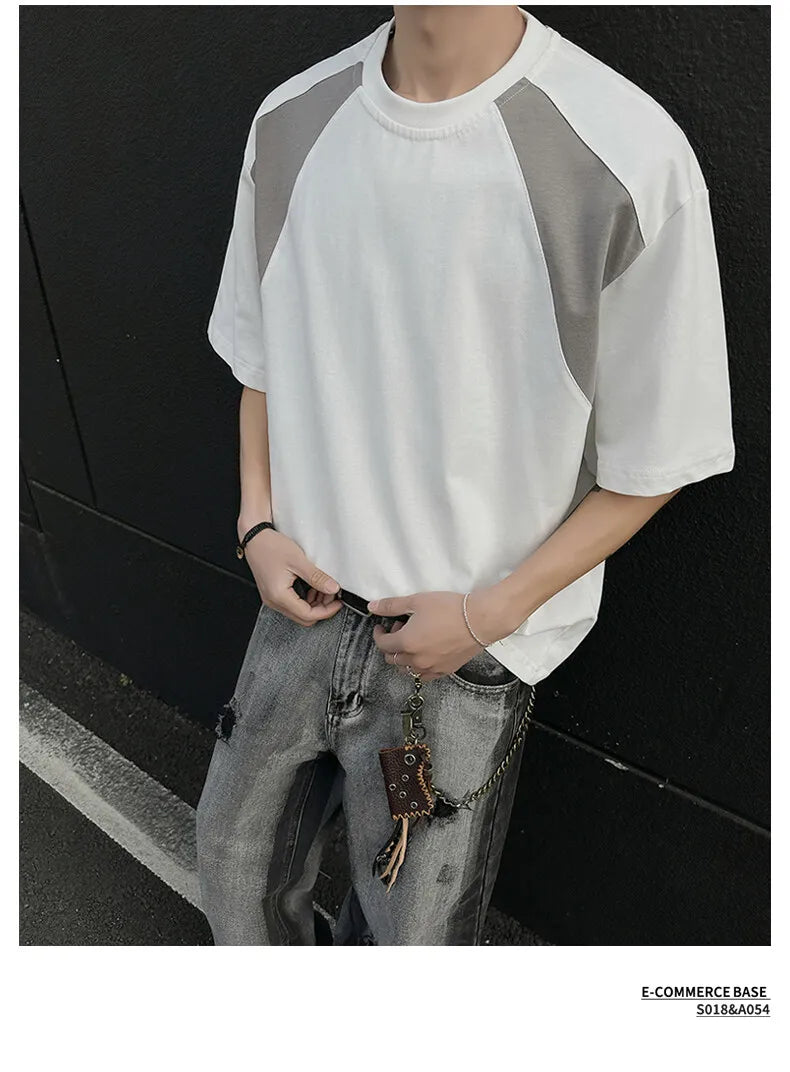 Mens Breathable Cotton Tshirt man Soft Summer Casual Slim Fit Contrast Panel Simpl Design Streetwear Fashion Tee Line Texture