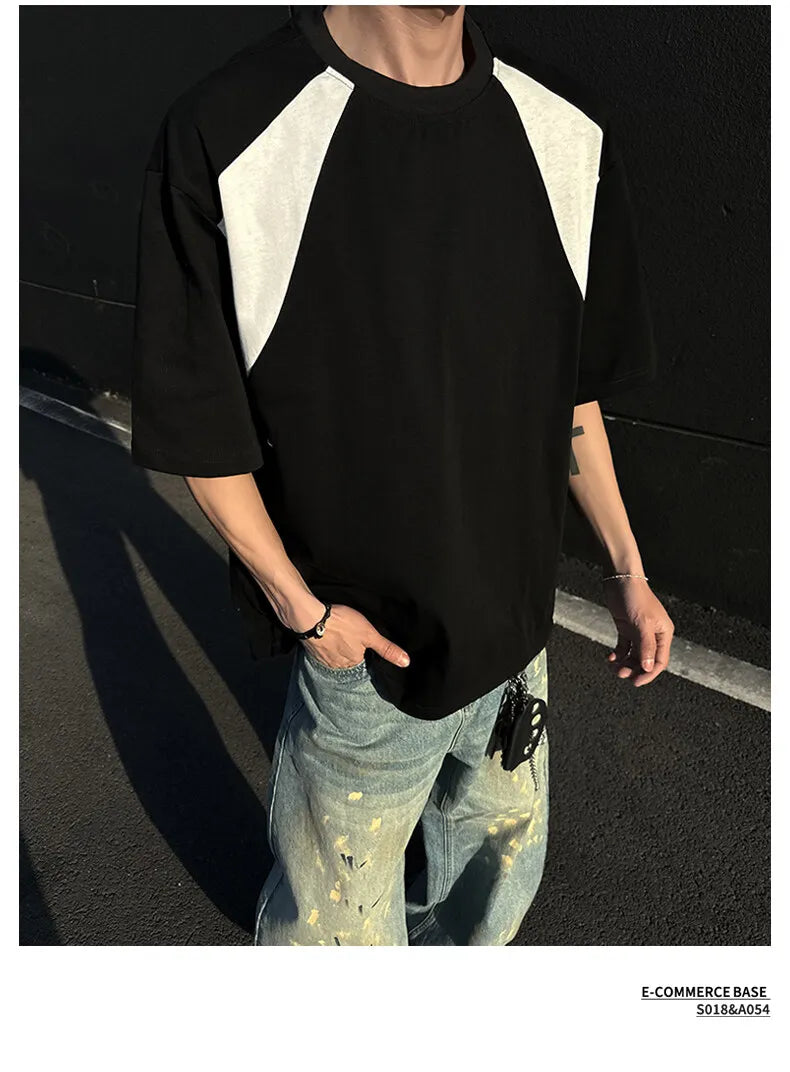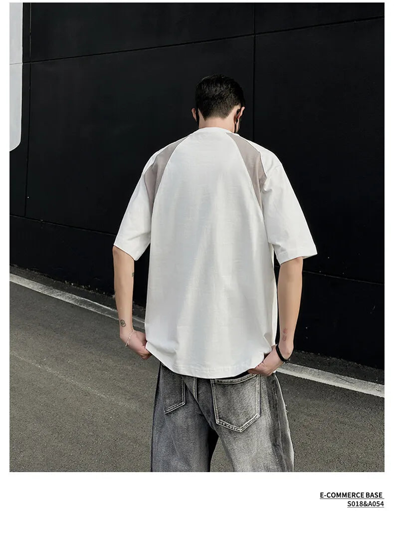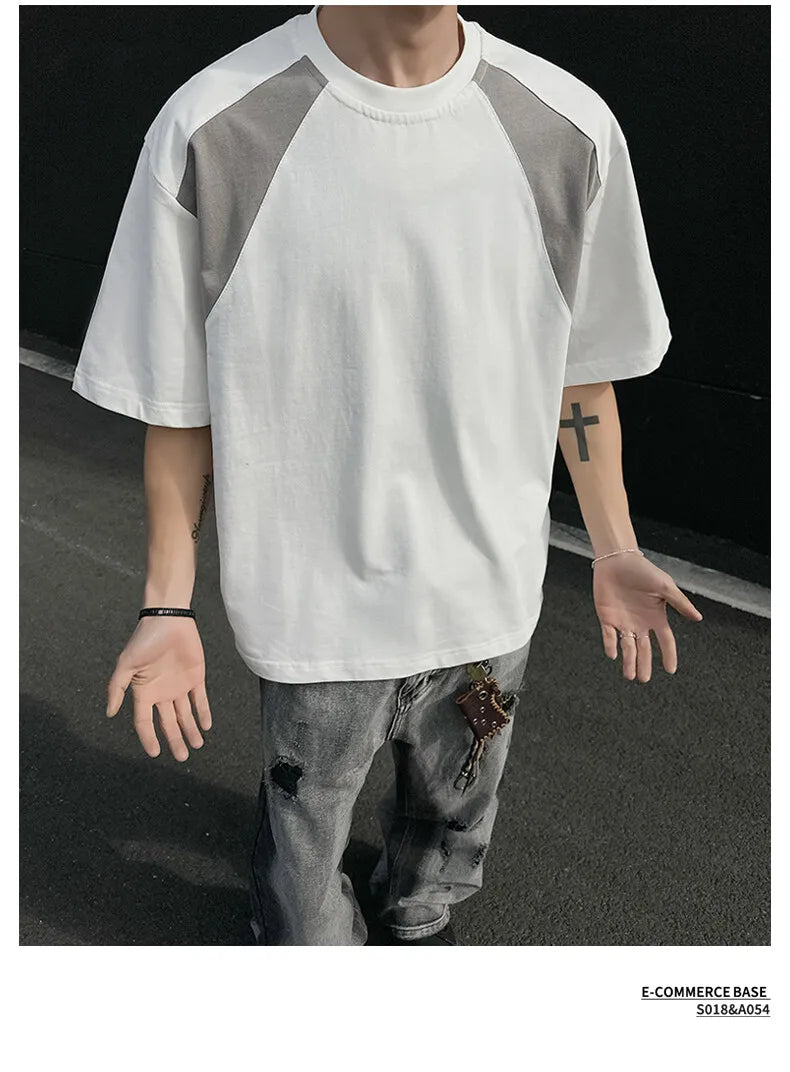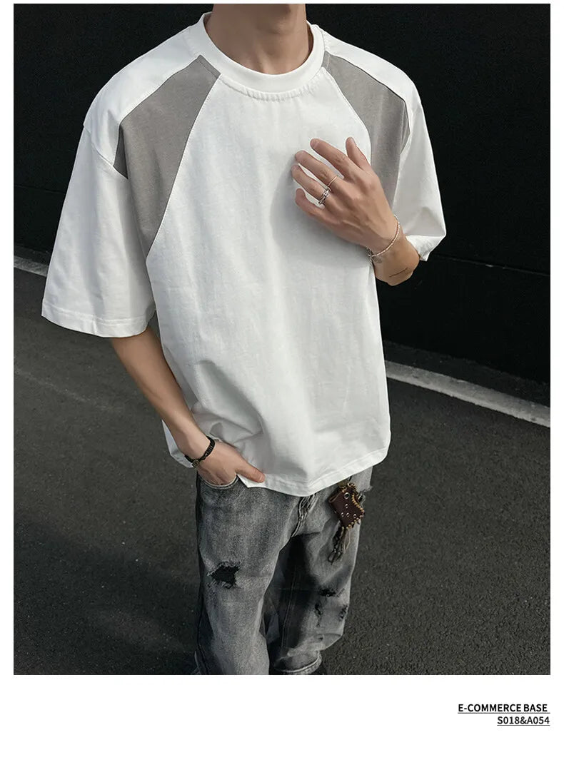 Mens Breathable Cotton Tshirt man Soft Summer Casual Slim Fit Contrast Panel Simpl Design Streetwear Fashion Tee Line Texture