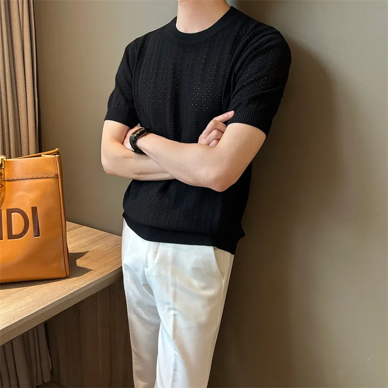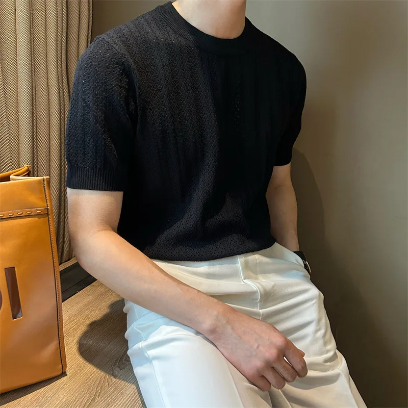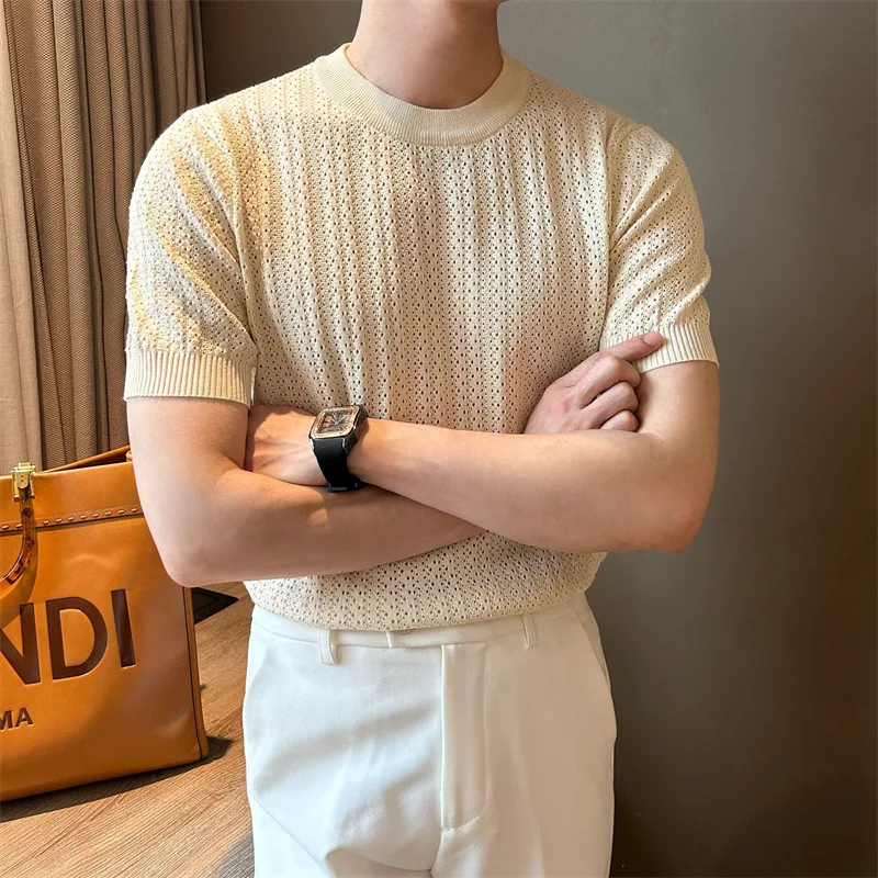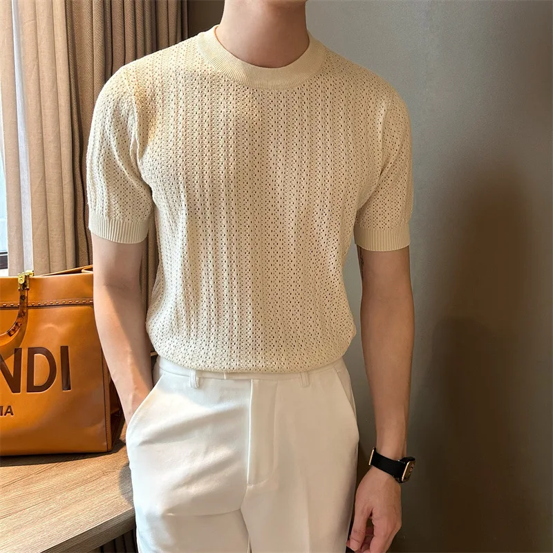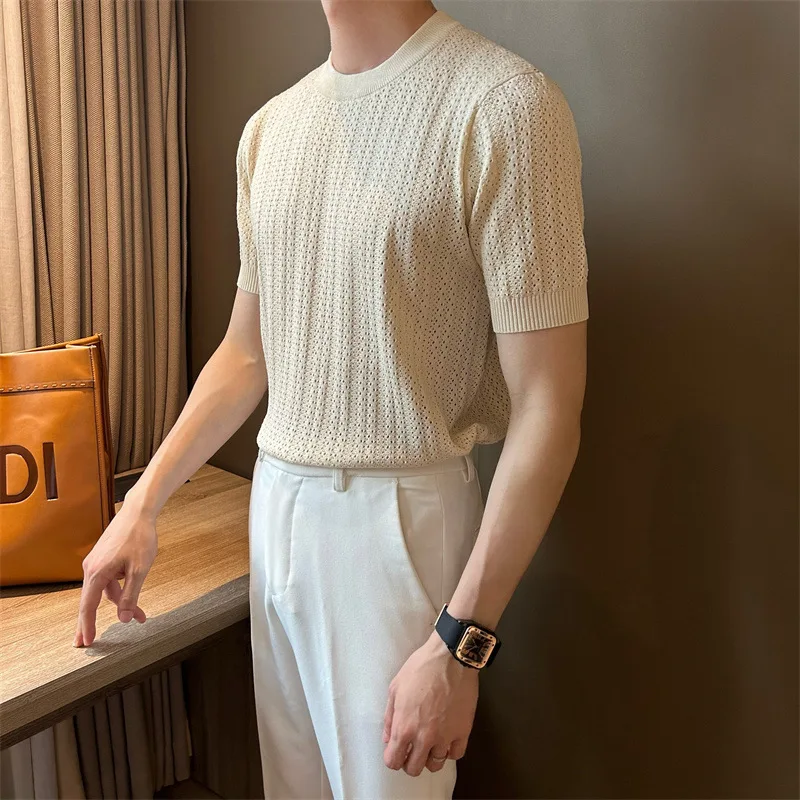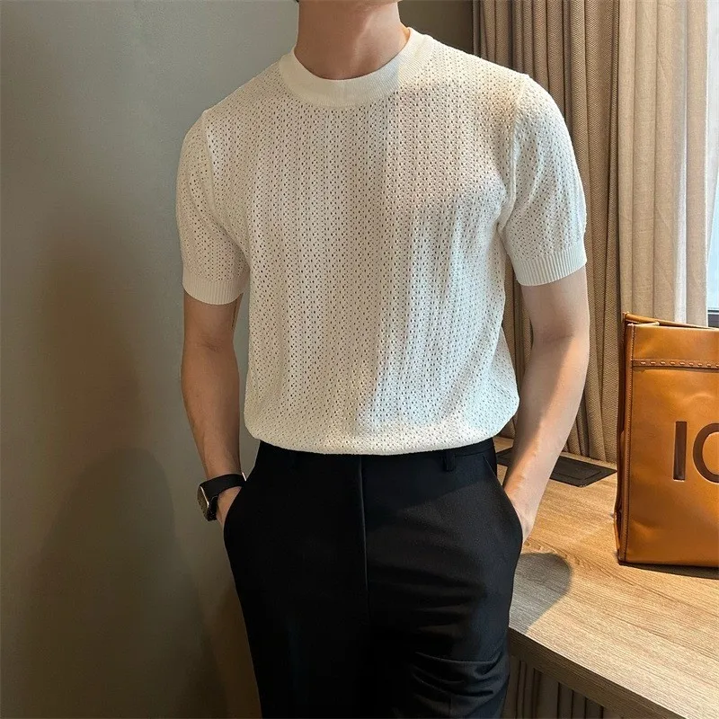 Men's Clothing Fashion Hollow Out Tops Knit Luxury O Neck Short-sleeved T-shirt Leisure Korean Popular Retro Slim-fit Knitwear