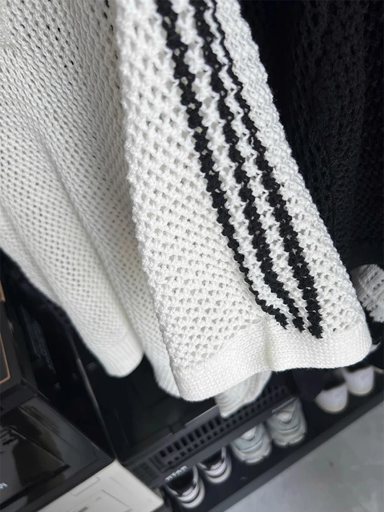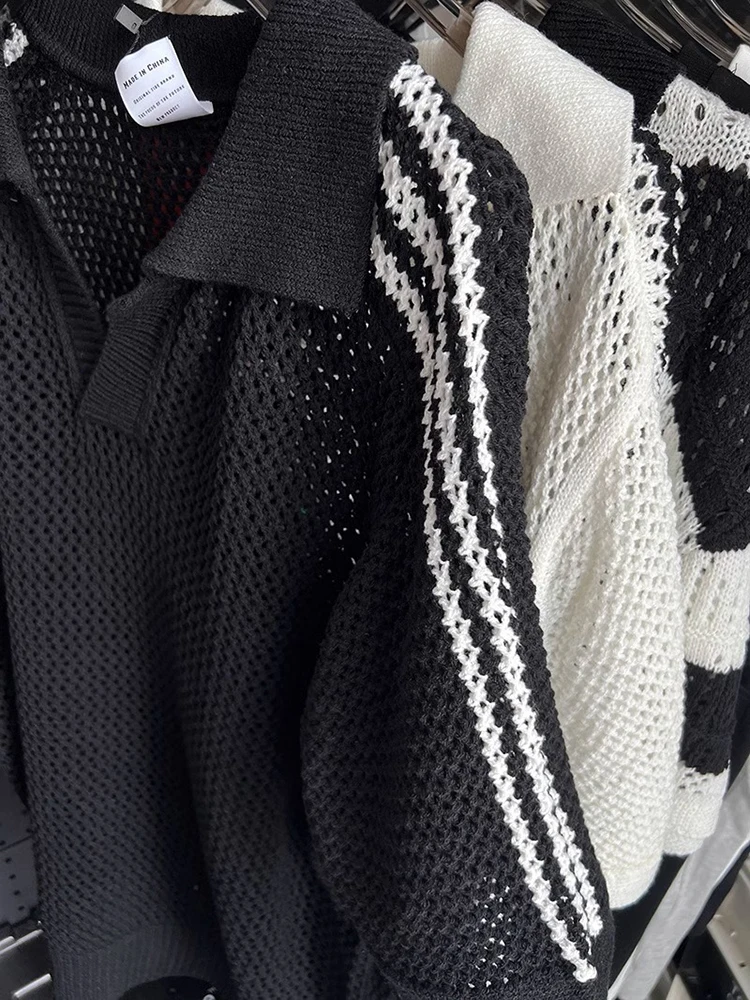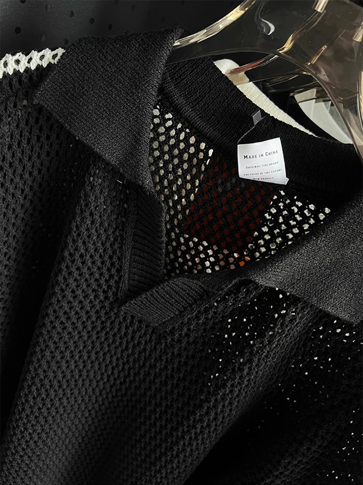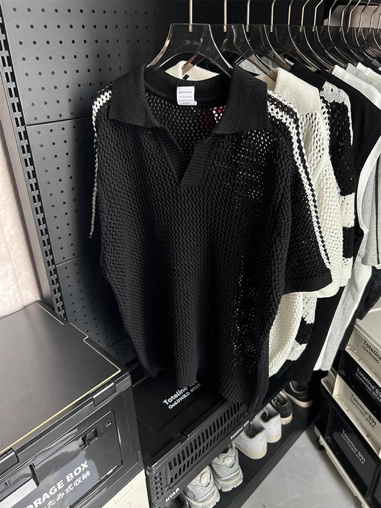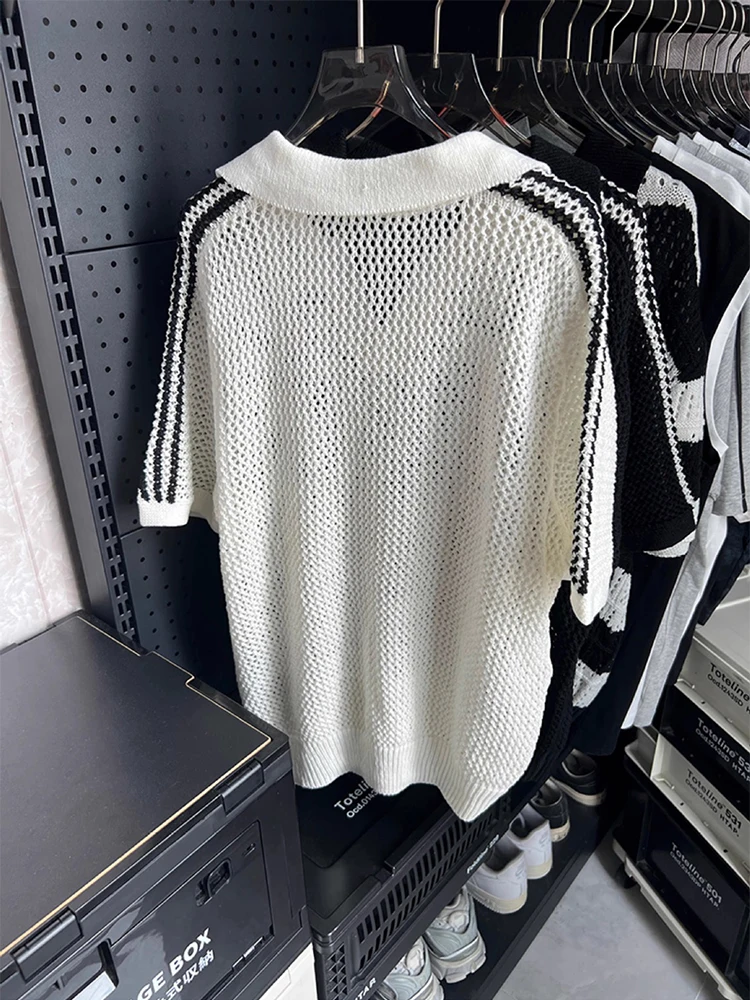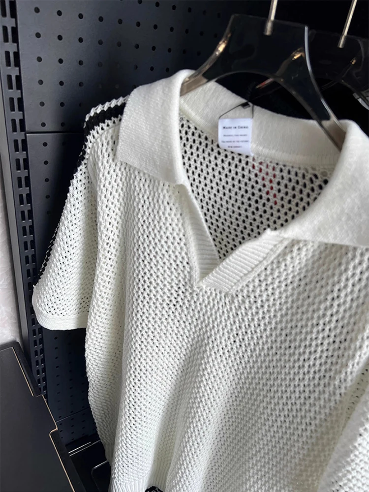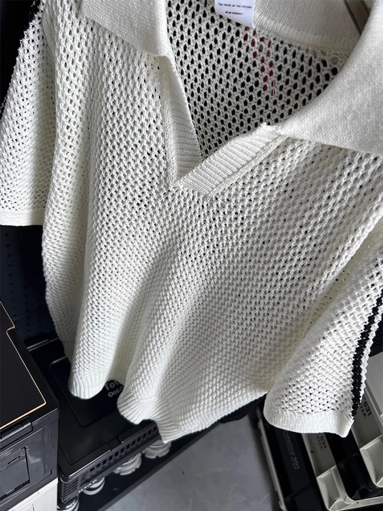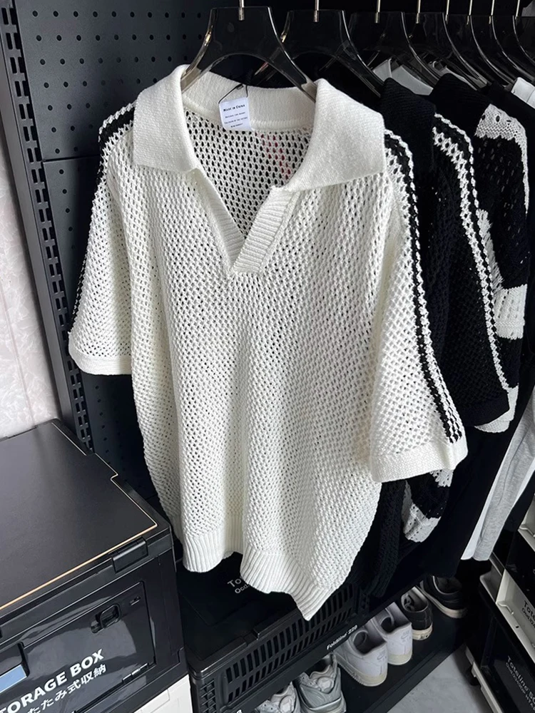 Mens Hollow Out Mesh Knit Tops Summer Stylish Striped Short Sleeve Knitting Polo Shirt For Men Casual Knitted Polo