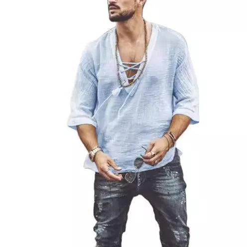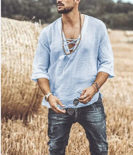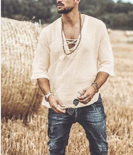 Men's T-shirt Short Sleeve Chest Lace-up T-shirt Loose Top Summer V-Neck Medieval Tunic Top