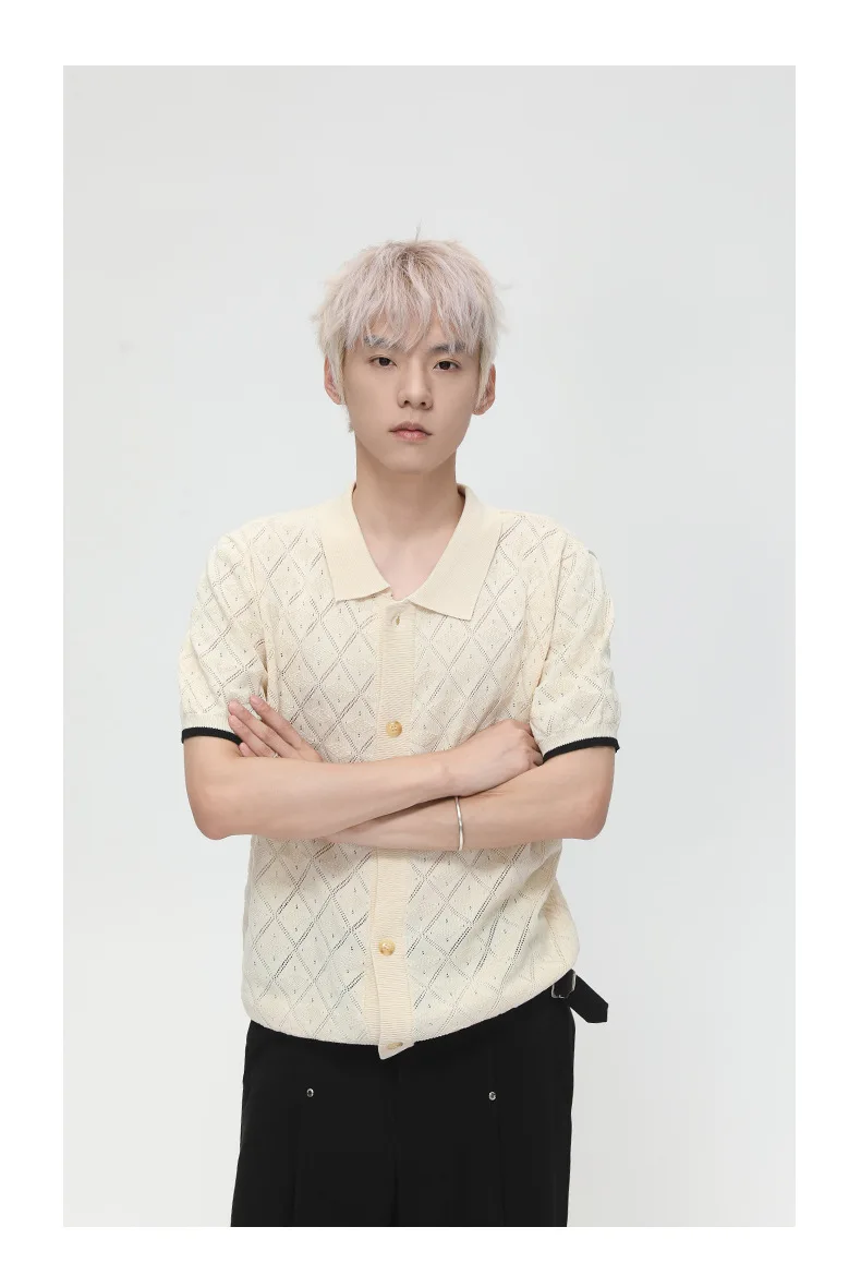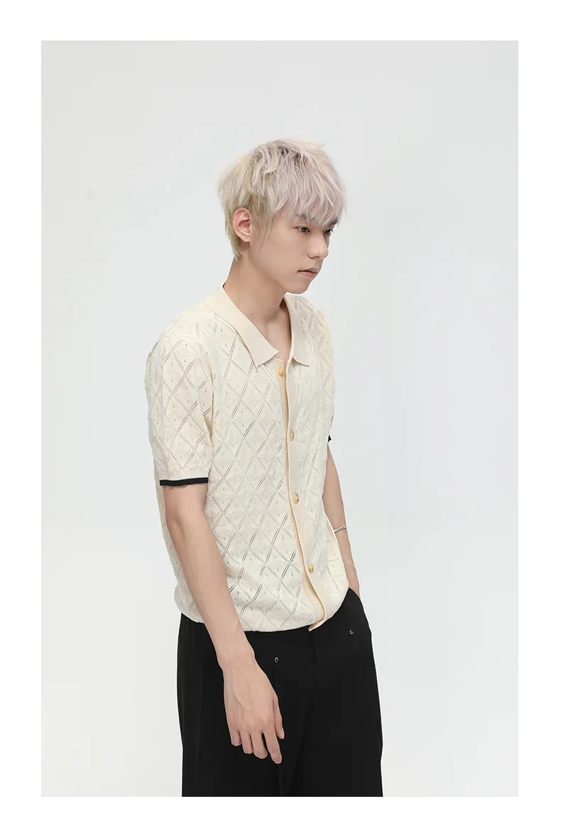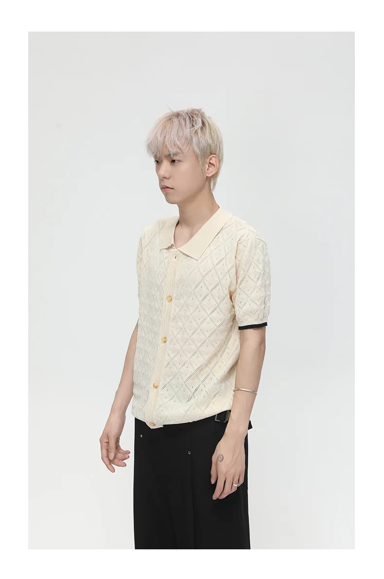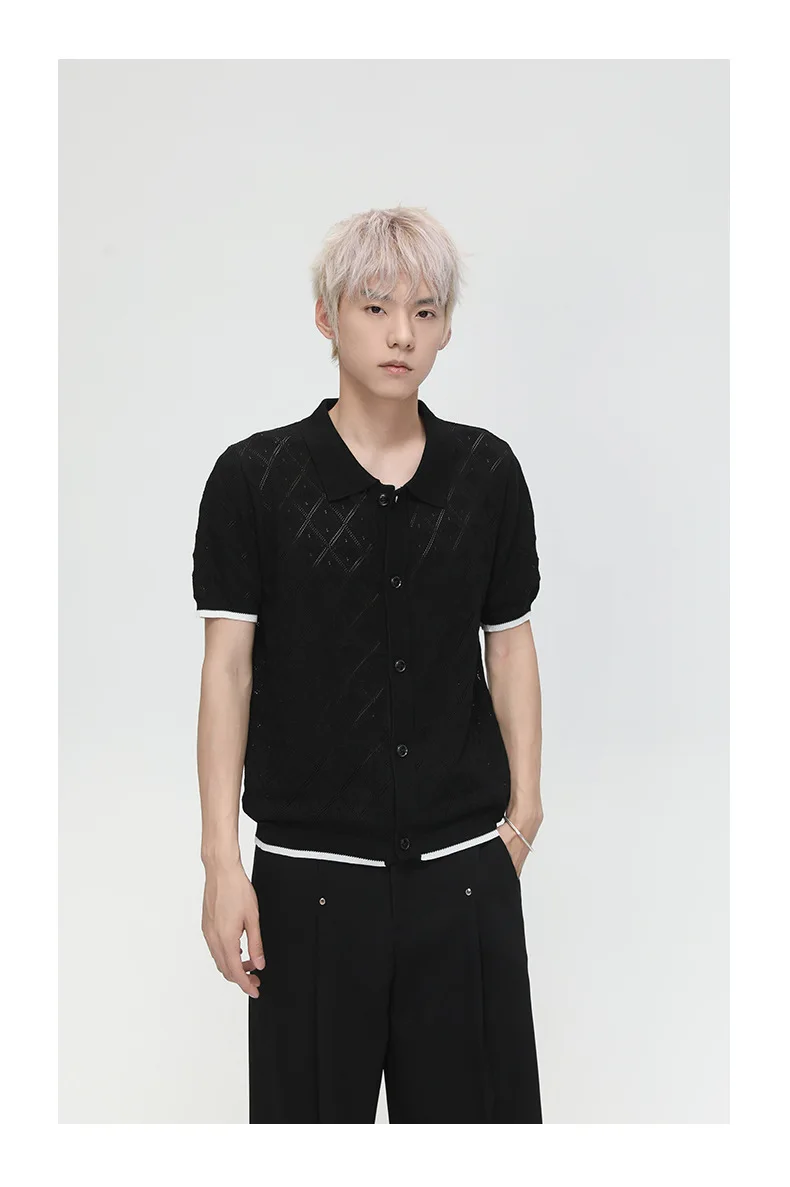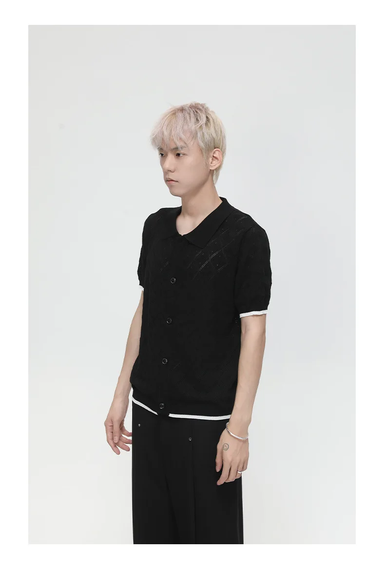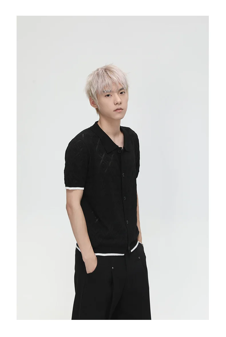 Niche Design Men's T-shirt Turn-down Collar Contrast Color Knitting Hollow Out Short Sleeve Single Breasted Male Tee