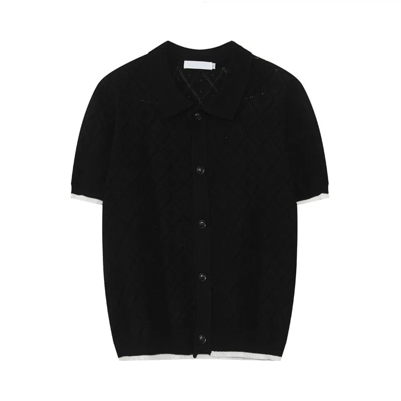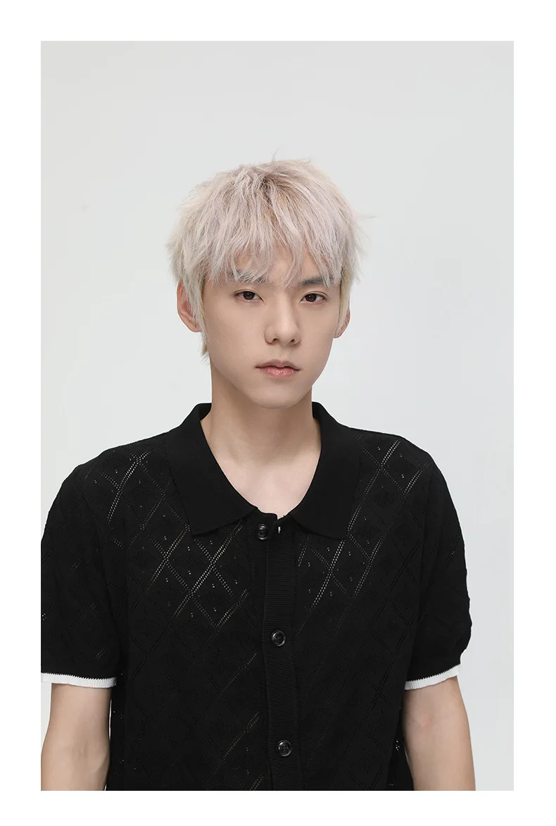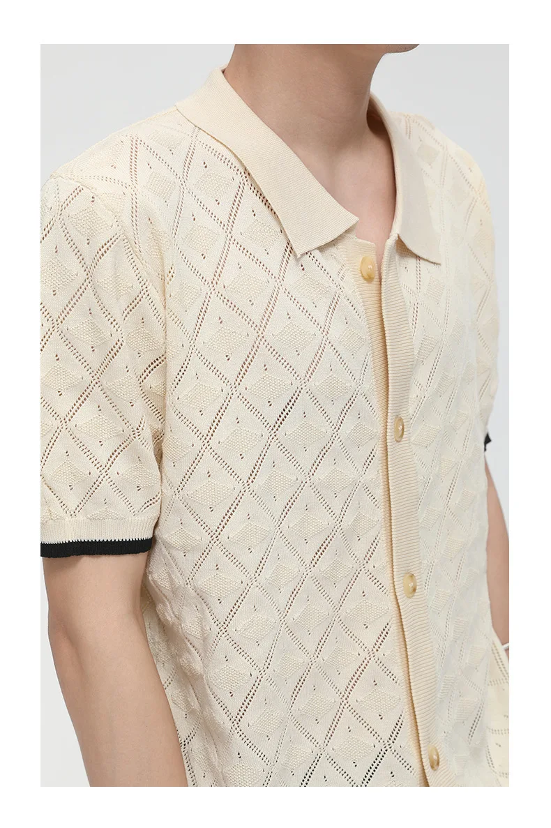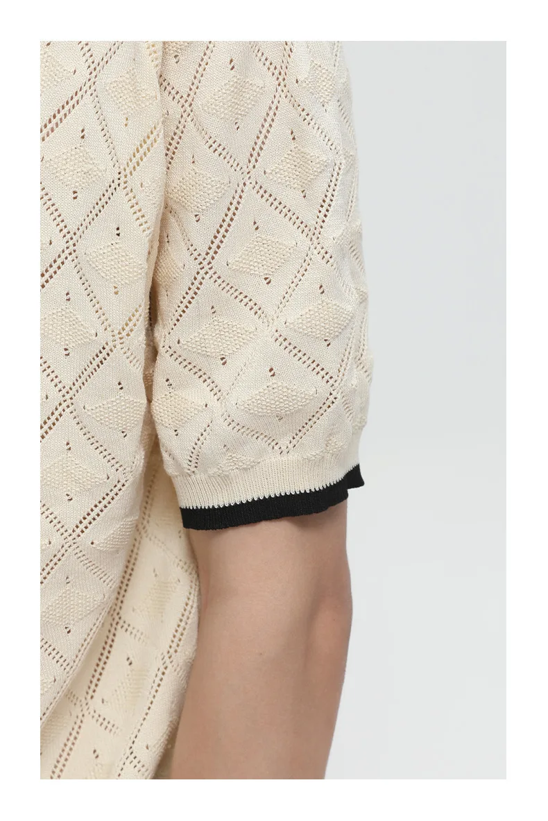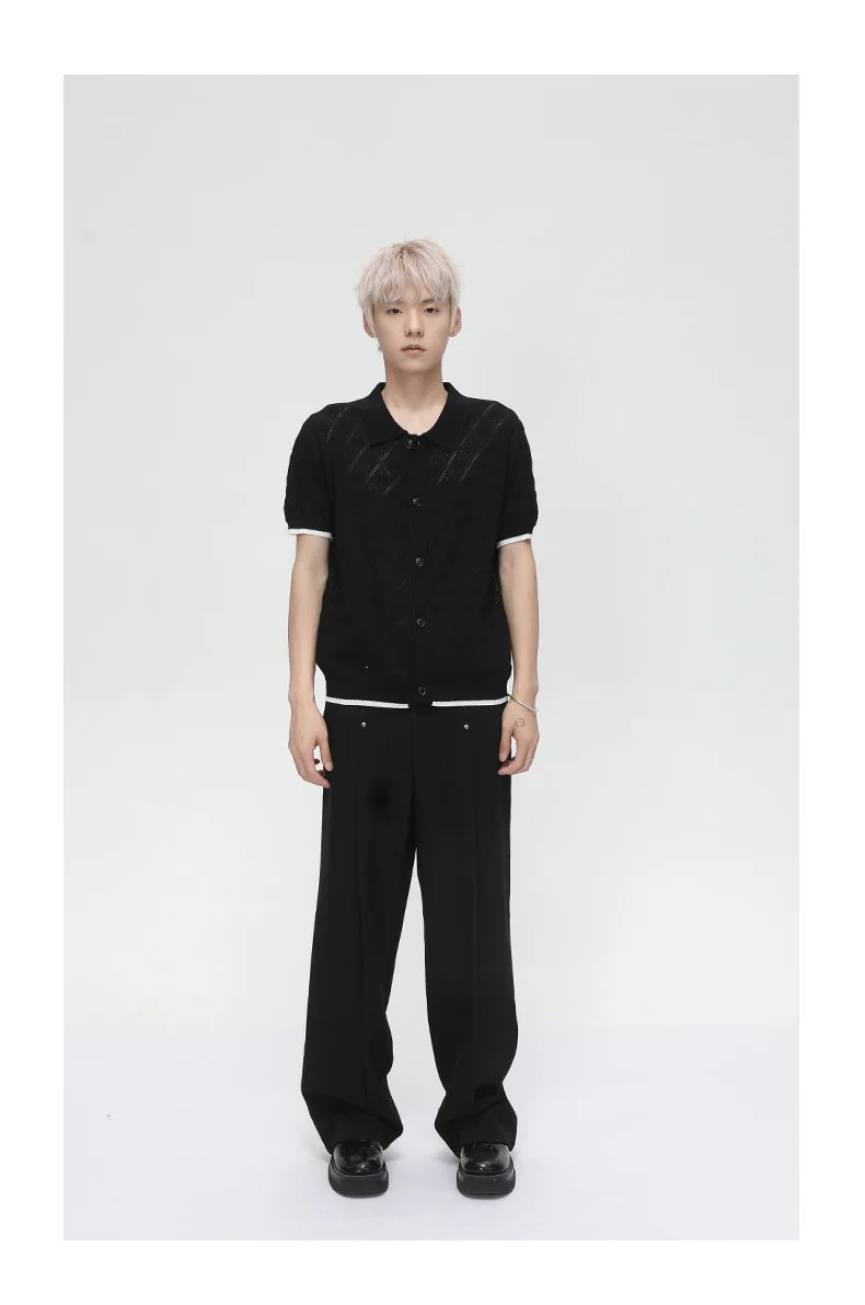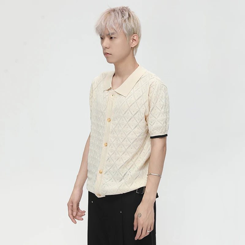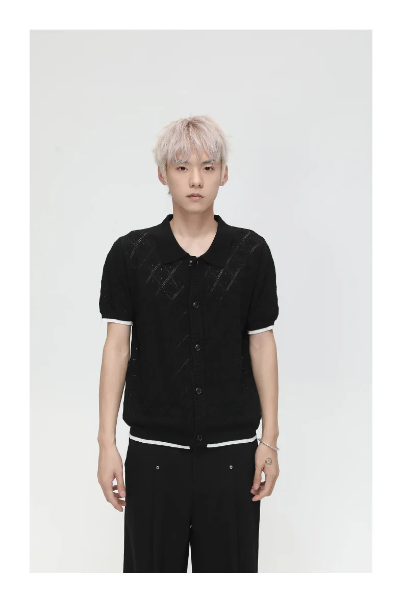 Niche Design Men's T-shirt Turn-down Collar Contrast Color Knitting Hollow Out Short Sleeve Single Breasted Male Tee