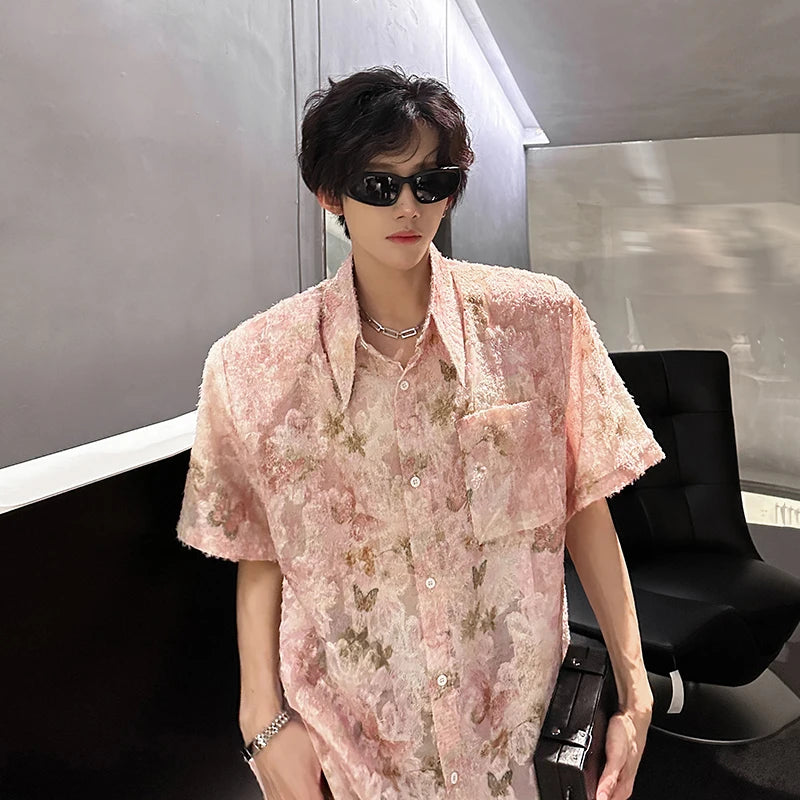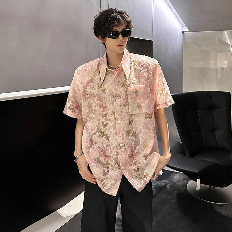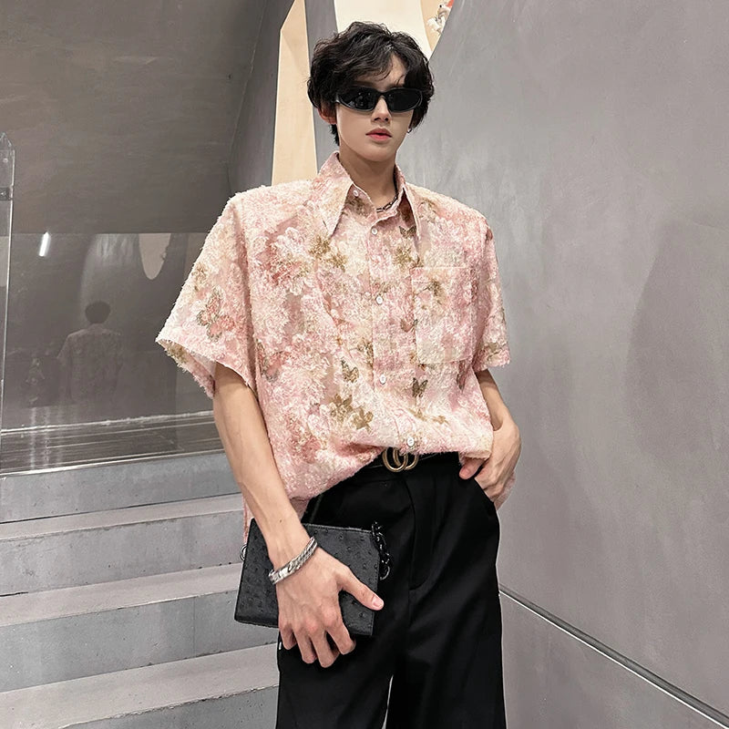 Pink Butterfly Tassel Shirt Men Front Pocket Summer Loose Casual Floral Short Sleeve Shirts Oversize Streetwear Boy Girl Blouses