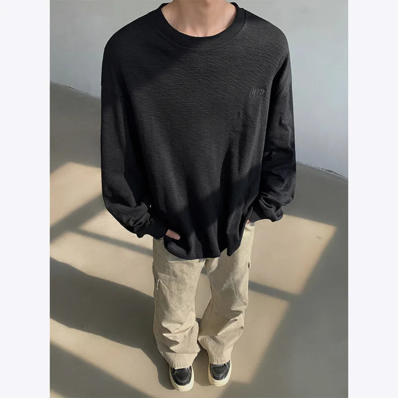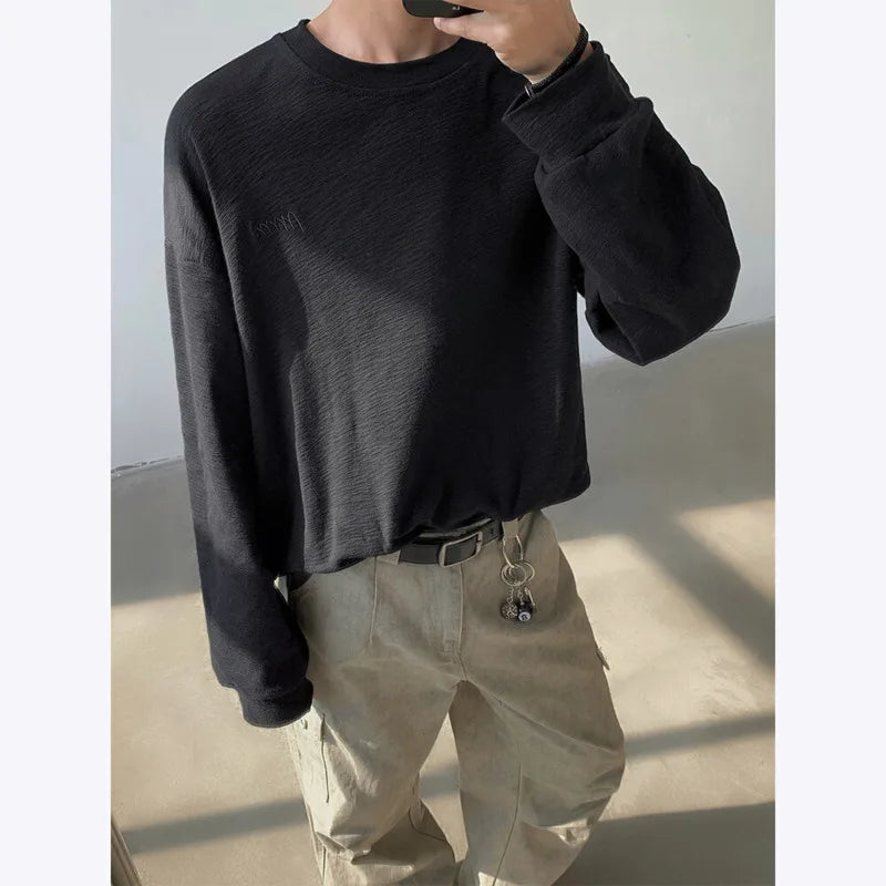 Spring Cotton Long Sleeved T-shirt Men Black White Casual T Shirt Men Streetwear Korean Loose Round Neck T Shirt Mens Top M-3XL