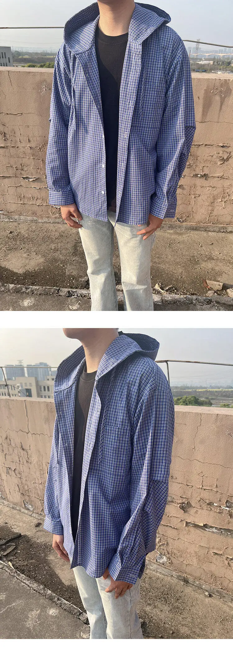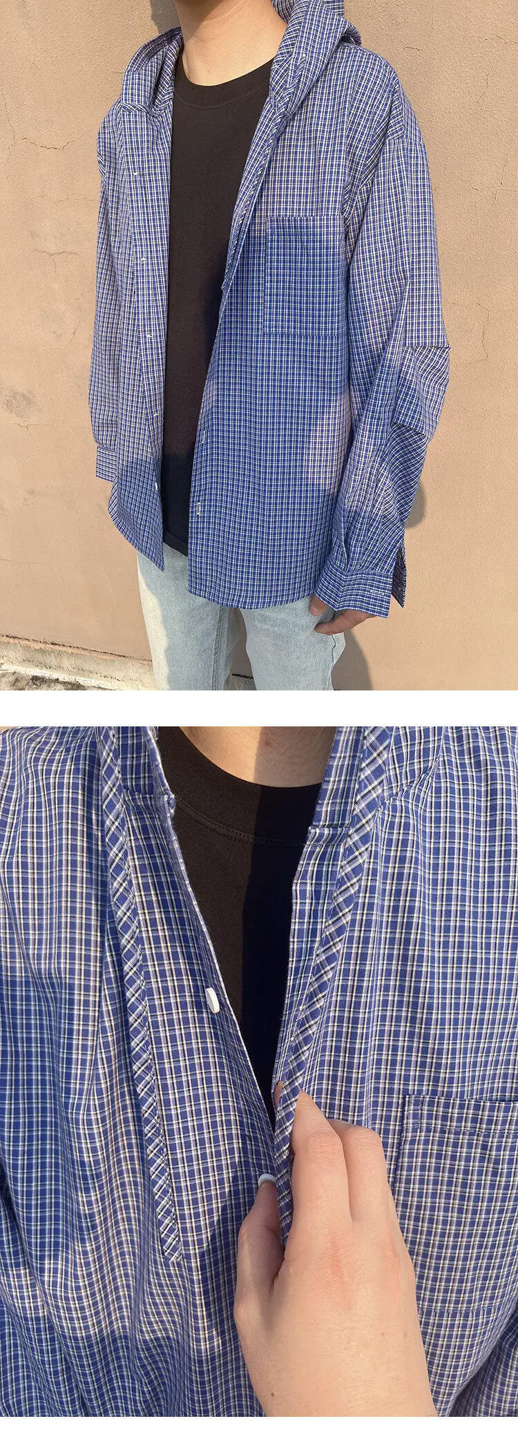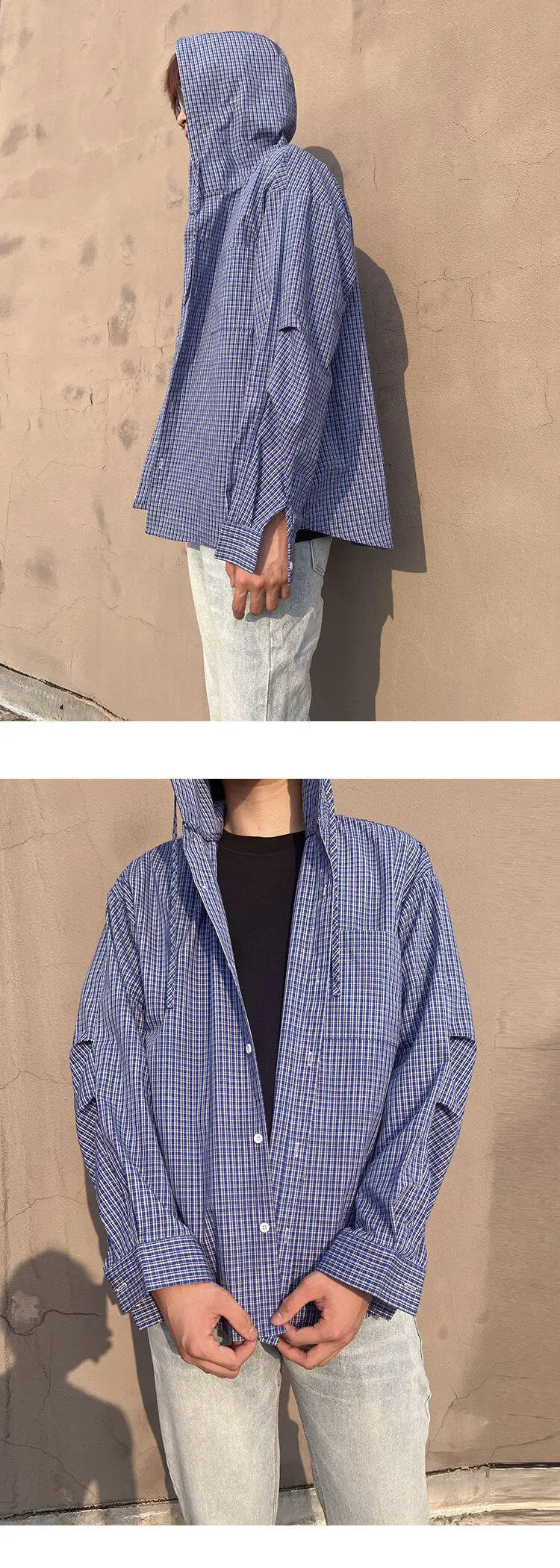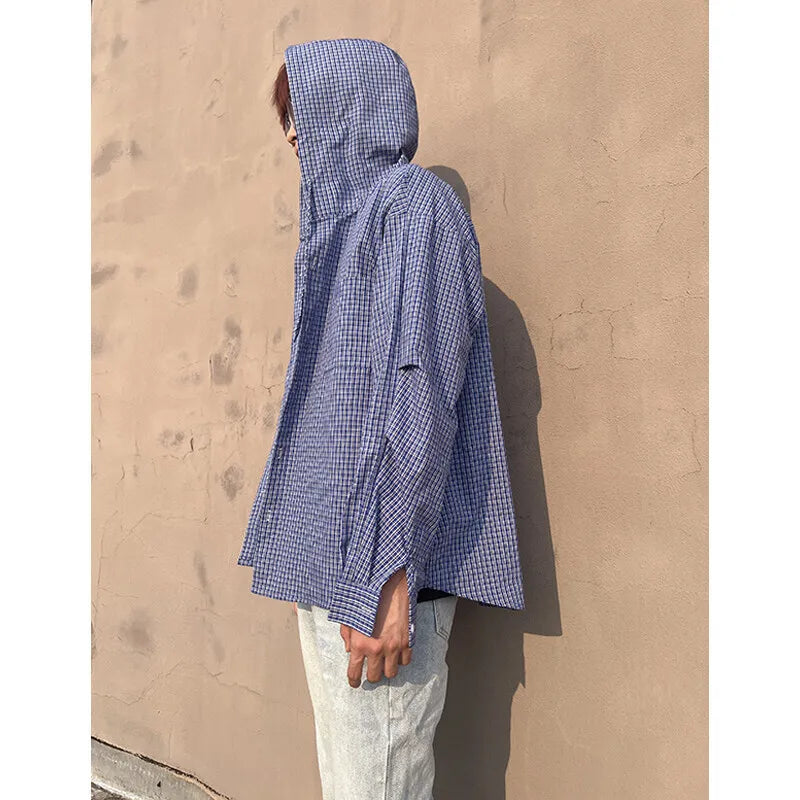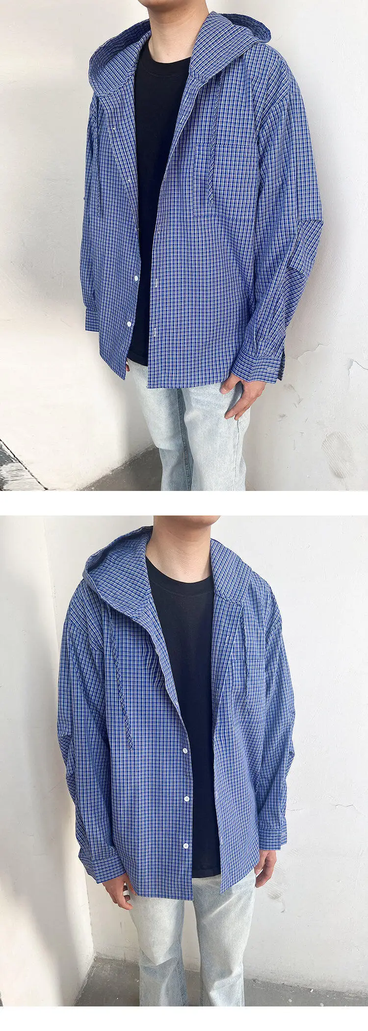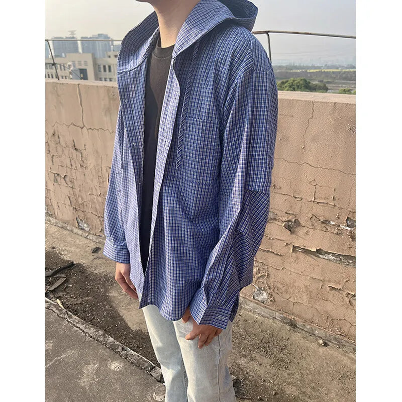 Spring Long Sleeved Shirt Men Oversized Blue Casual Shirt Mens Streetwear Korean Loose Hooded Shirt Man Fashion Shirts M-2XL