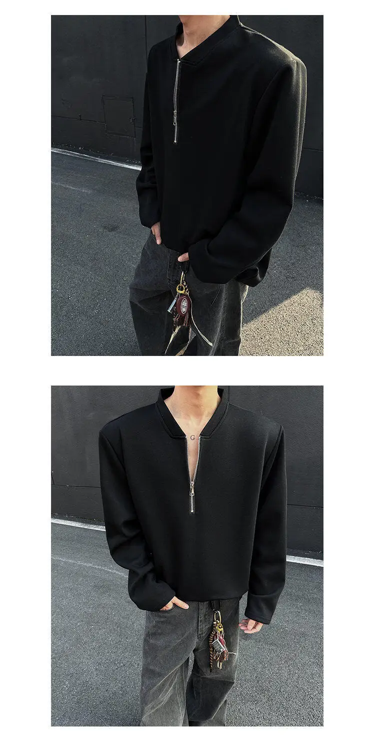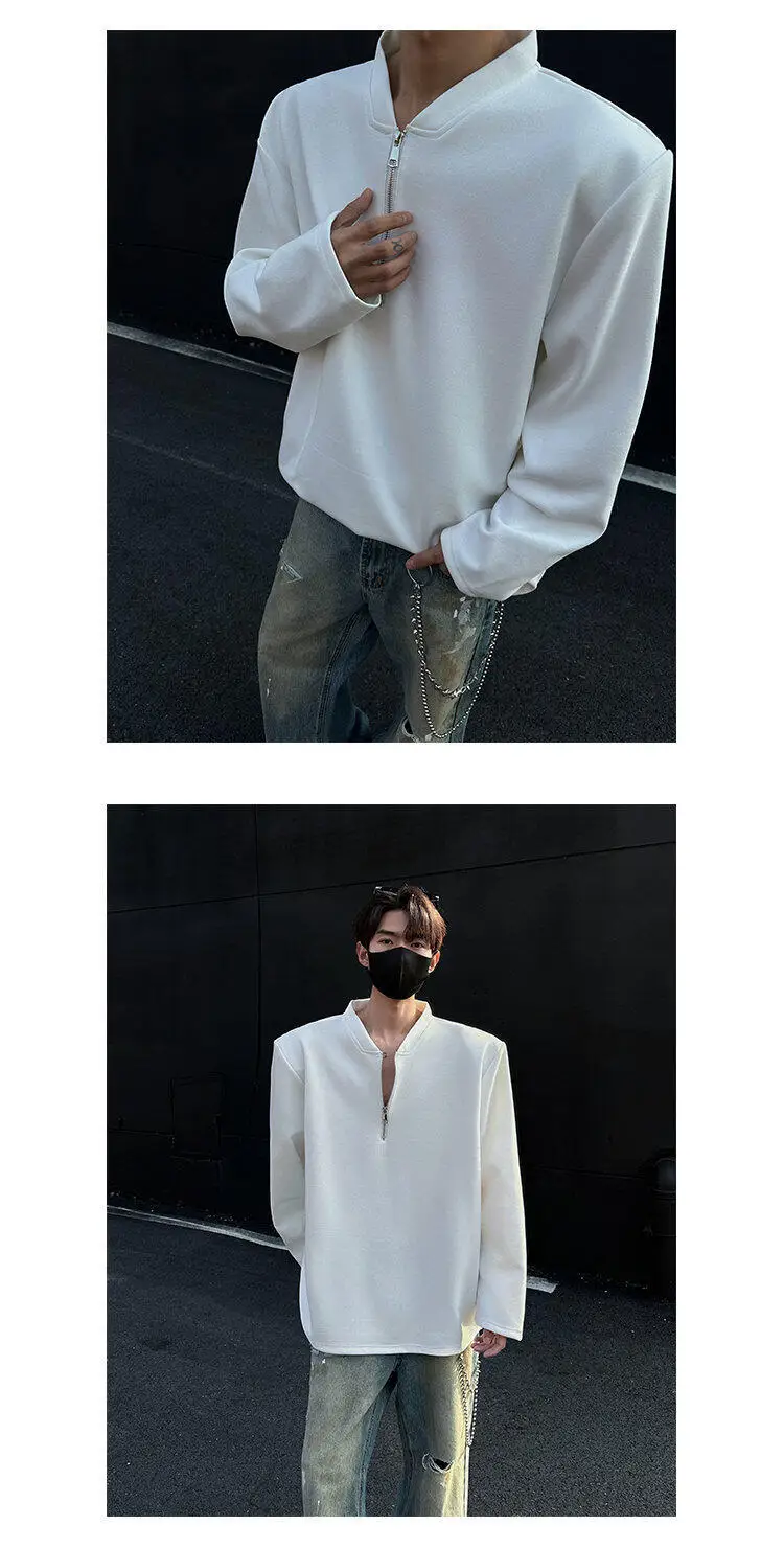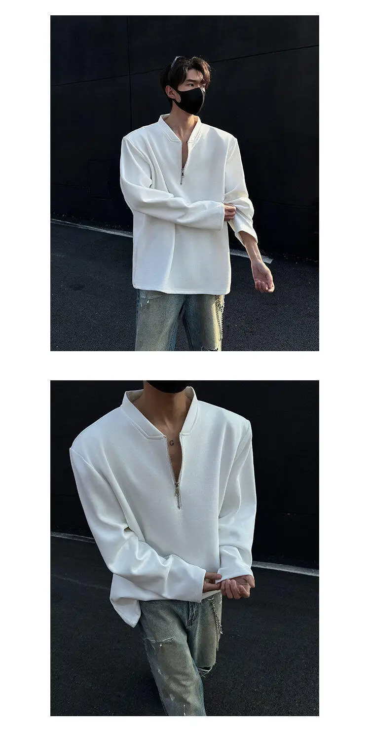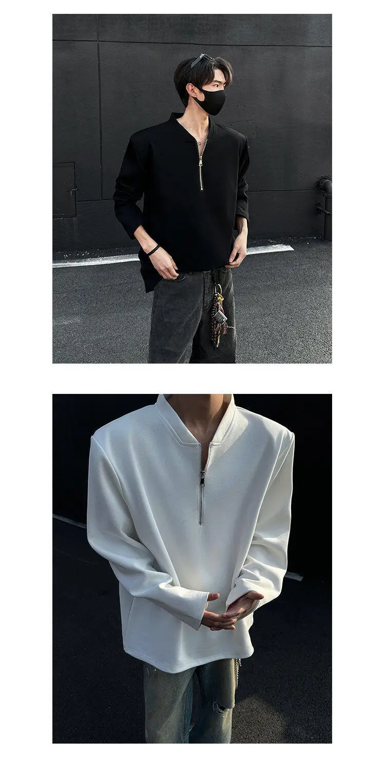 Spring Long Sleeved T-shirt Men Black White Casual Zipper T Shirt Men Streetwear Korean Loose Shoulder Pad T Shirt Mens Top