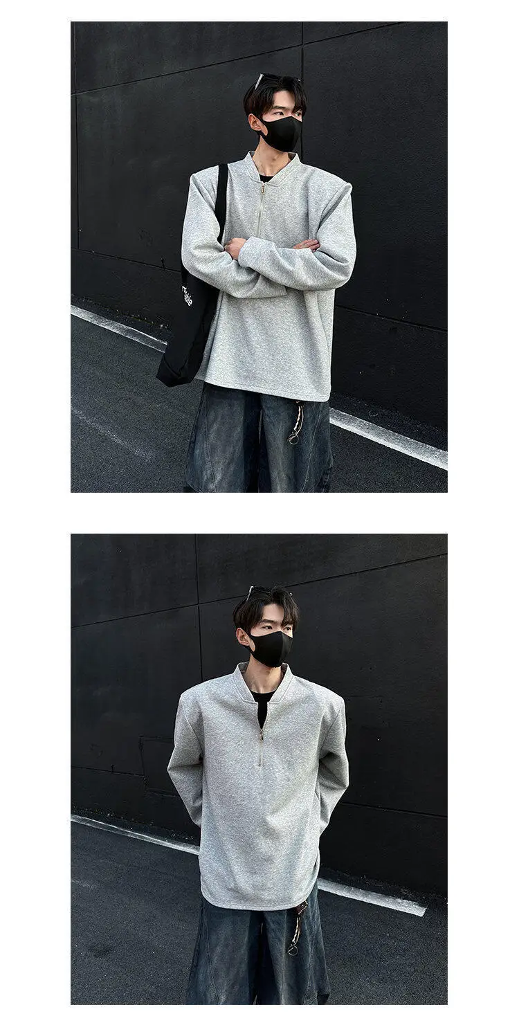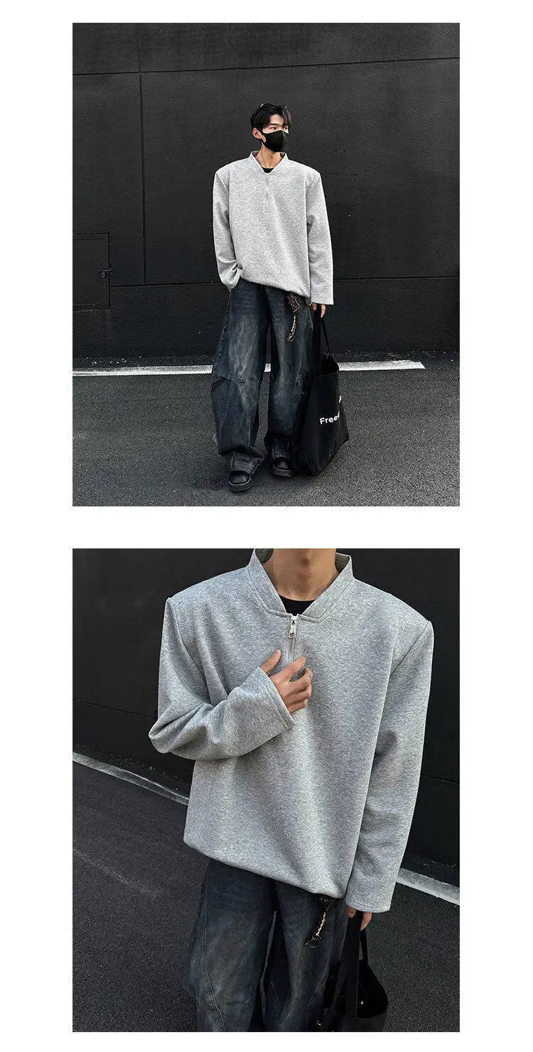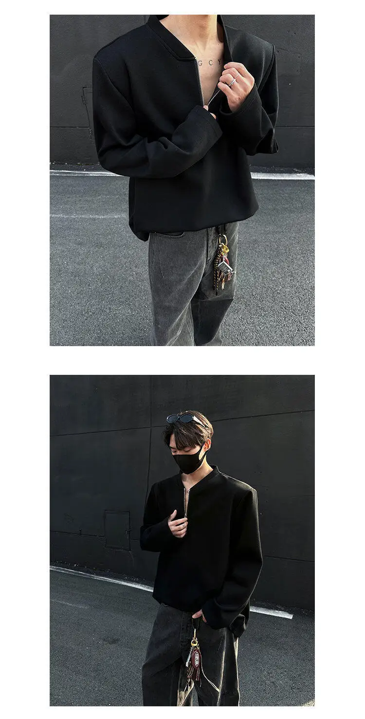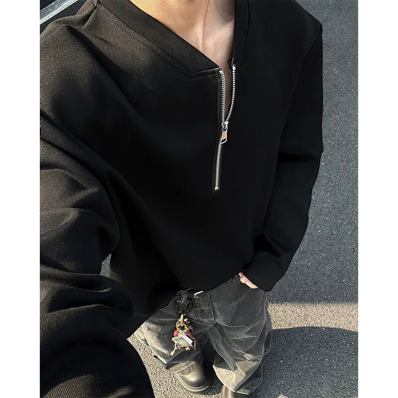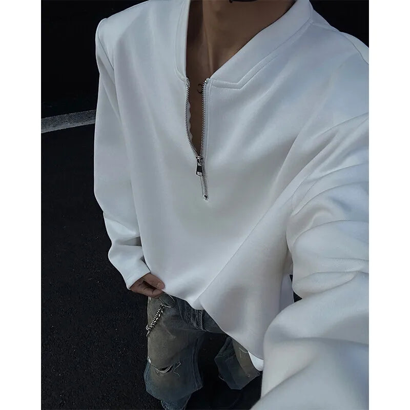 Spring Long Sleeved T-shirt Men Black White Casual Zipper T Shirt Men Streetwear Korean Loose Shoulder Pad T Shirt Mens Top