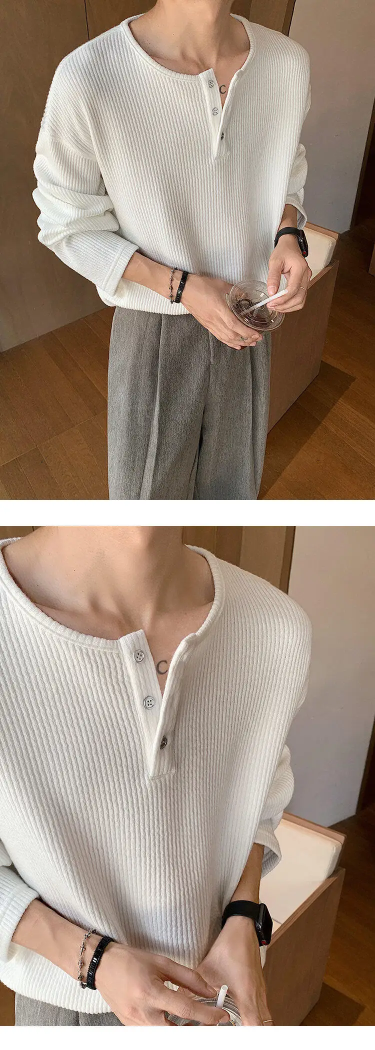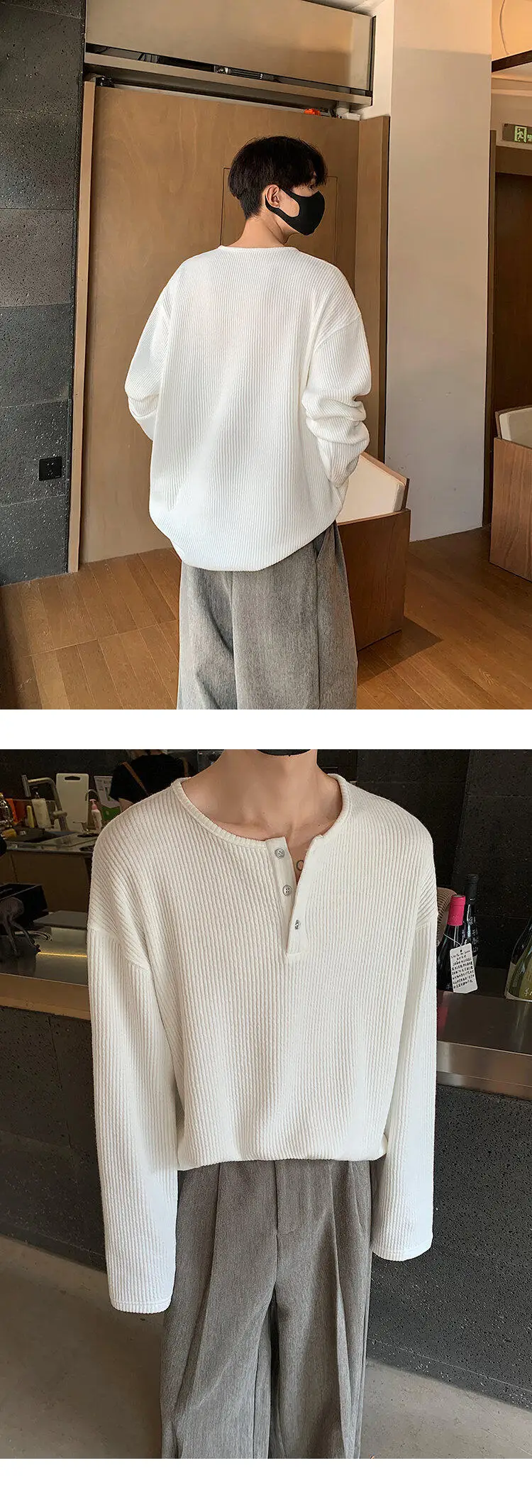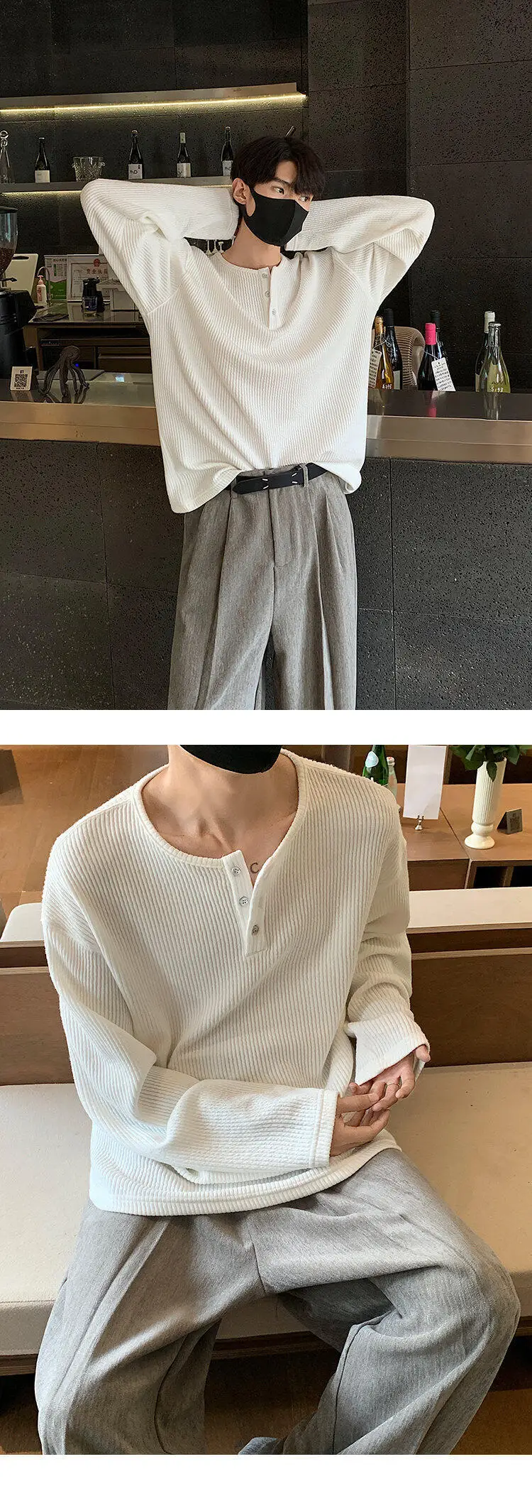 Spring Long Sleeved T-shirt Men Fashion Button White Casual T Shirt Men Streetwear Korean Loose Pleated T Shirt Mens Top M-2XL