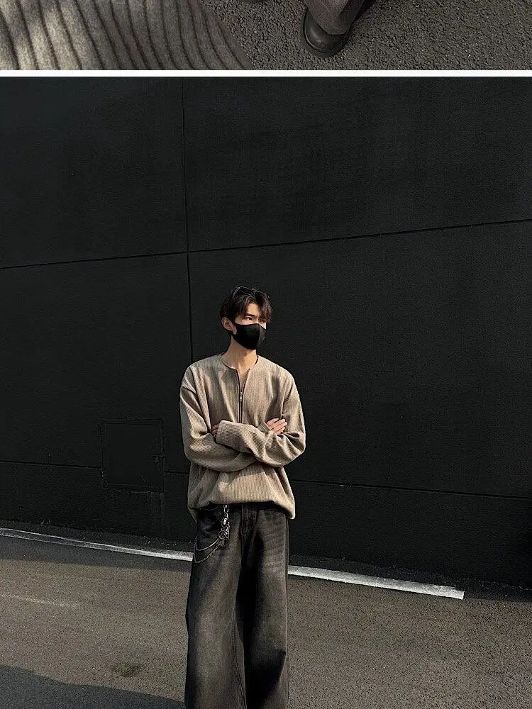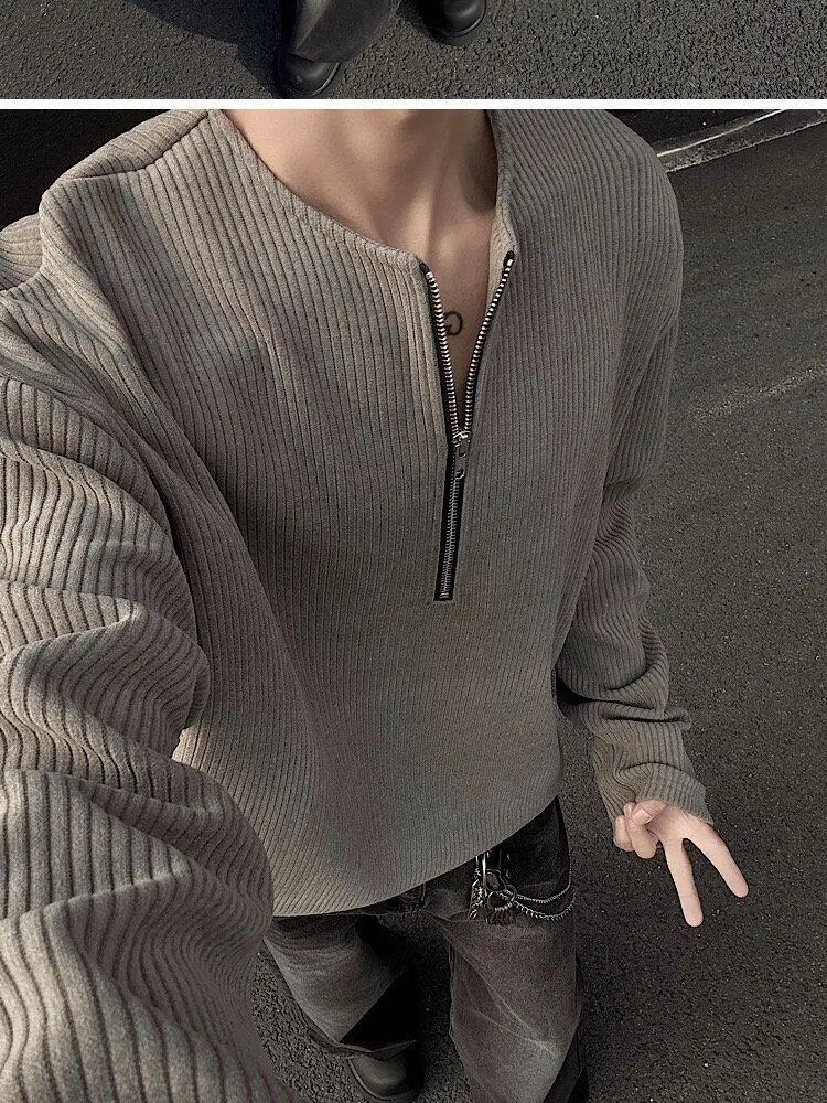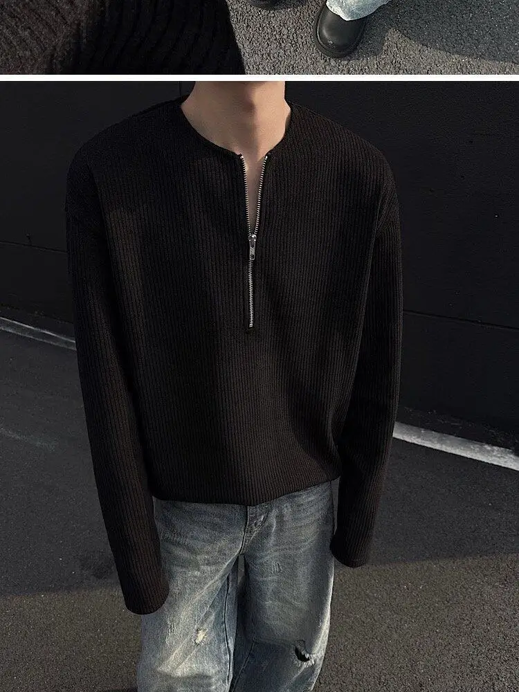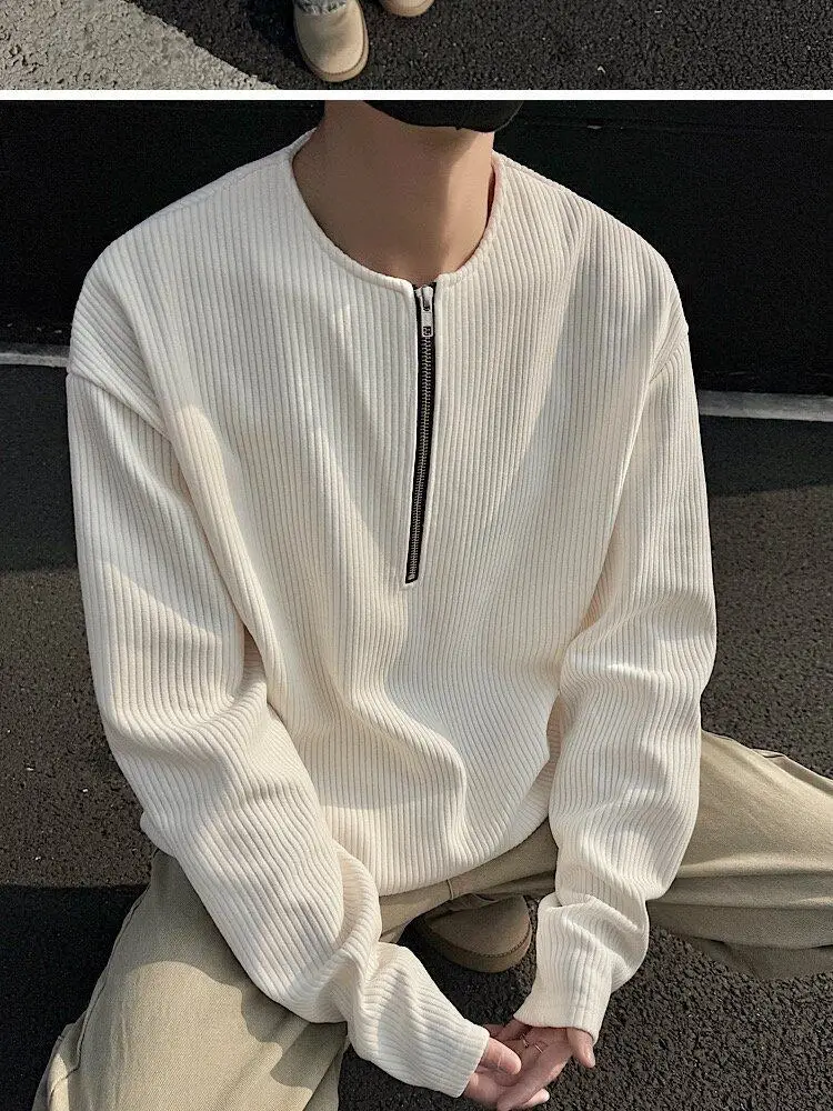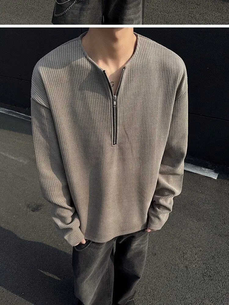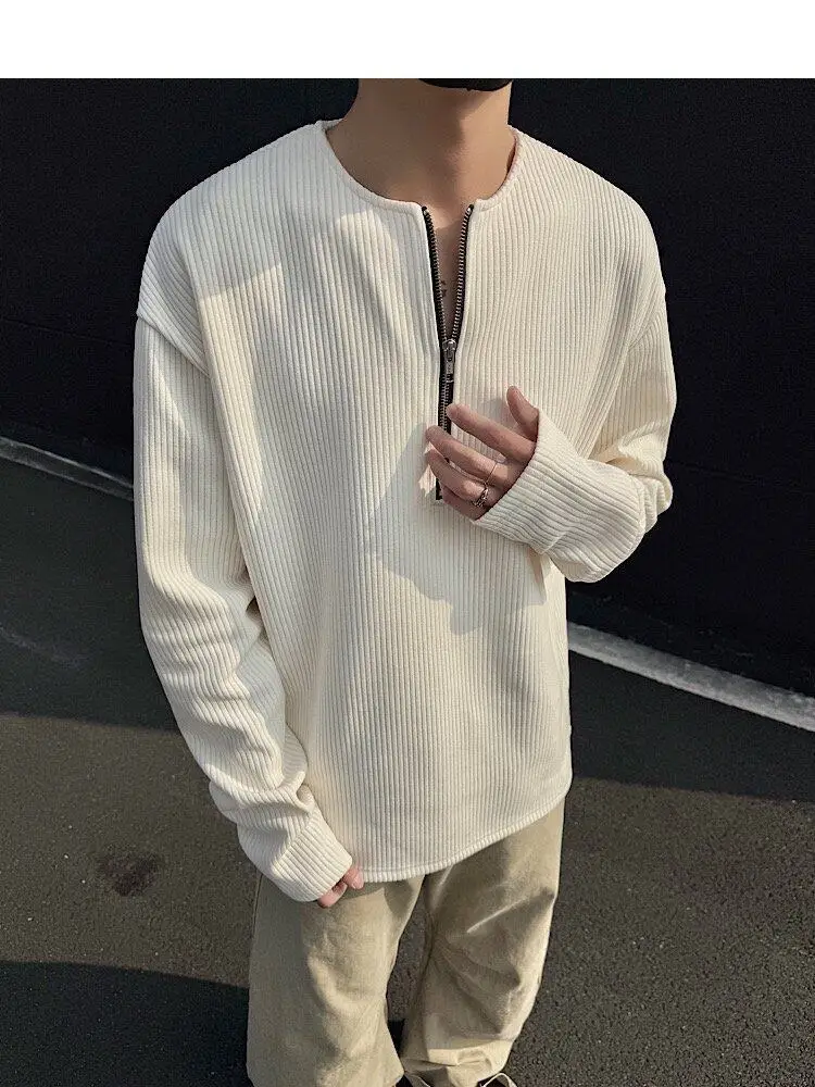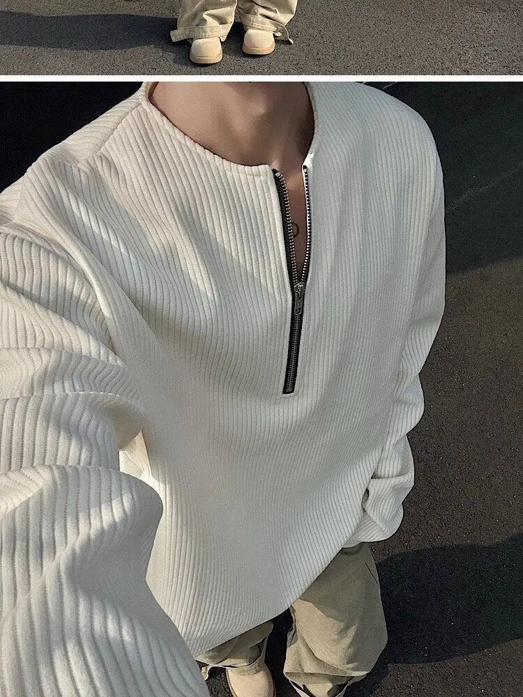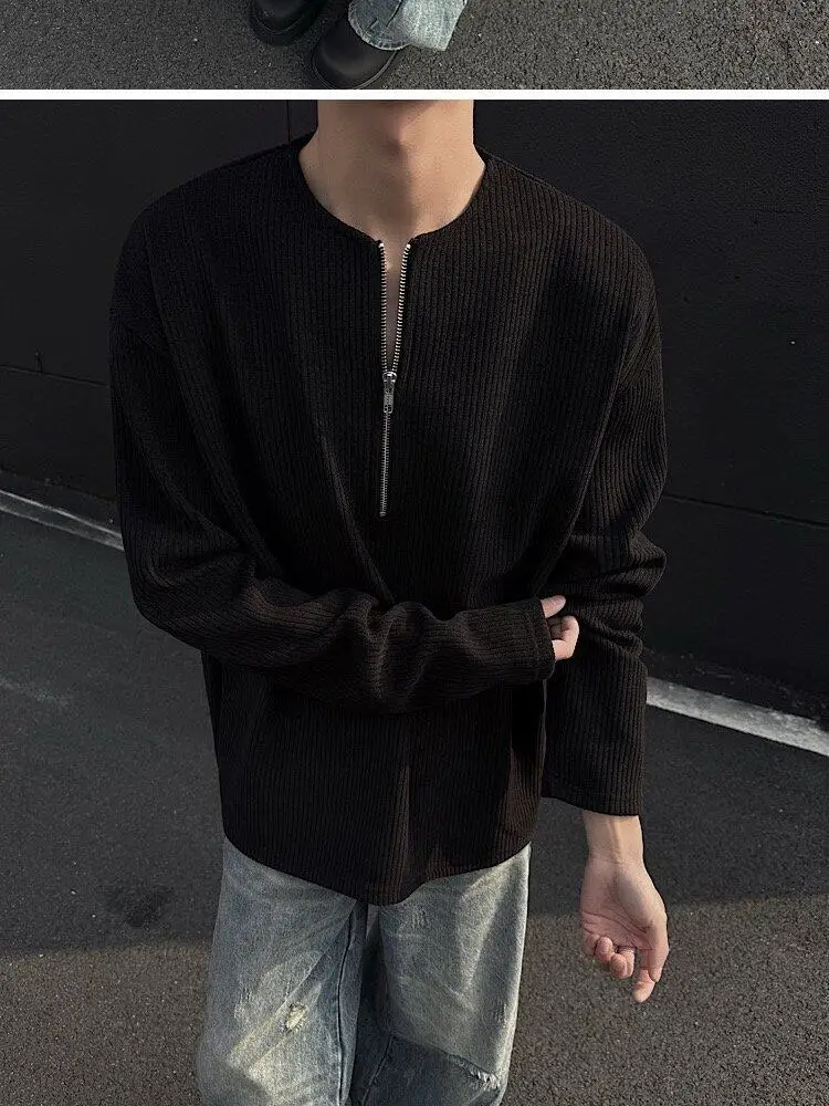 Spring Long Sleeved T-shirt Men Oversized Zipper Round Neck T Shirt Men Streetwear Korean Loose Pleated T Shirt Mens Top M-3XL