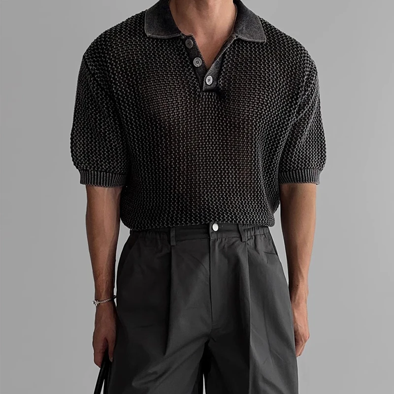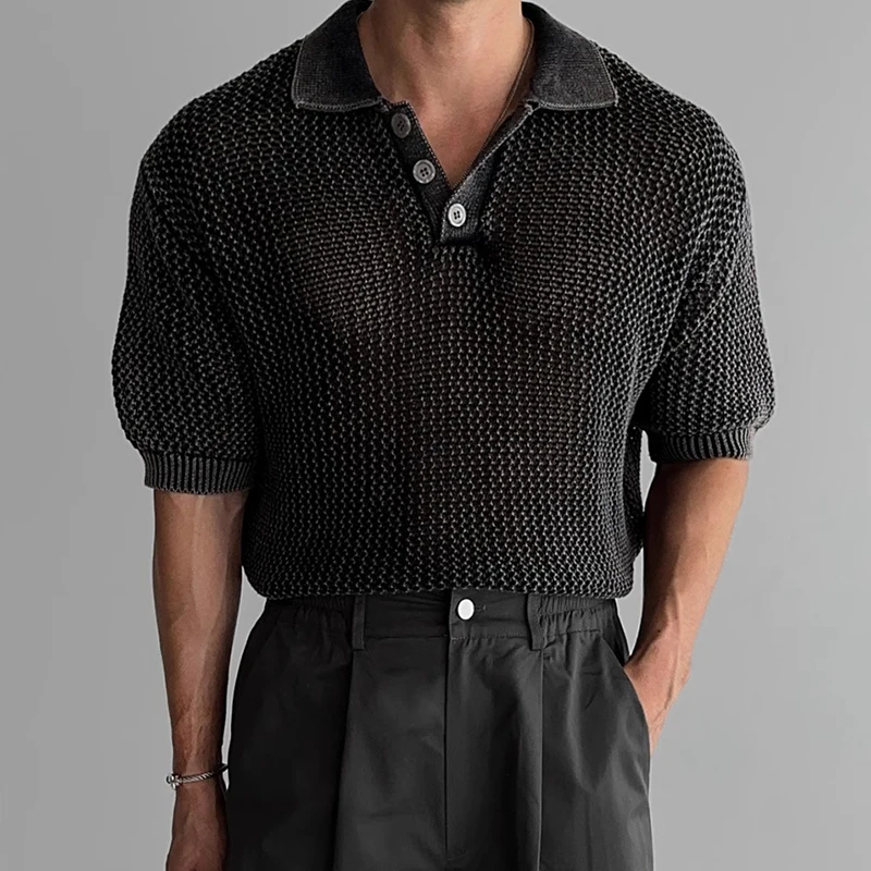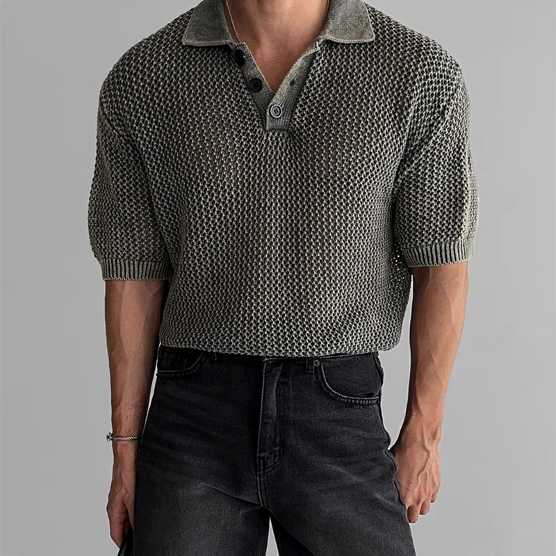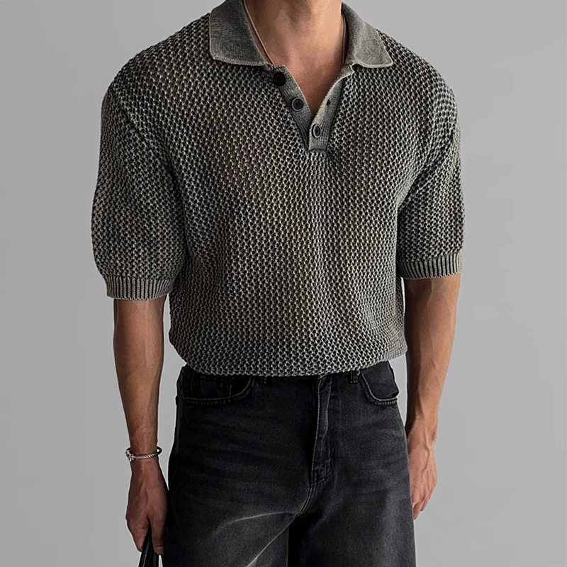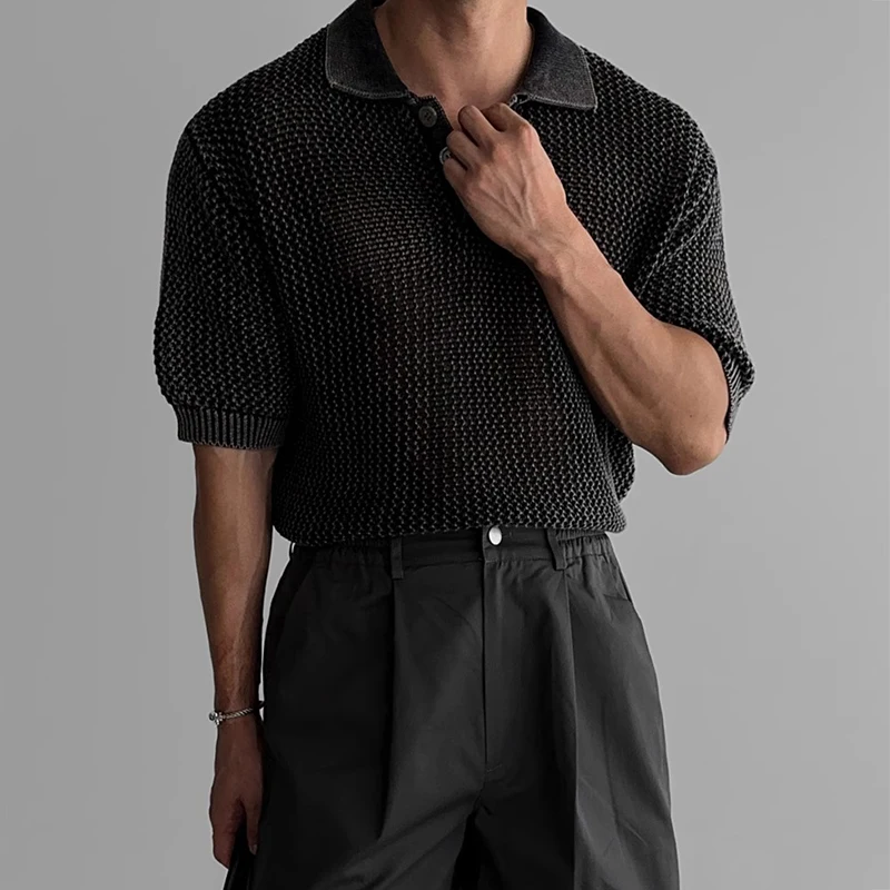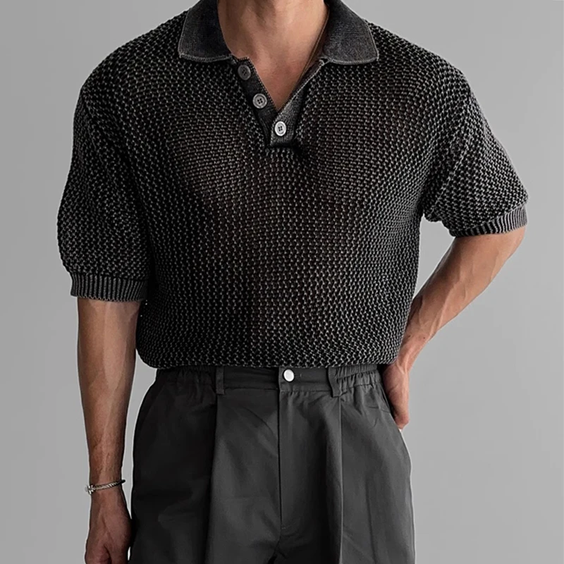 Streetwear Fashion Knit Mesh Polo Shirts For Men Summer Short Sleeve Button Hollow Out Mesh Tops Mens Stylish Short Sleeve Polos