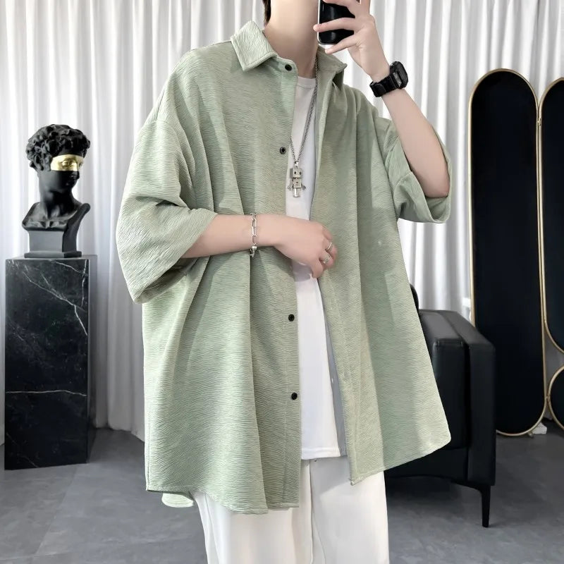 Summer Cool Men Short-sleeved Shirt Solid Color Fashion Plicated Casual Loose Button Shirt Male Clothing Tops