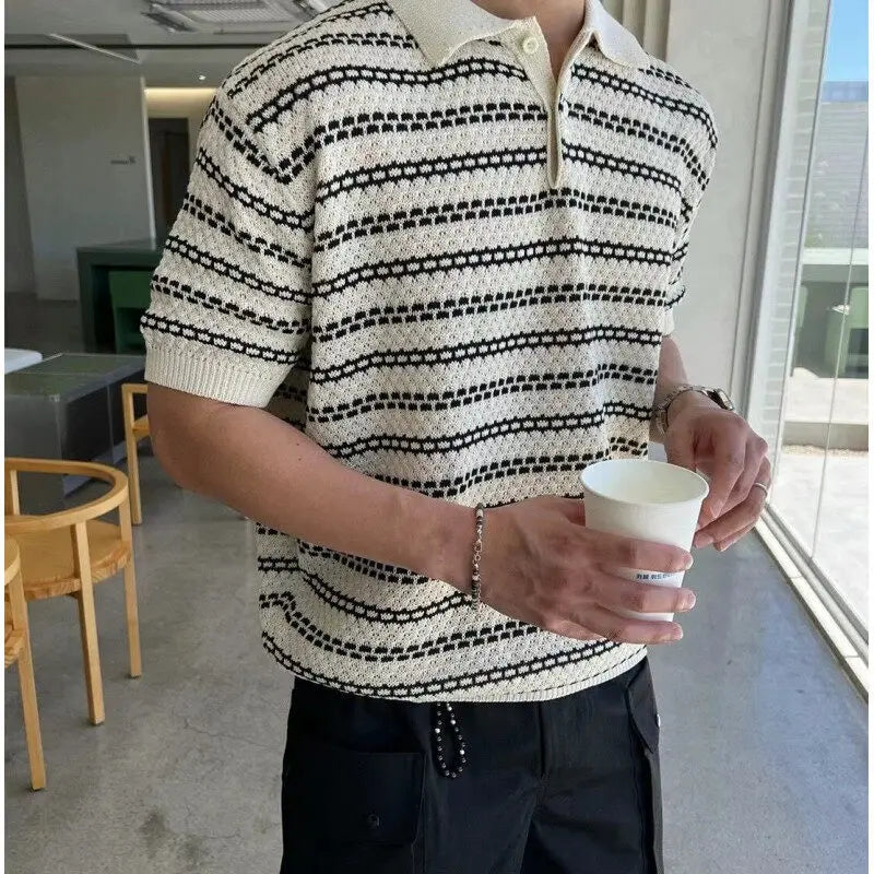 Summer Lapel Short Sleeved T-shirt Men Slim Fit Casual Striped T Shirt Men Streetwear Korean Knitted T Shirt Mens Polo Shirt