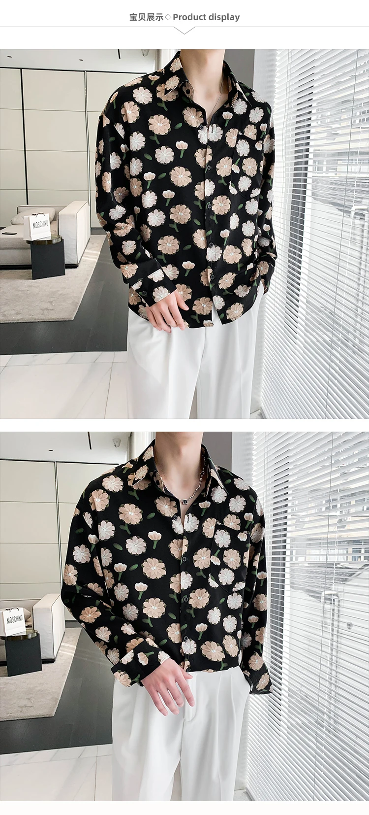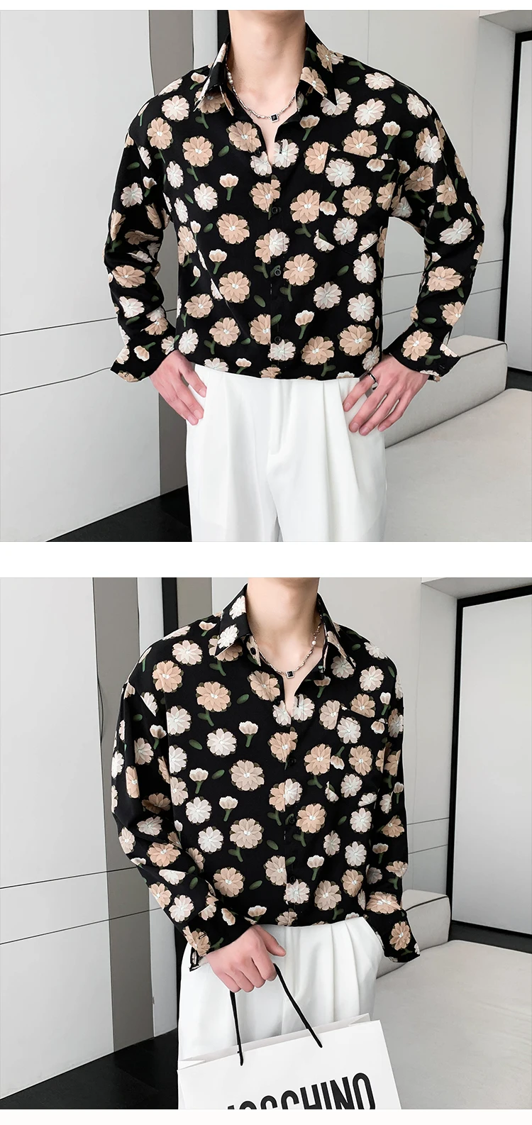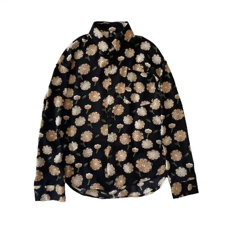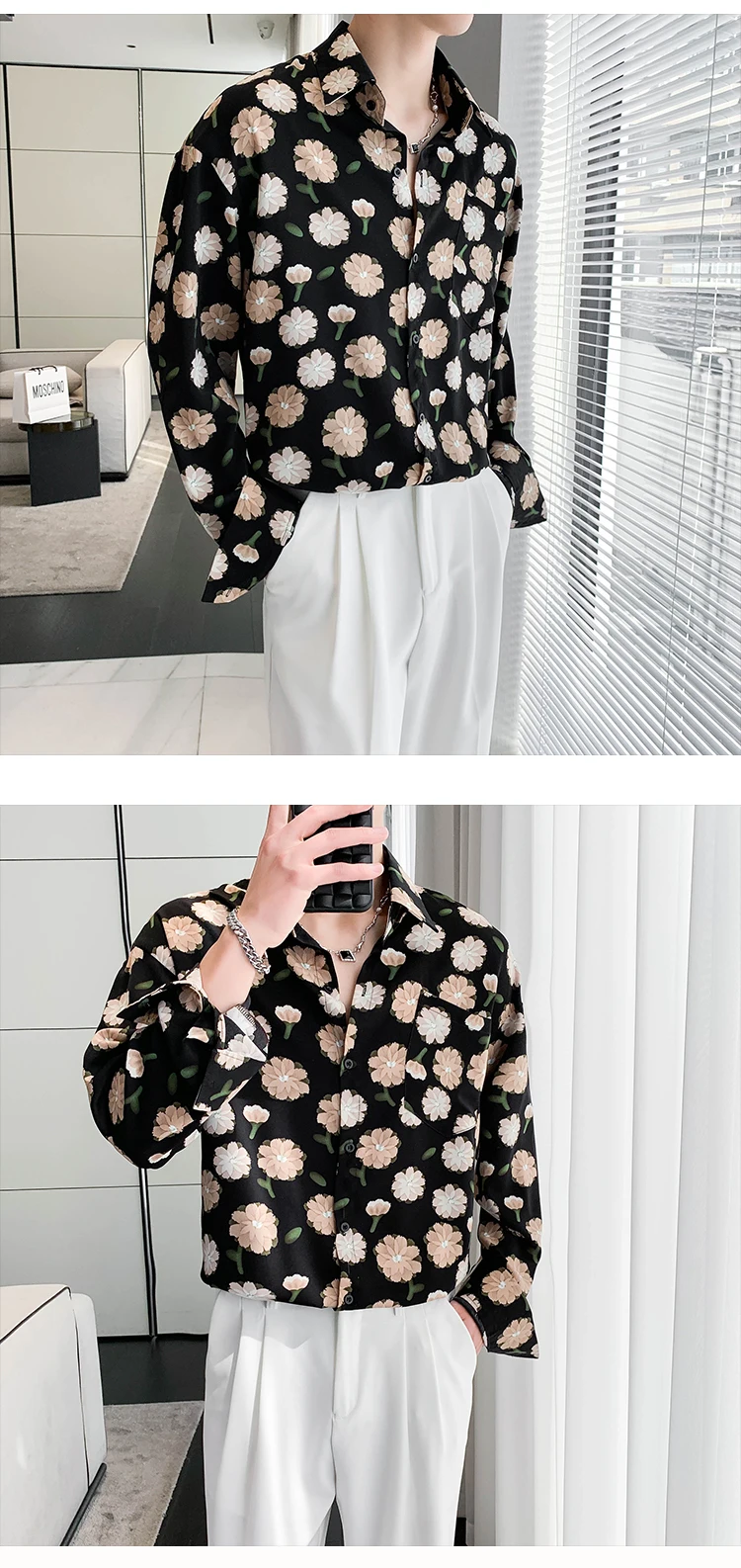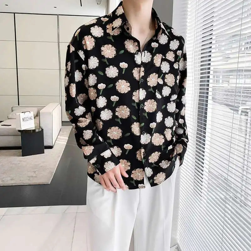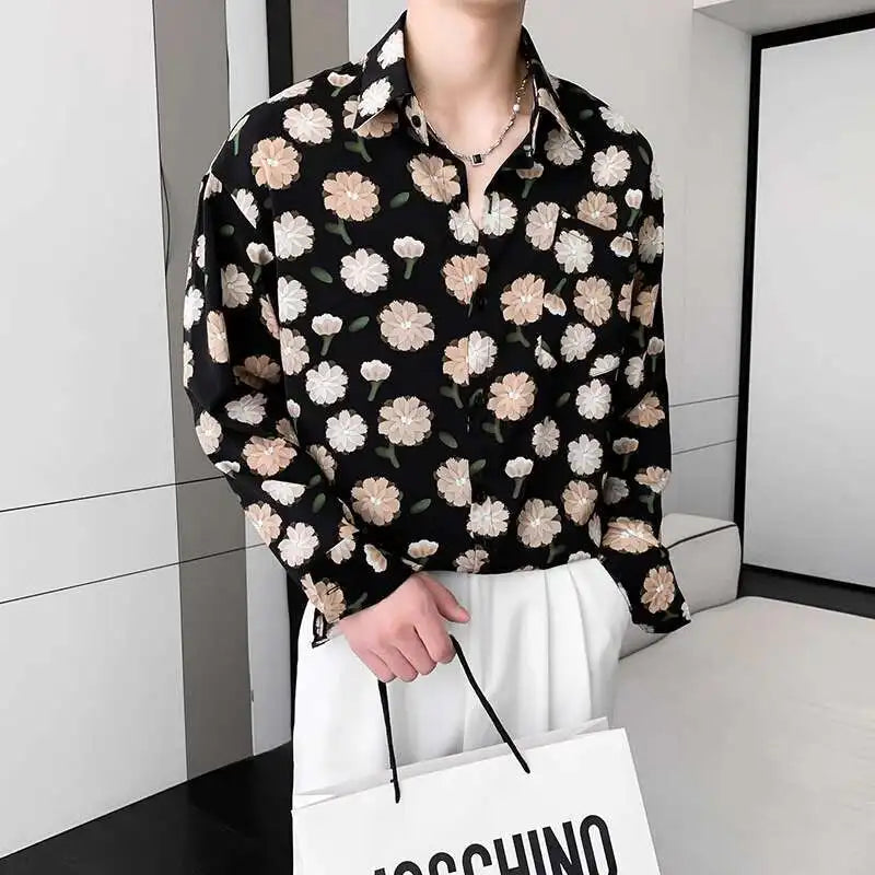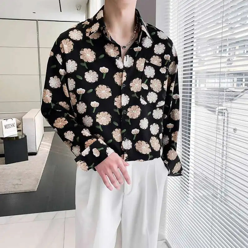 Summer Long Sleeved Shirt Men Fashion Society Mens Dress Shirt Korean Ice Silk Casual Shirt Mens Floral Shirts M-2XL