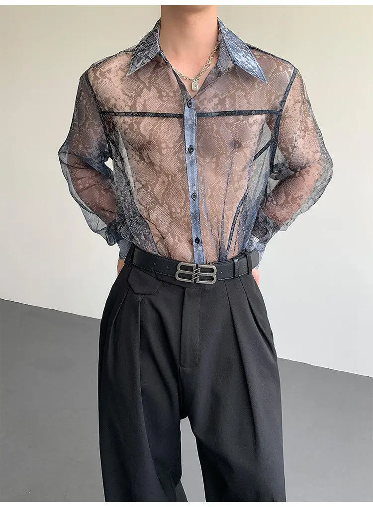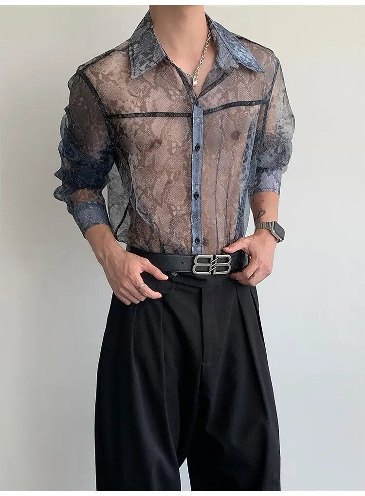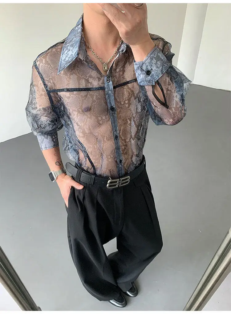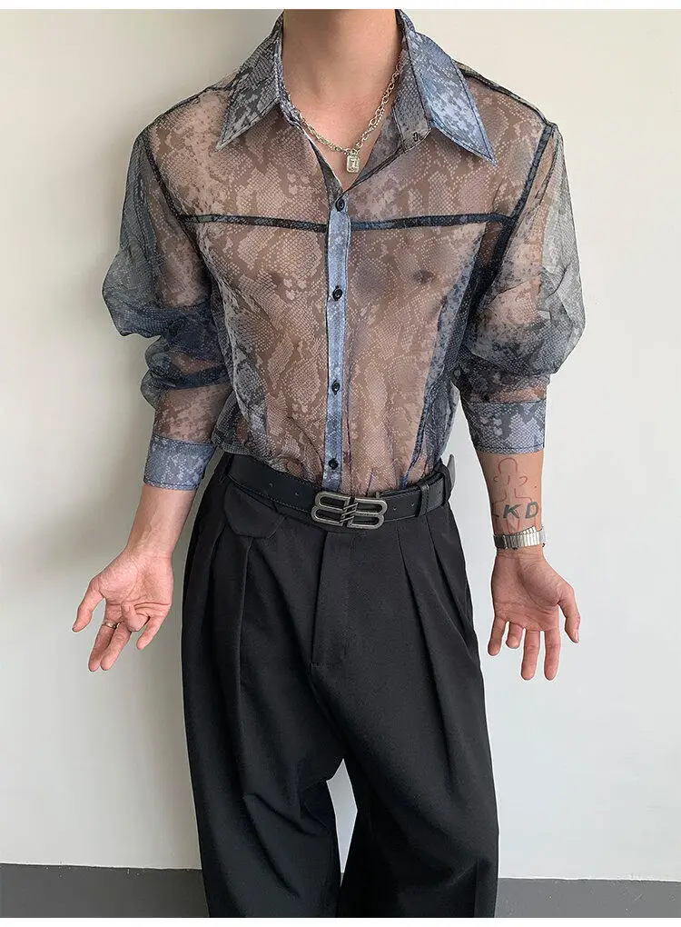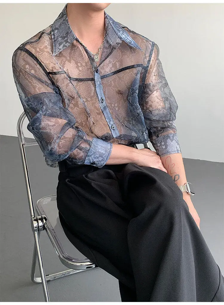 Summer Long Sleeved Shirt Men Fashion Society Mens Dress Shirt Korean Loose Thin Casual Shirt Mens Transparent Shirts M-2XL