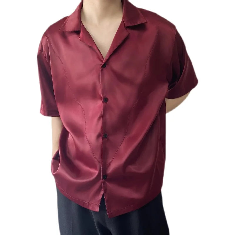 Summer Men's Stylish Shirt Cuban collar Satin Silk Wine Red Dress Shirts Short Sleeve Tops Wedding Prom Party Holiday Blouse Man