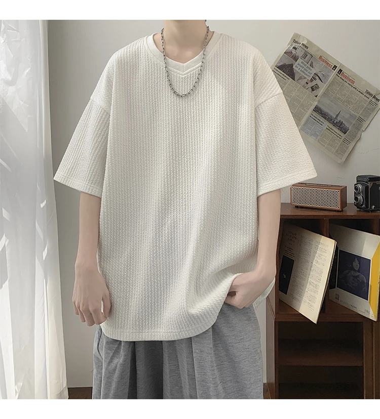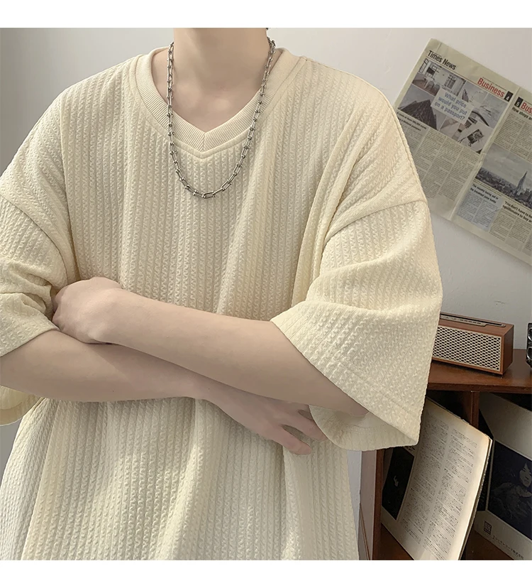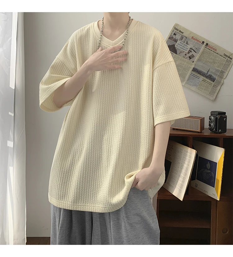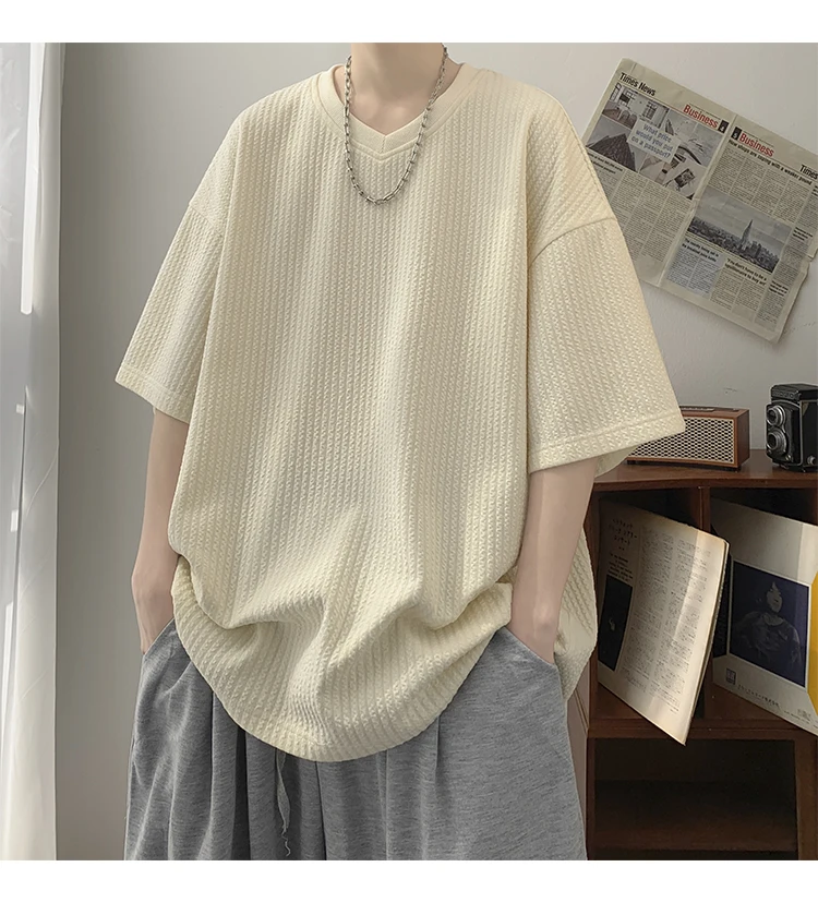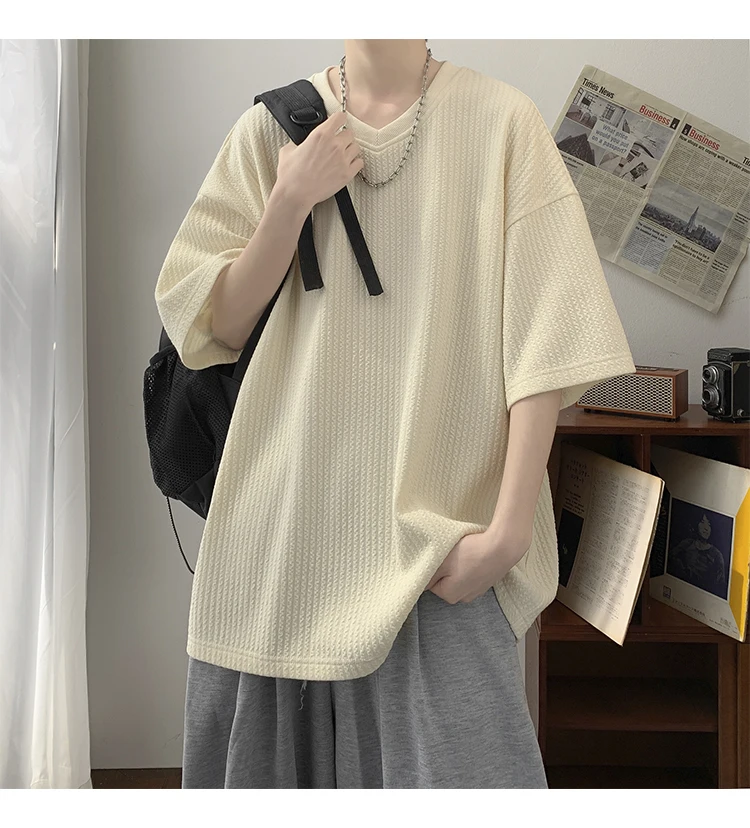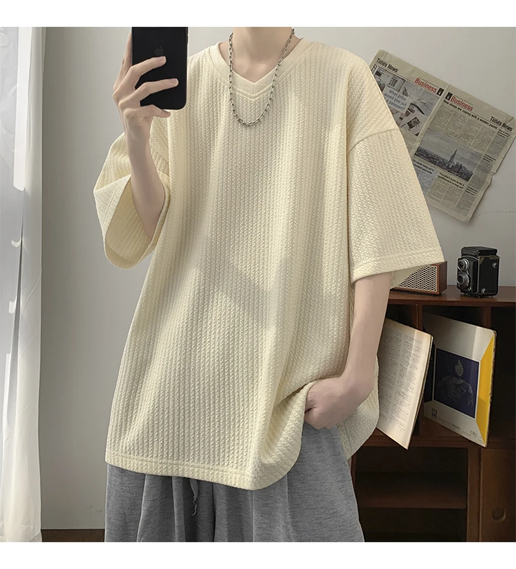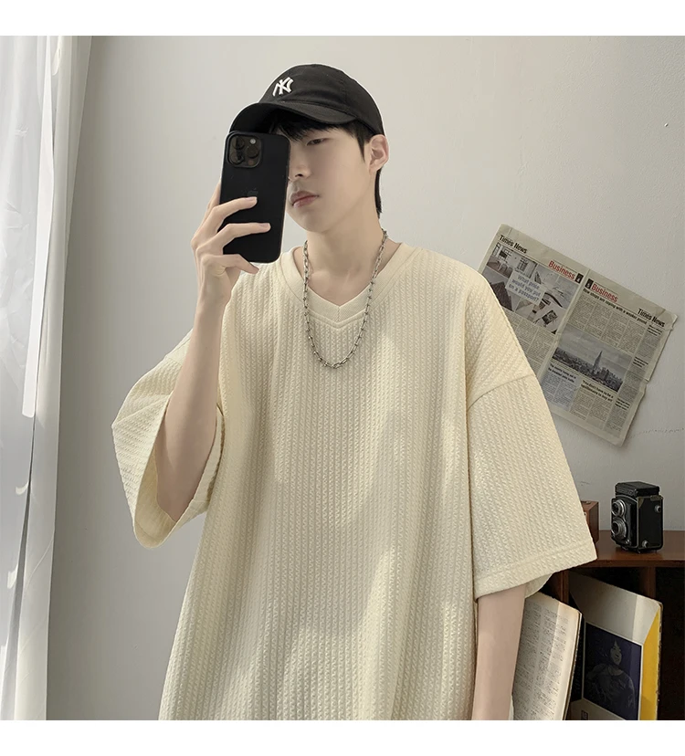 Summer Men's Texture T Shirt Leisure Half Sleeve V Neck Solid Color Loose Basic TShirt Popular Streetwear White/Black/Apricot