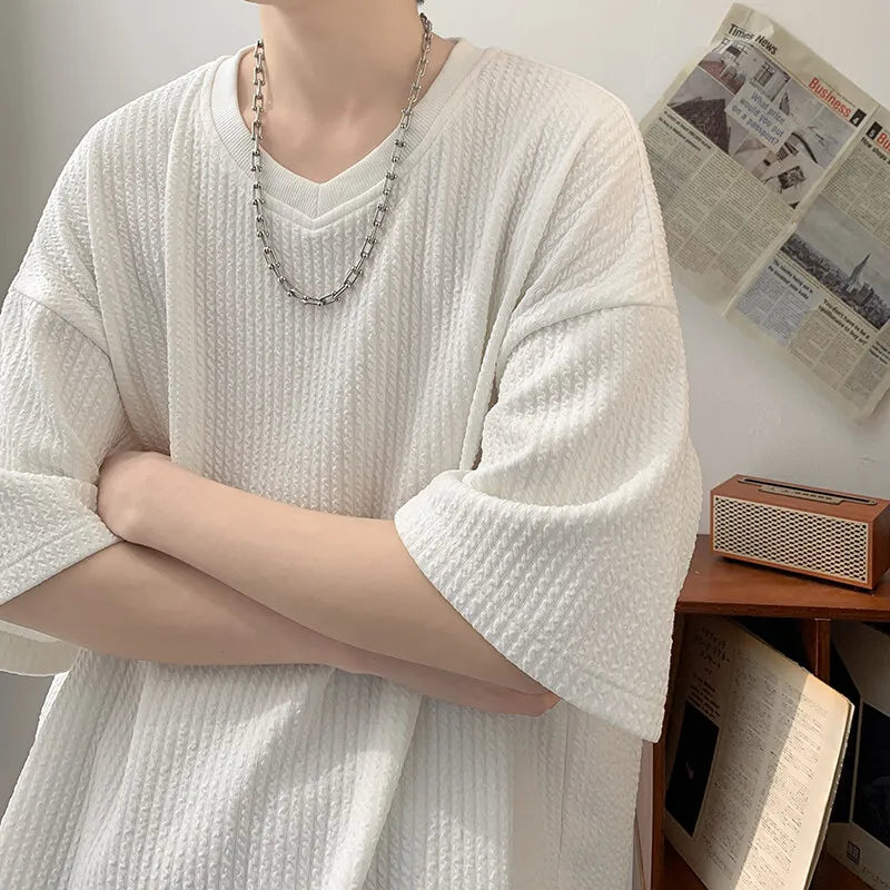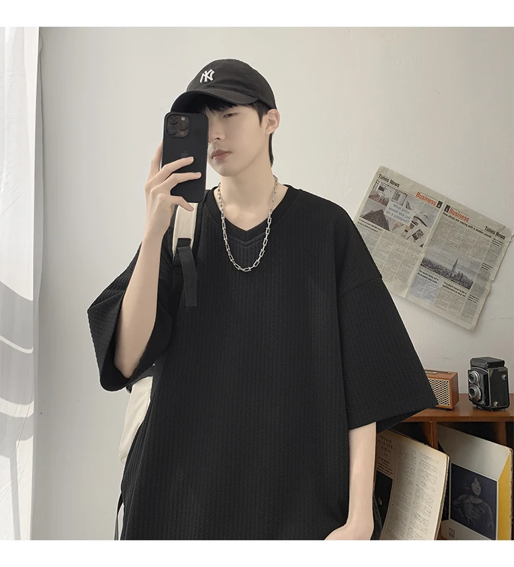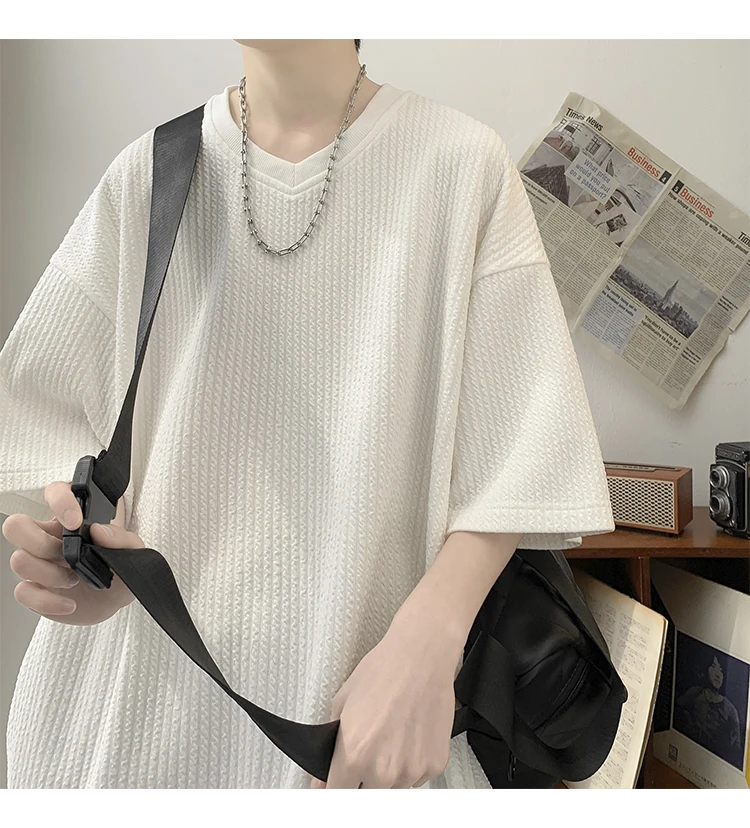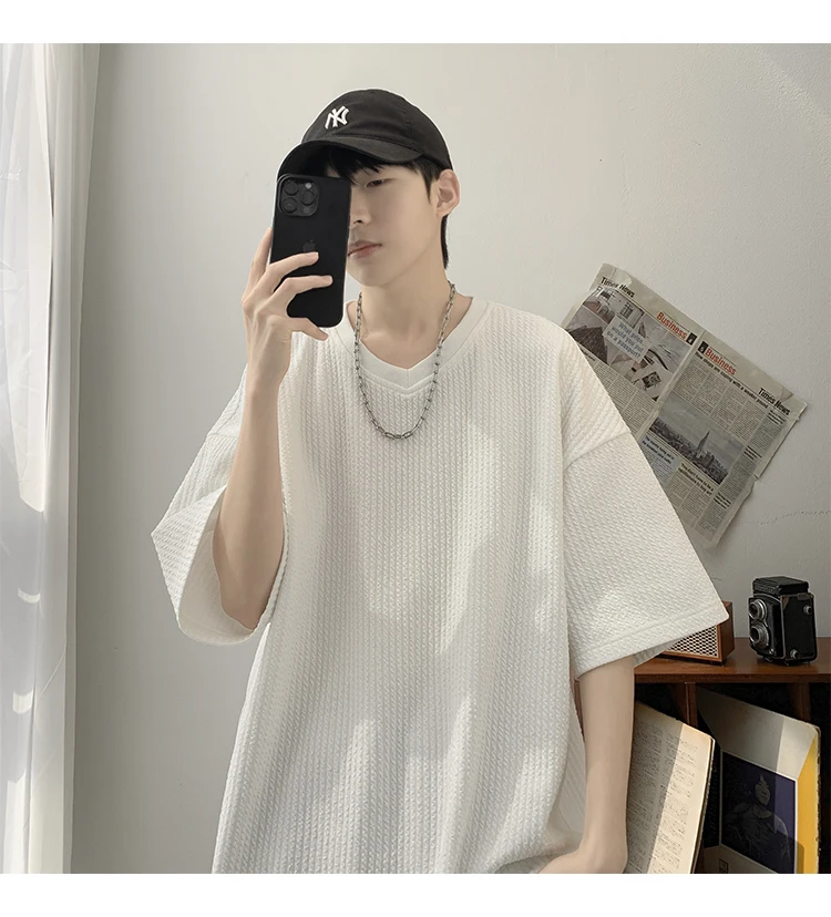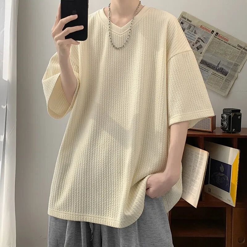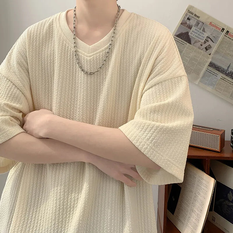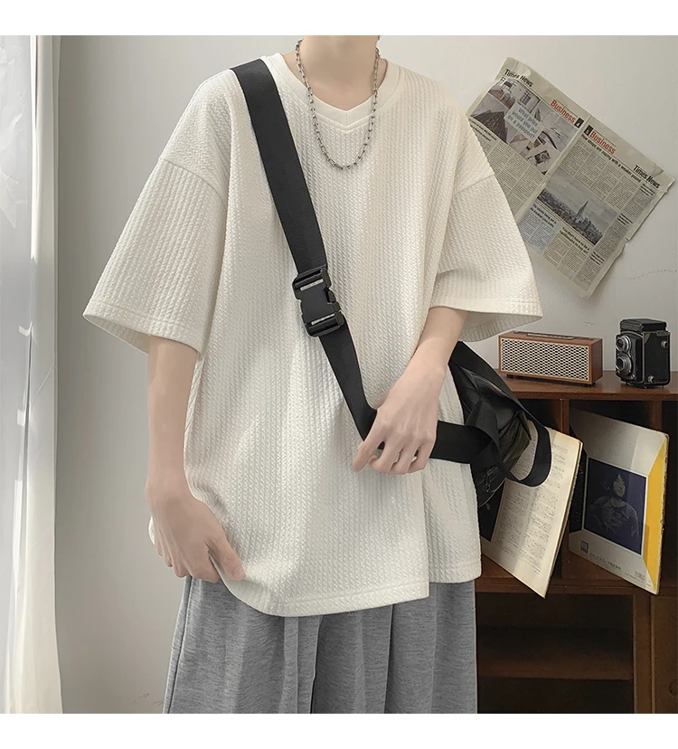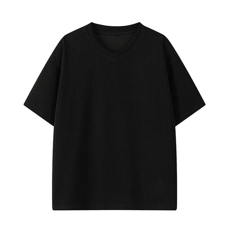 Summer Men's Texture T Shirt Leisure Half Sleeve V Neck Solid Color Loose Basic TShirt Popular Streetwear White/Black/Apricot