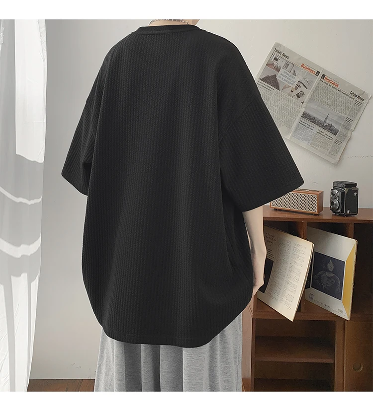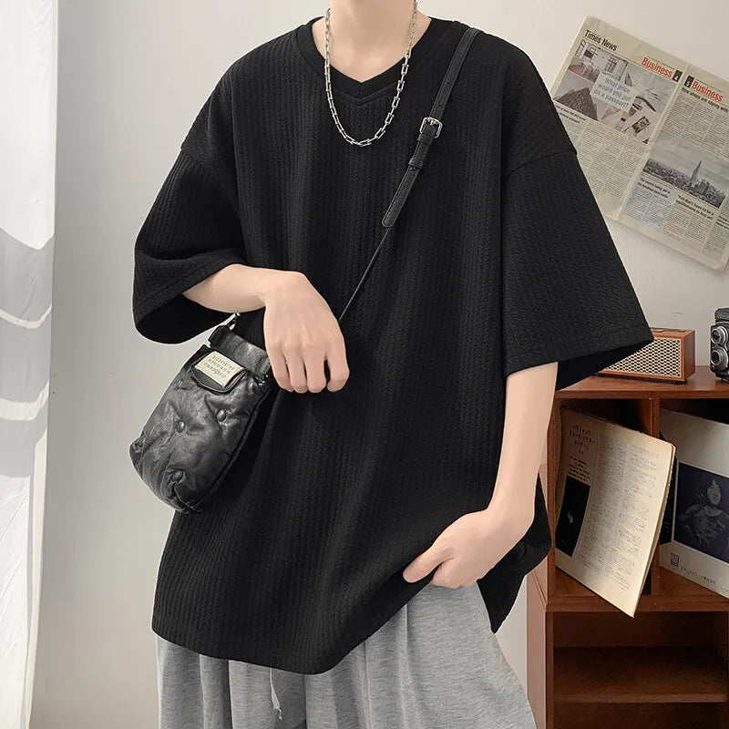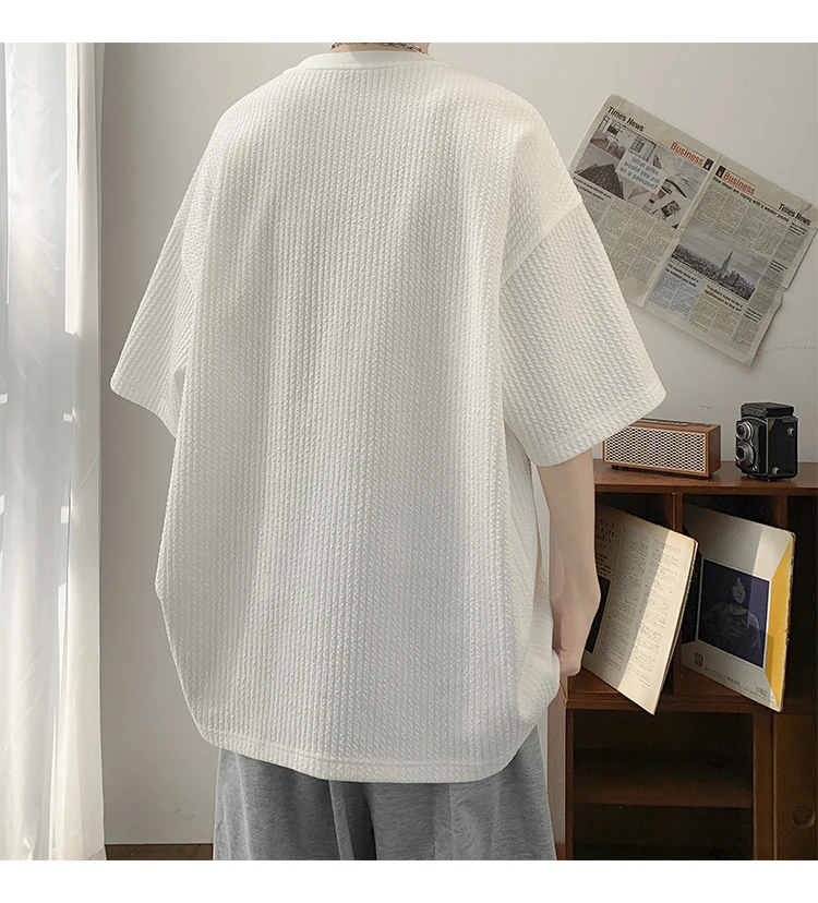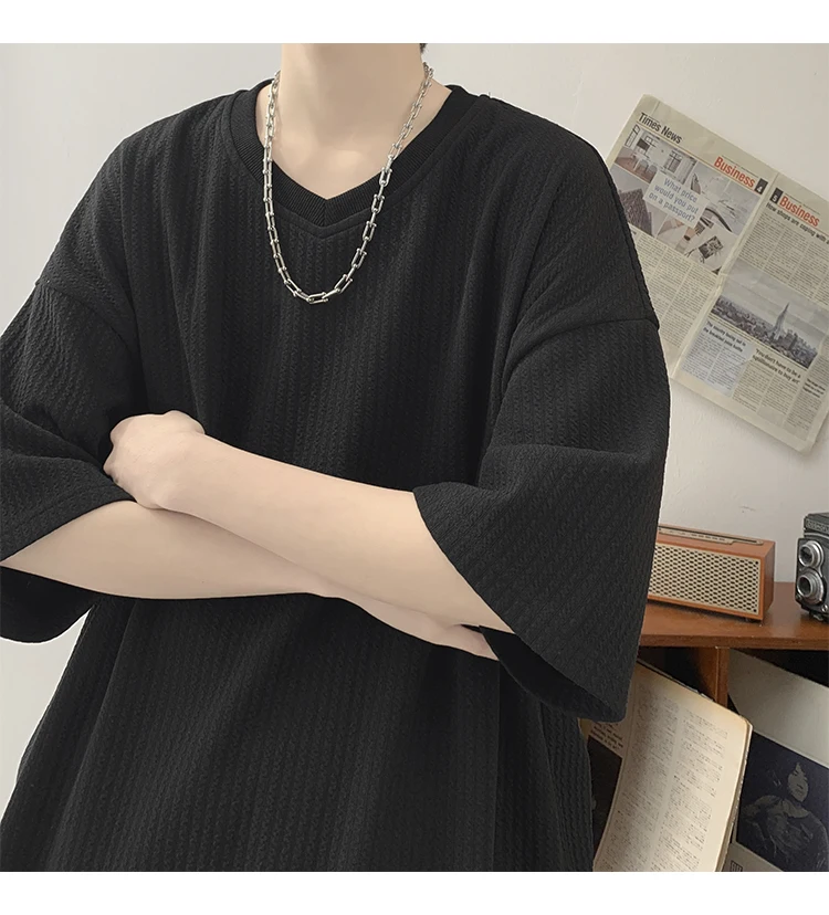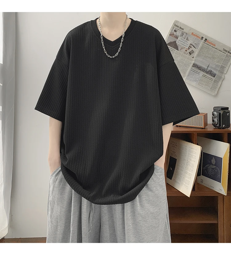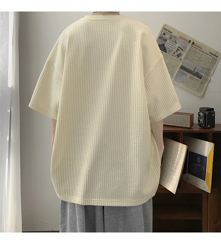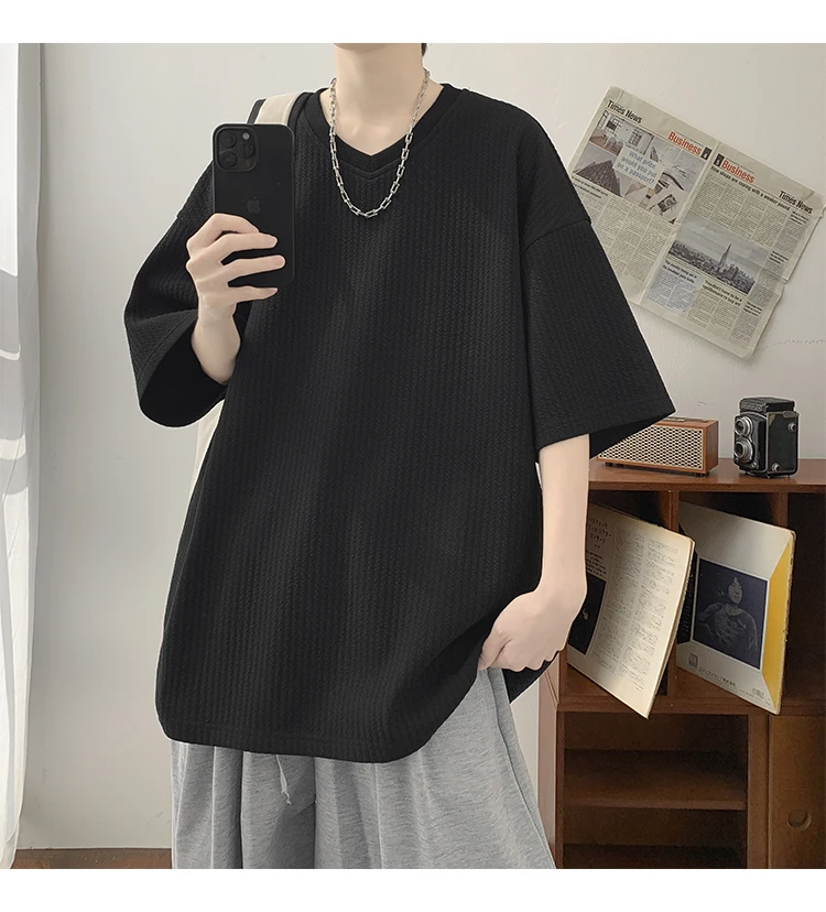 Summer Men's Texture T Shirt Leisure Half Sleeve V Neck Solid Color Loose Basic TShirt Popular Streetwear White/Black/Apricot