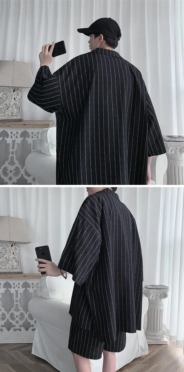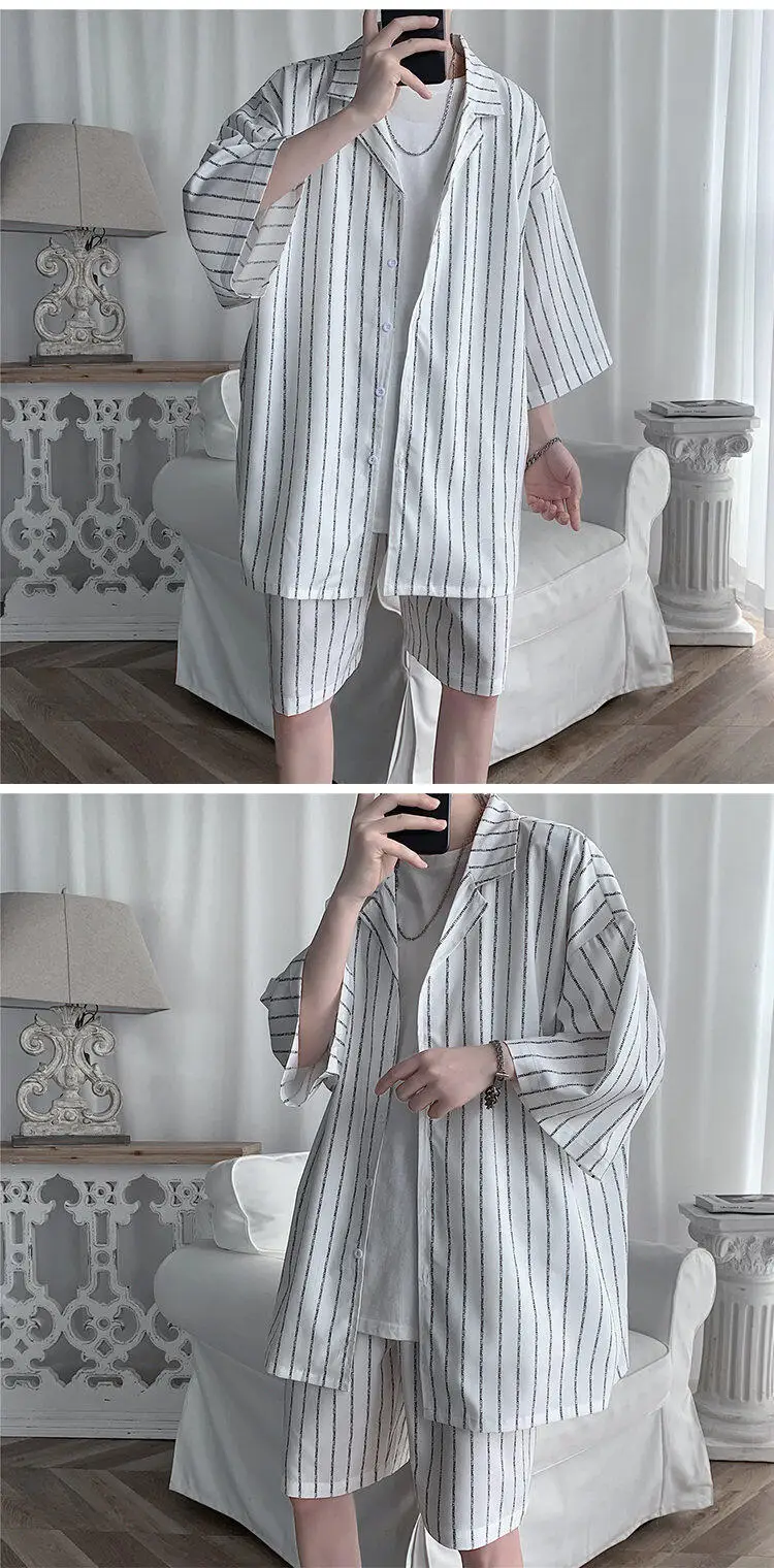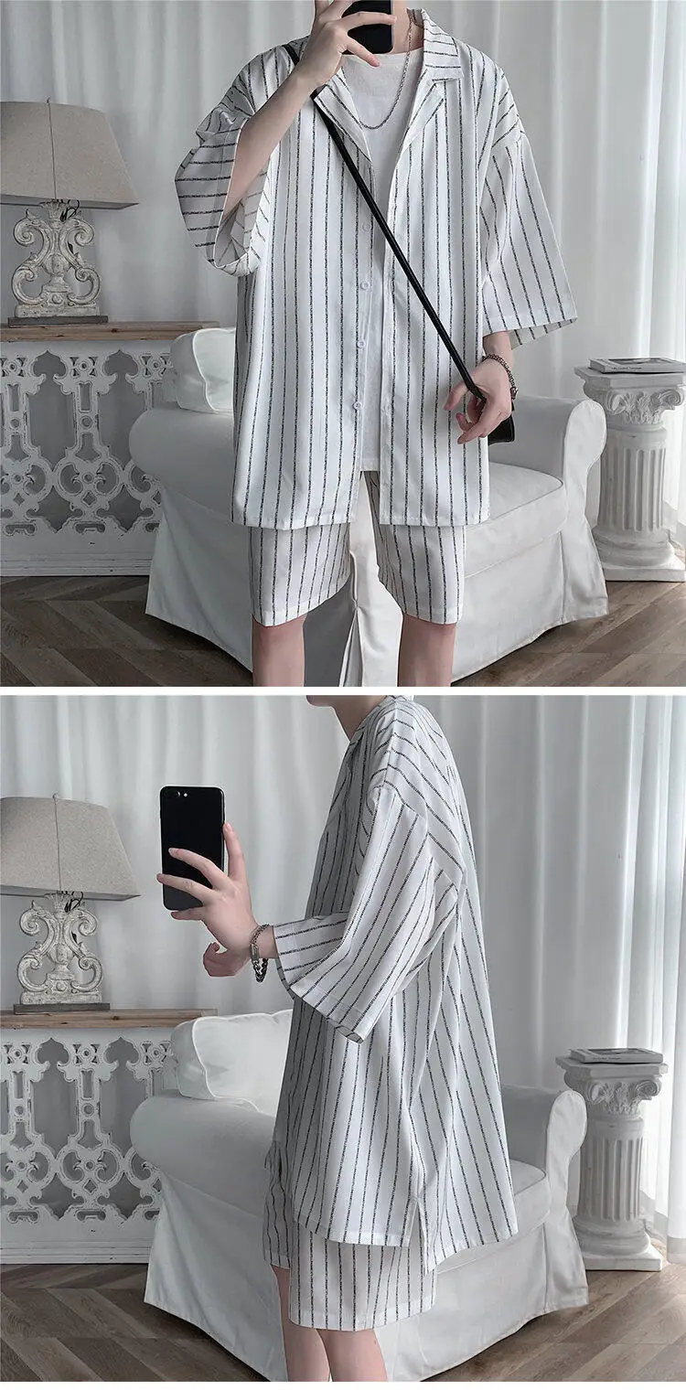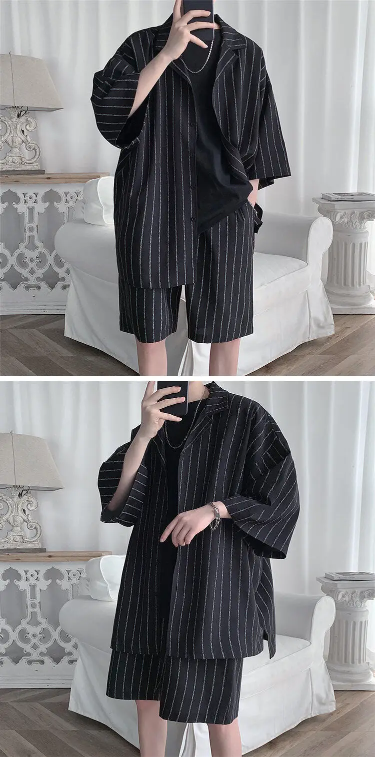 Summer Shirt Set Men Oversized Fashion Society Mens Black Formal Sets Korean Loose Casual White Striped Set Mens Plus Size 5XL