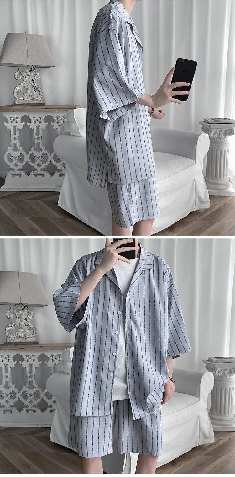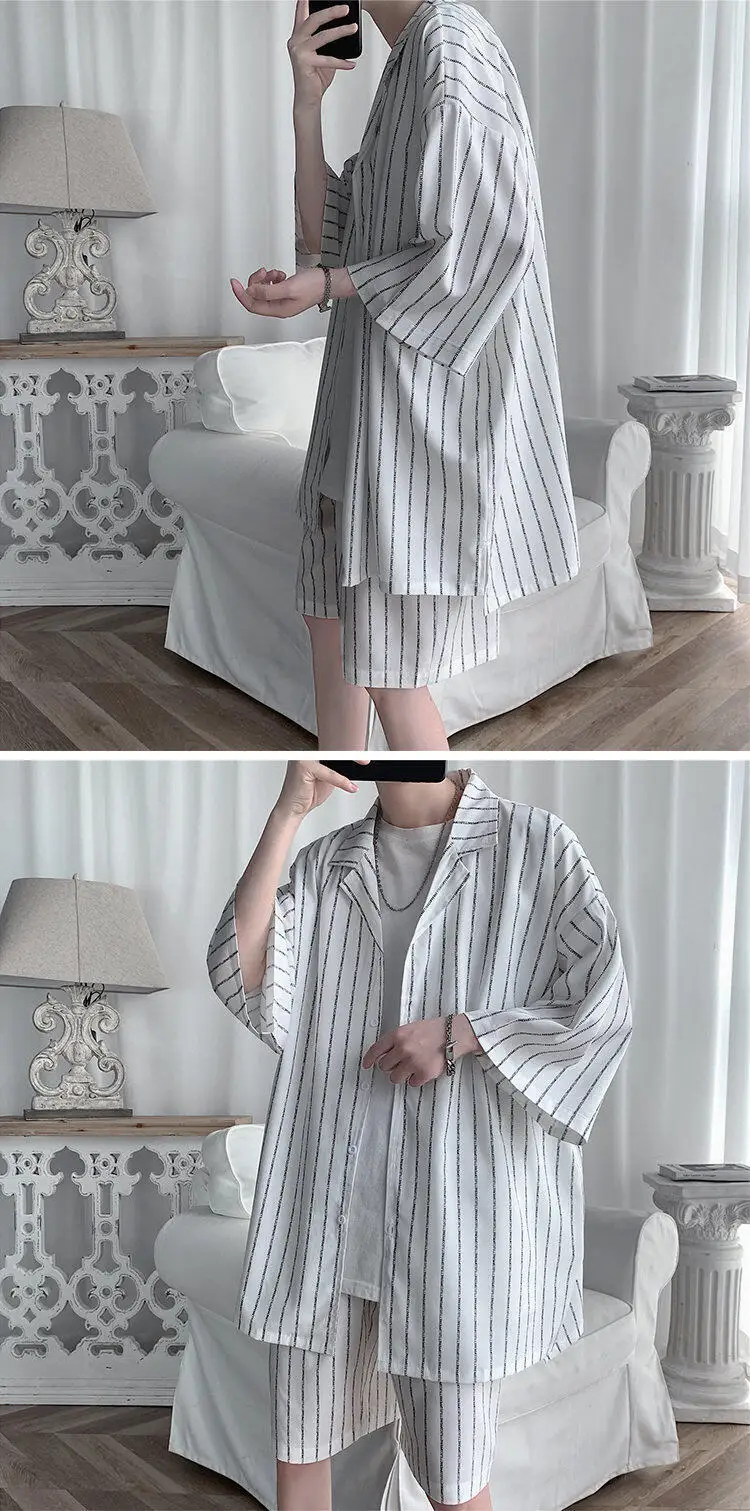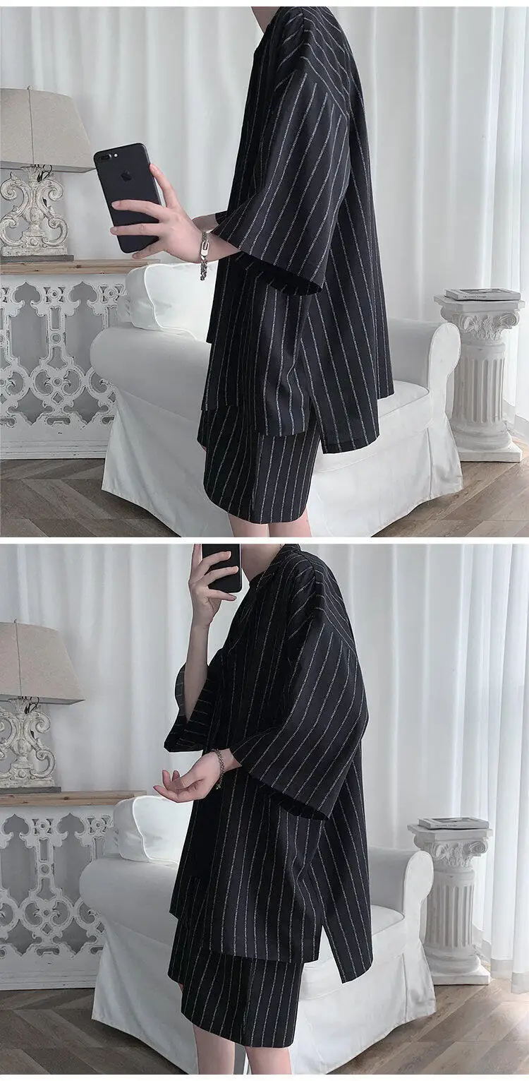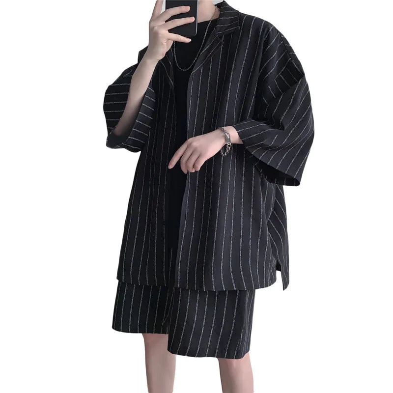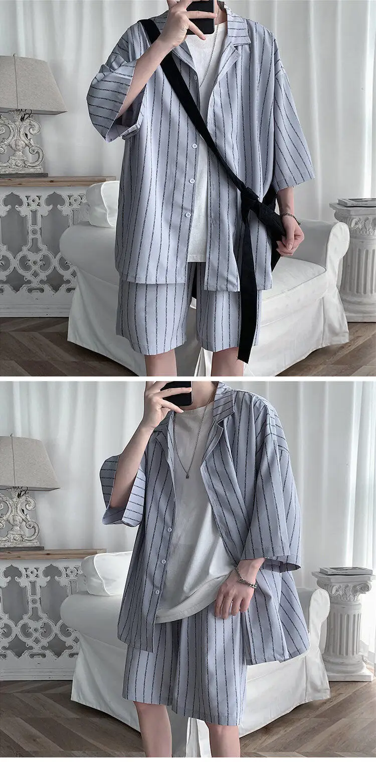 Summer Shirt Set Men Oversized Fashion Society Mens Black Formal Sets Korean Loose Casual White Striped Set Mens Plus Size 5XL